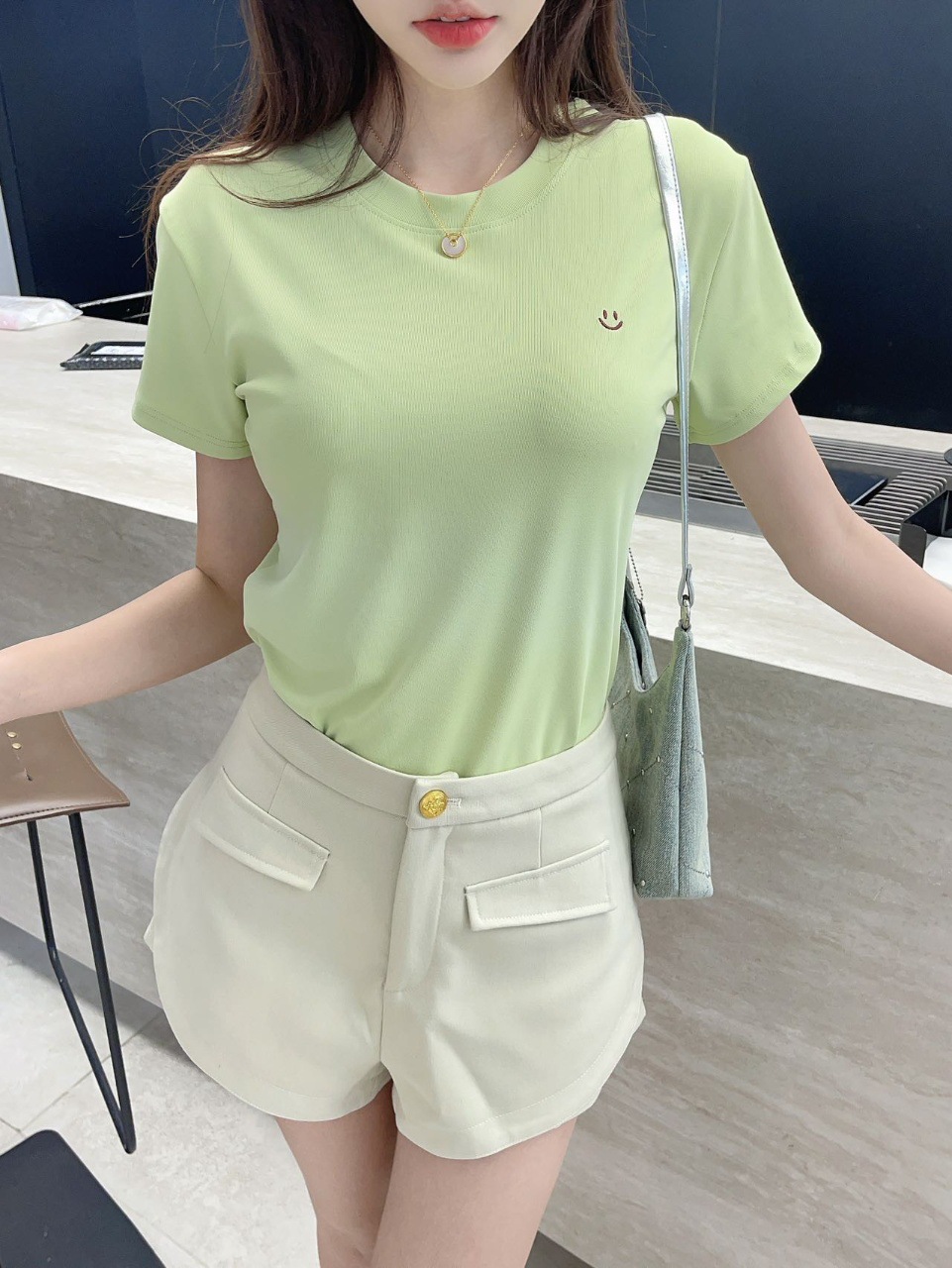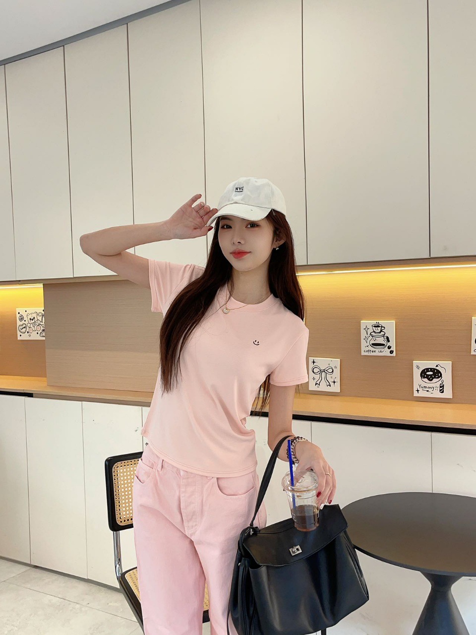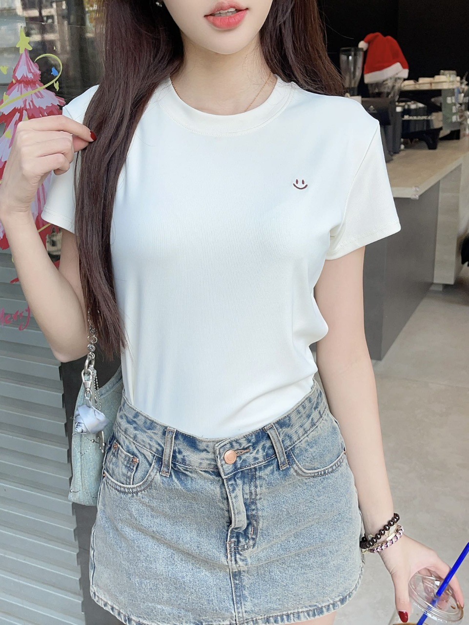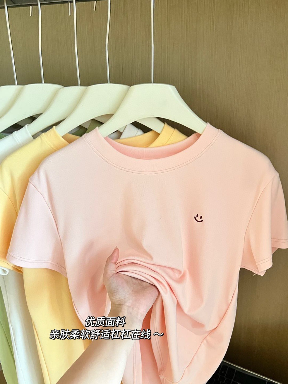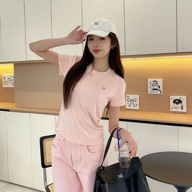 스마일리 크루 넥 사랑스러운 여름 반팔 티셔츠 여자 올 매치 숄더 탑 반소매 스트레치 슬림 핏 도매 티셔츠스토어 가기