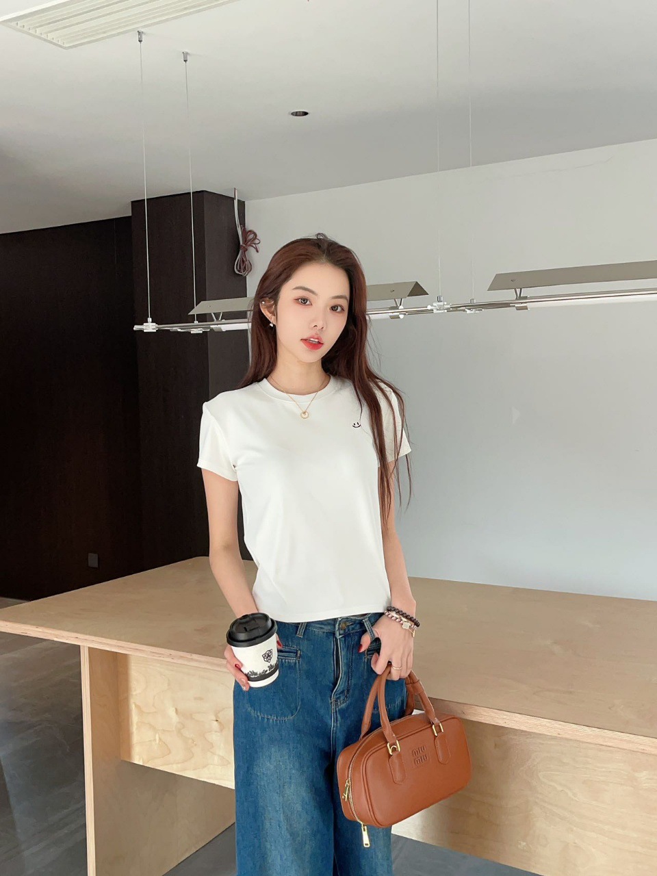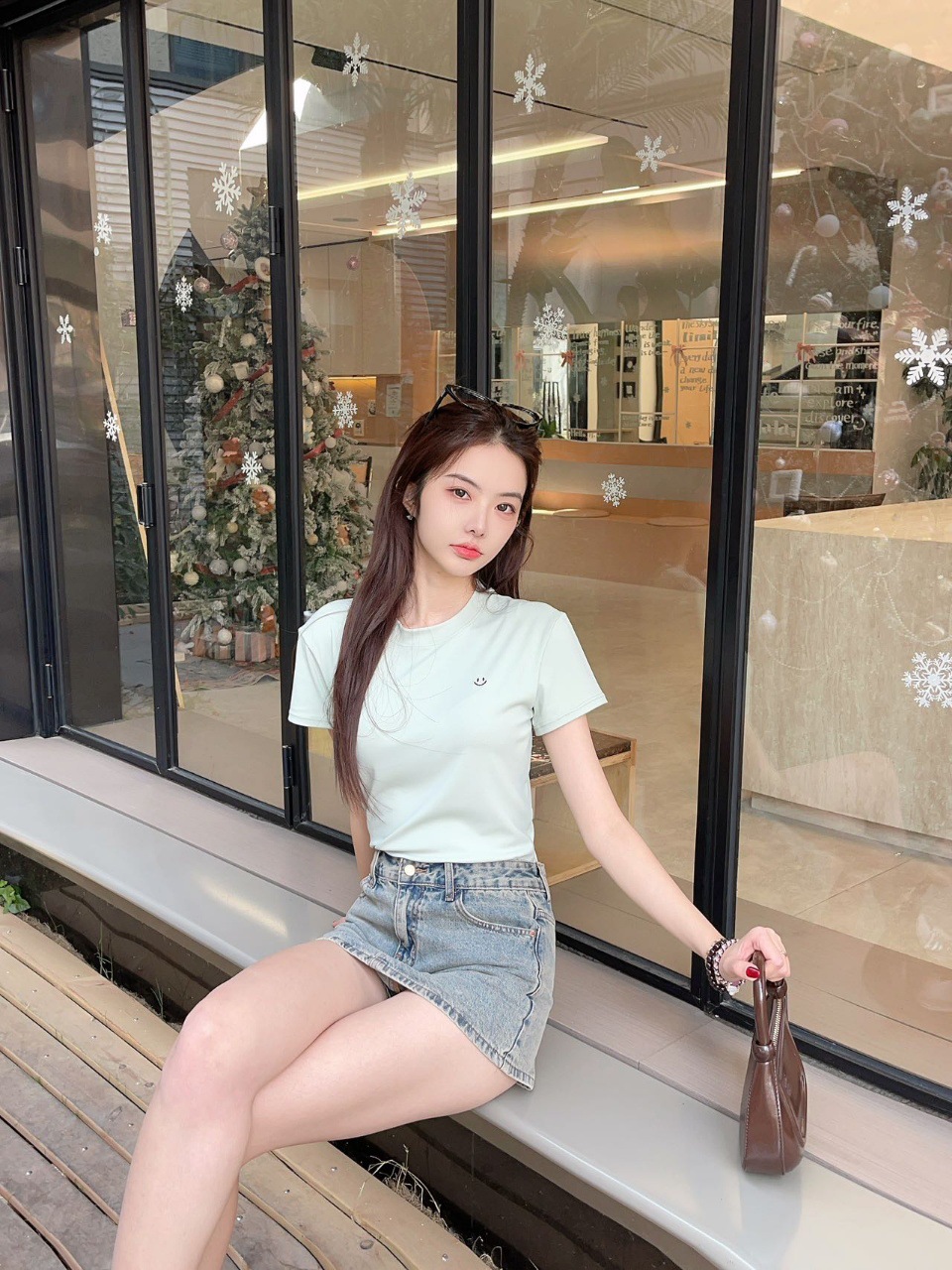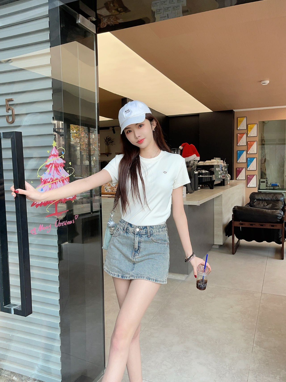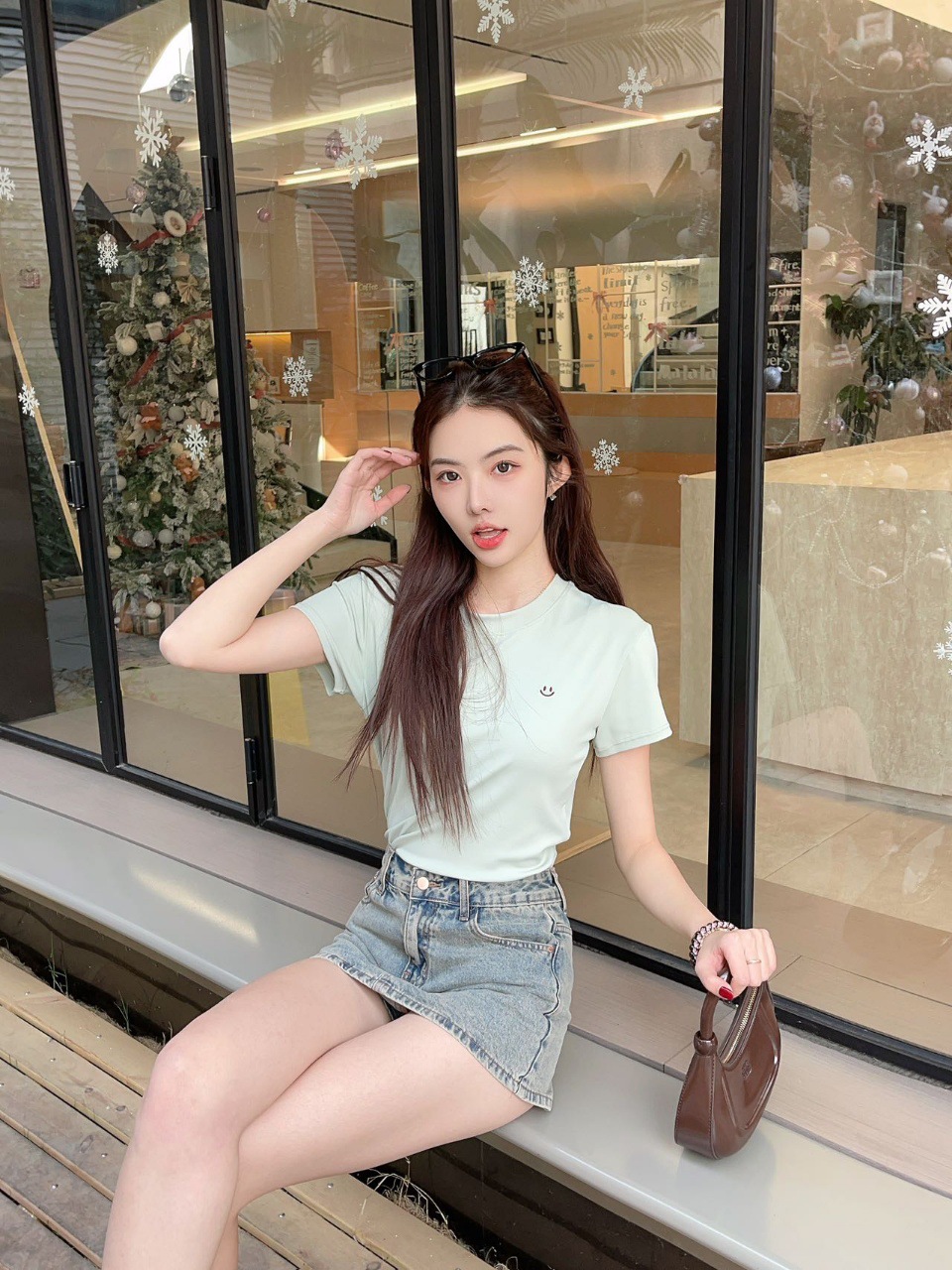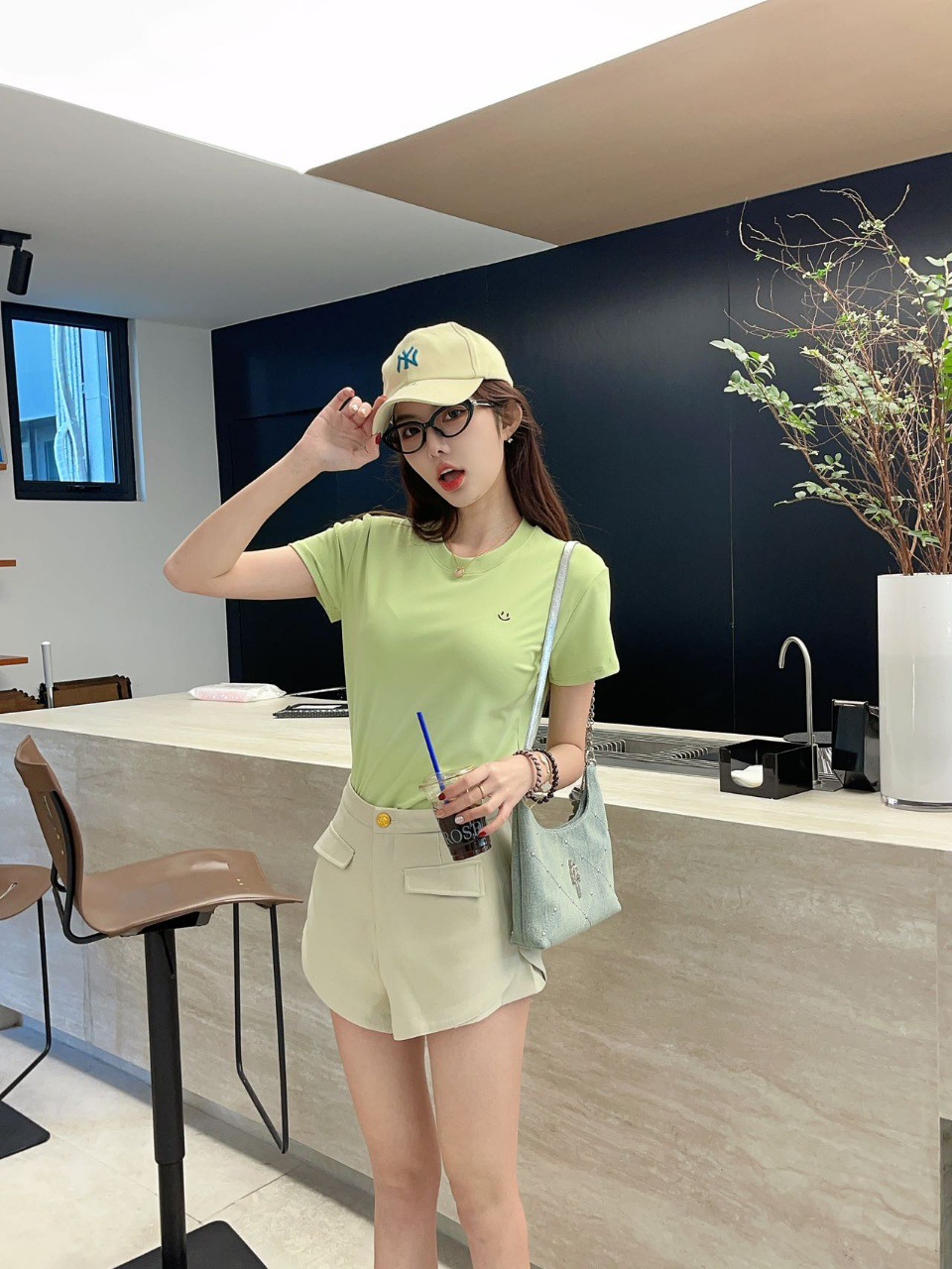 스마일리 크루 넥 사랑스러운 여름 반팔 티셔츠 여자 올 매치 숄더 탑 반소매 스트레치 슬림 핏 도매 티셔츠스토어 가기