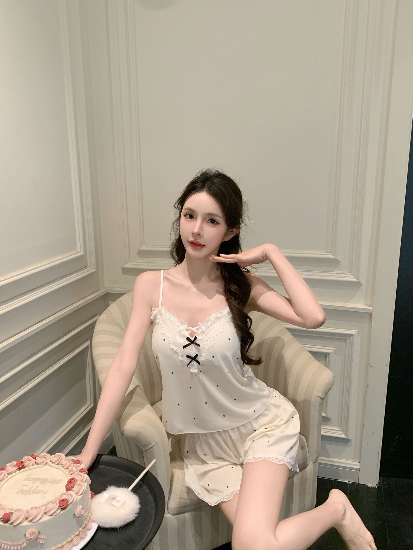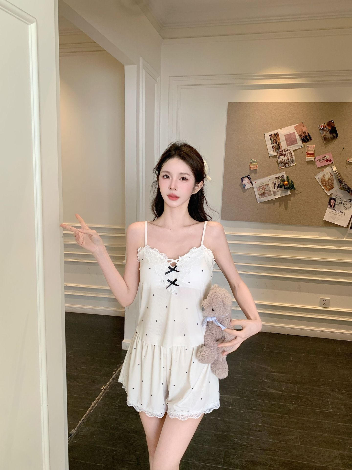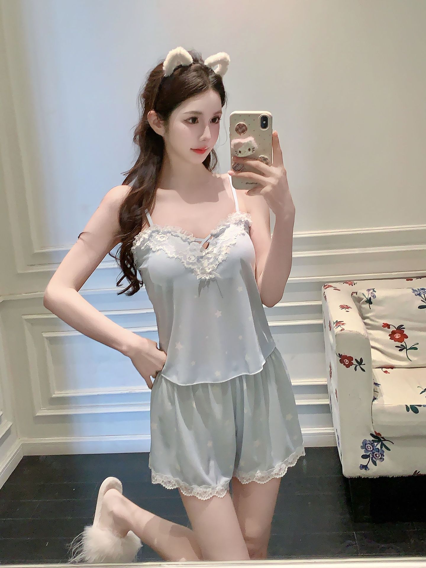 프랑스 잠옷 여성 달콤한 봄과 여름 새로운 섹시한 섹시한 순수 스타일 아이스 실크 홈 옷 세트 슬링 반바지스토어 가기