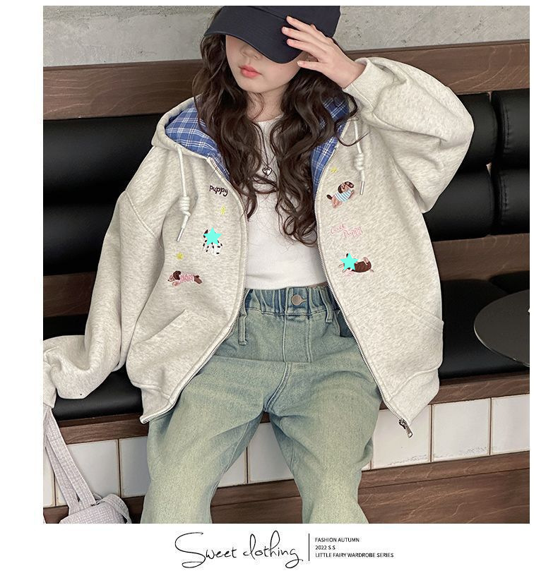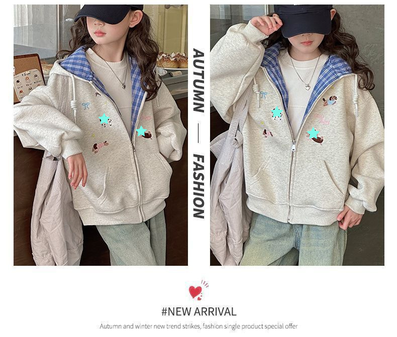 소녀 아기 한국 스타일 유행 카디건 코트 대형 어린이 봄과 가을 새로운 서양 스타일 만화 격자 무늬 후드 탑