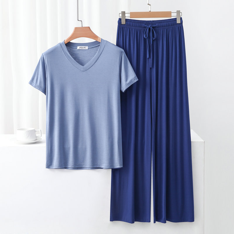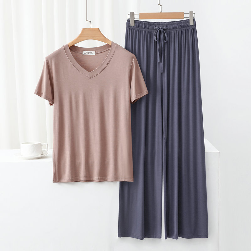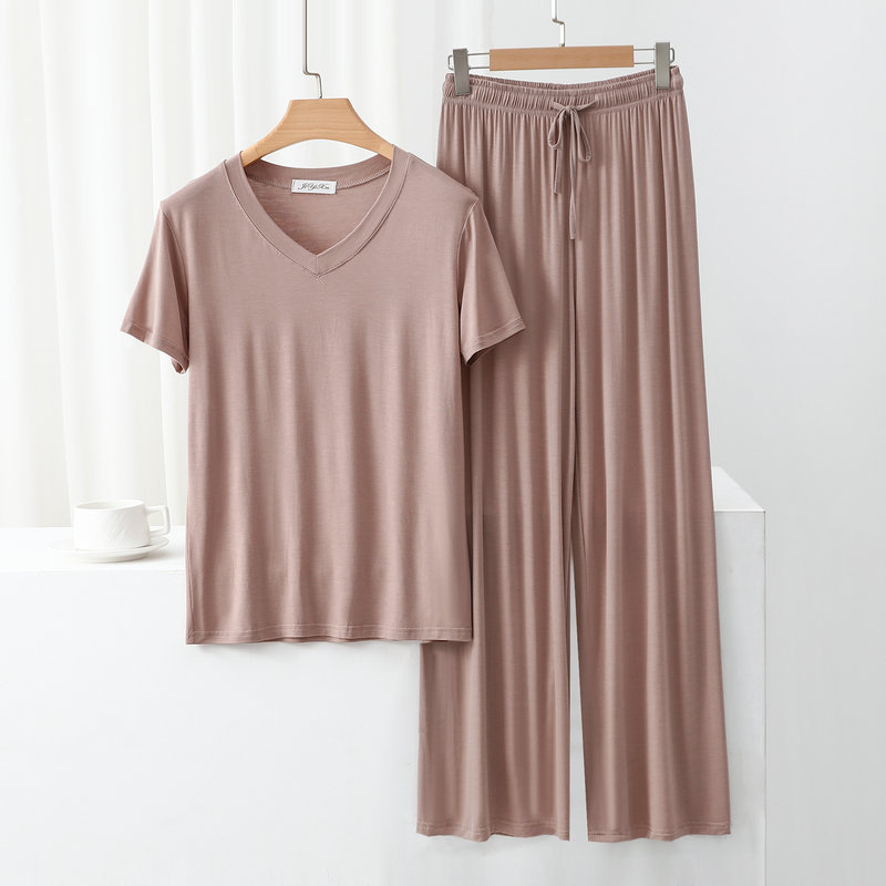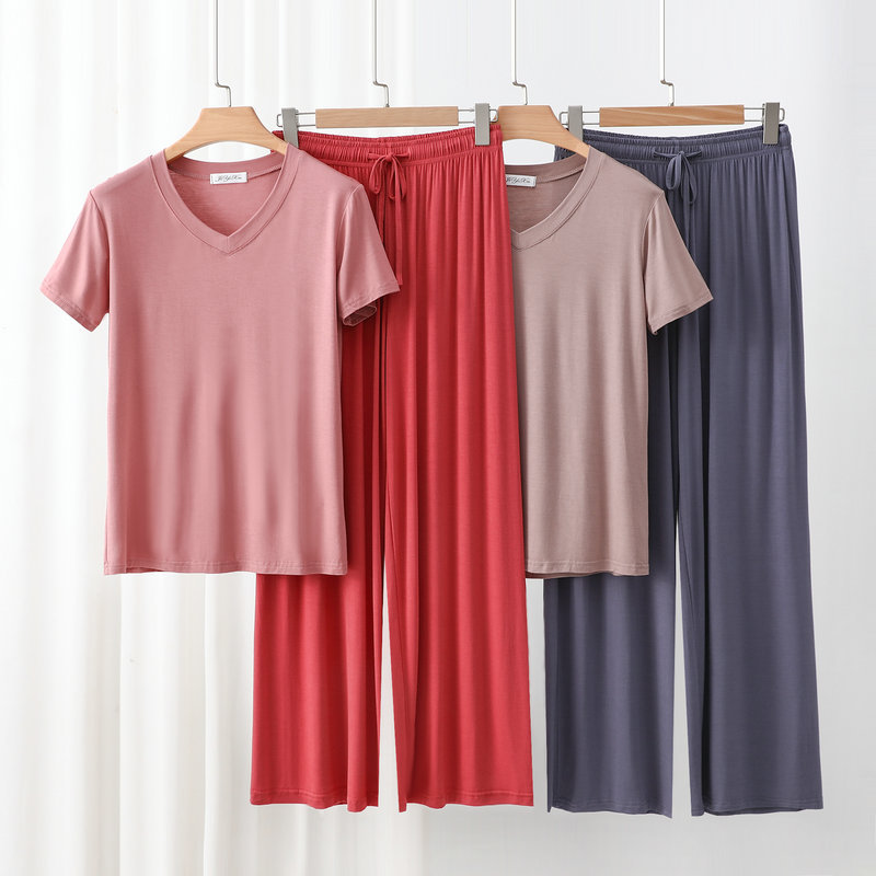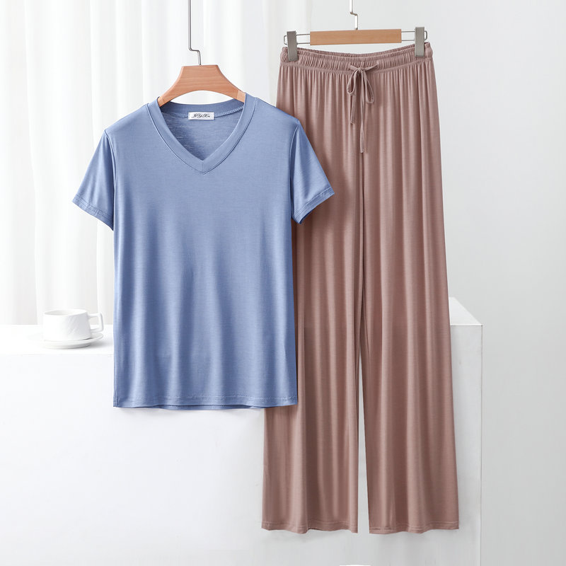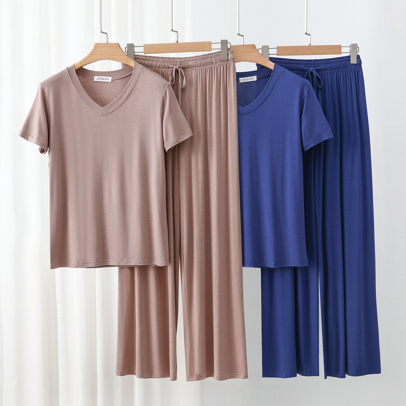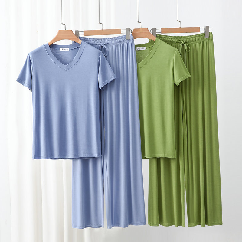 여성용 봄과 여름 V 넥 반팔 얇은 쿨 모달 잠옷 세트 편안한 의상 투피스 세트를 입을 수 있습니다.