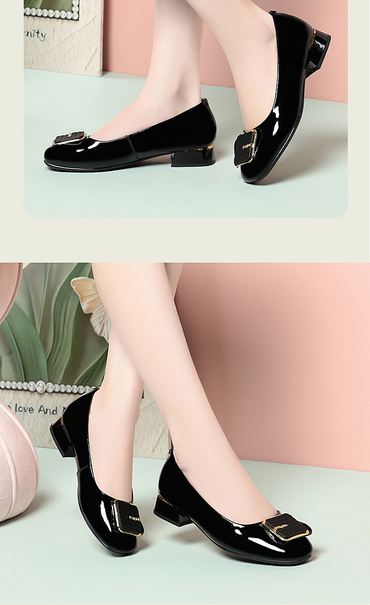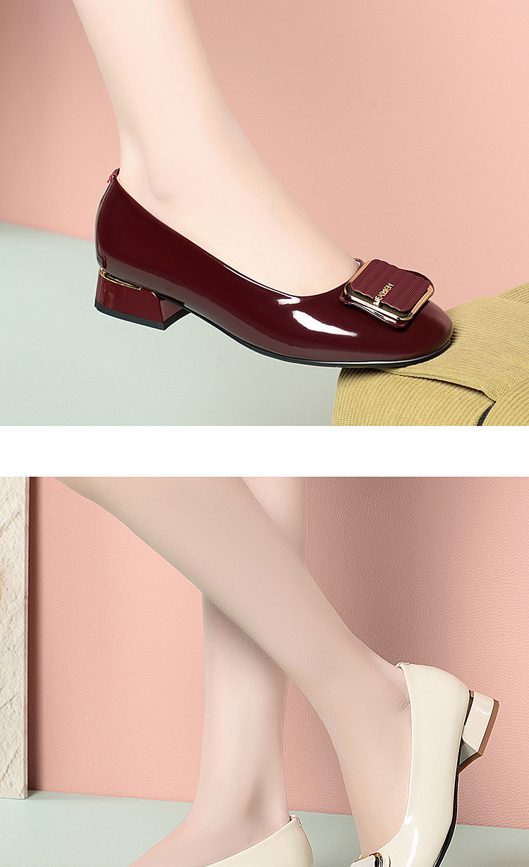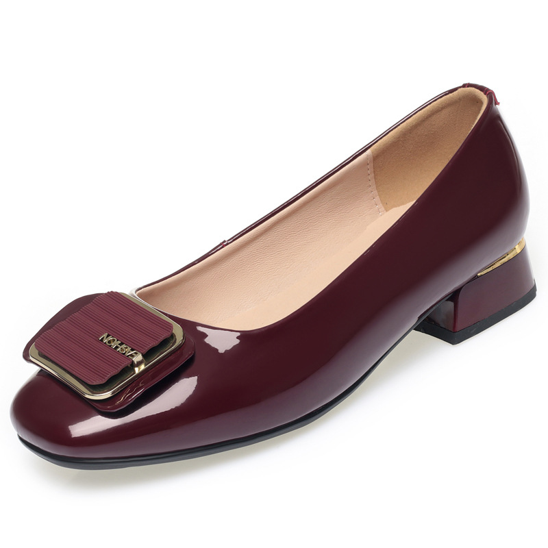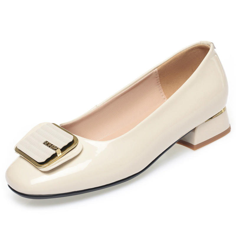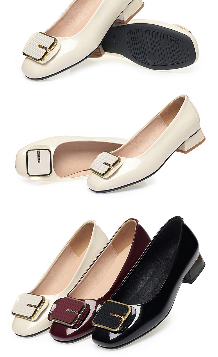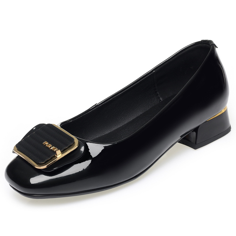봄과 가을 정품 가죽 특허 가죽 싱글 레이어 신발 여성용 얕은 두꺼운 힐 웨딩 신발 밝은 가죽 낮은 발 뒤꿈치 신발 광장 발가락 새로운 여성 신발스토어 가기
