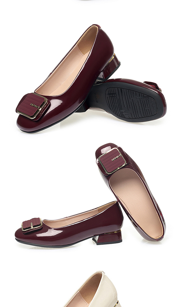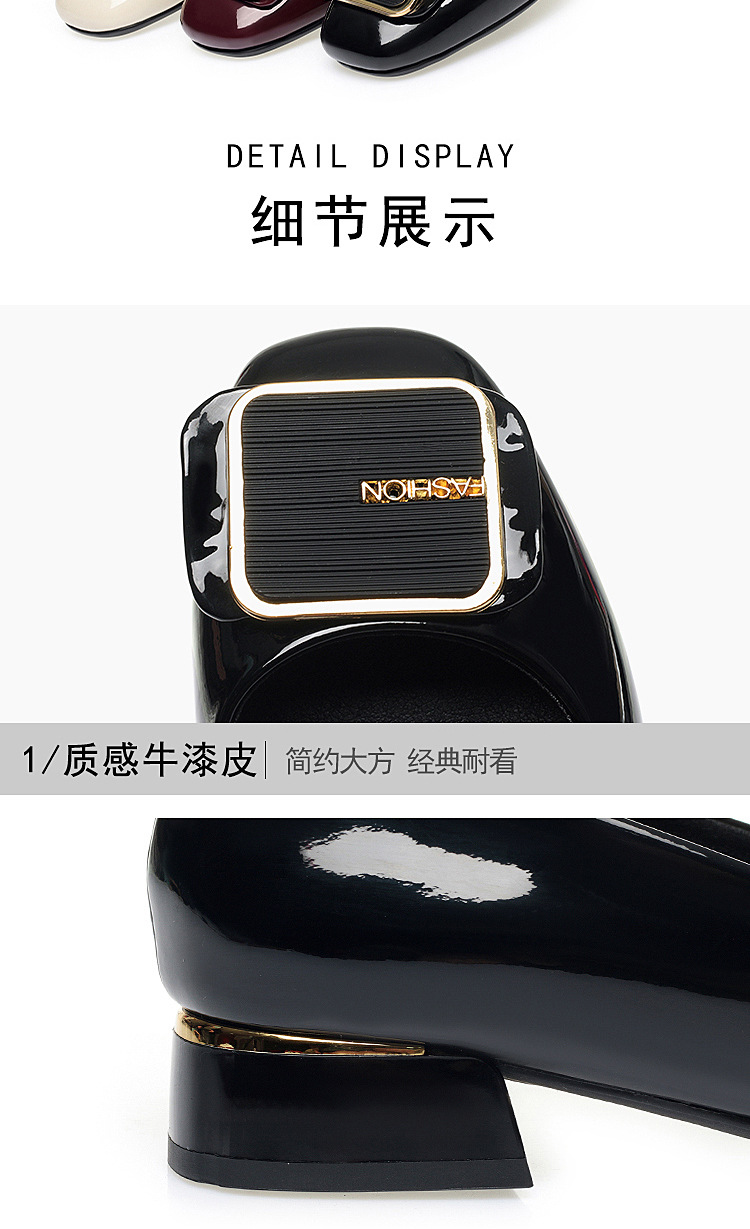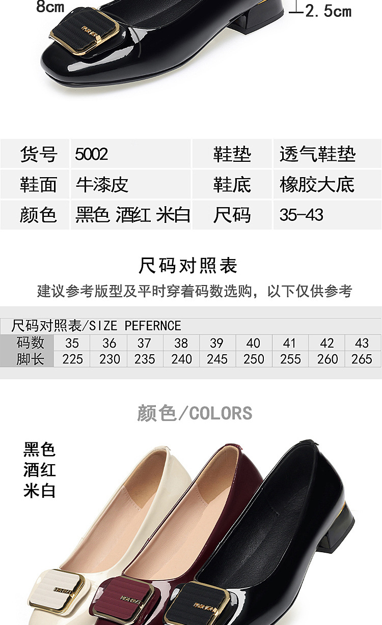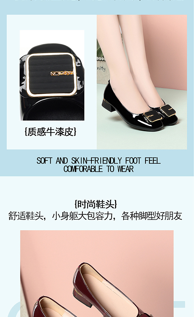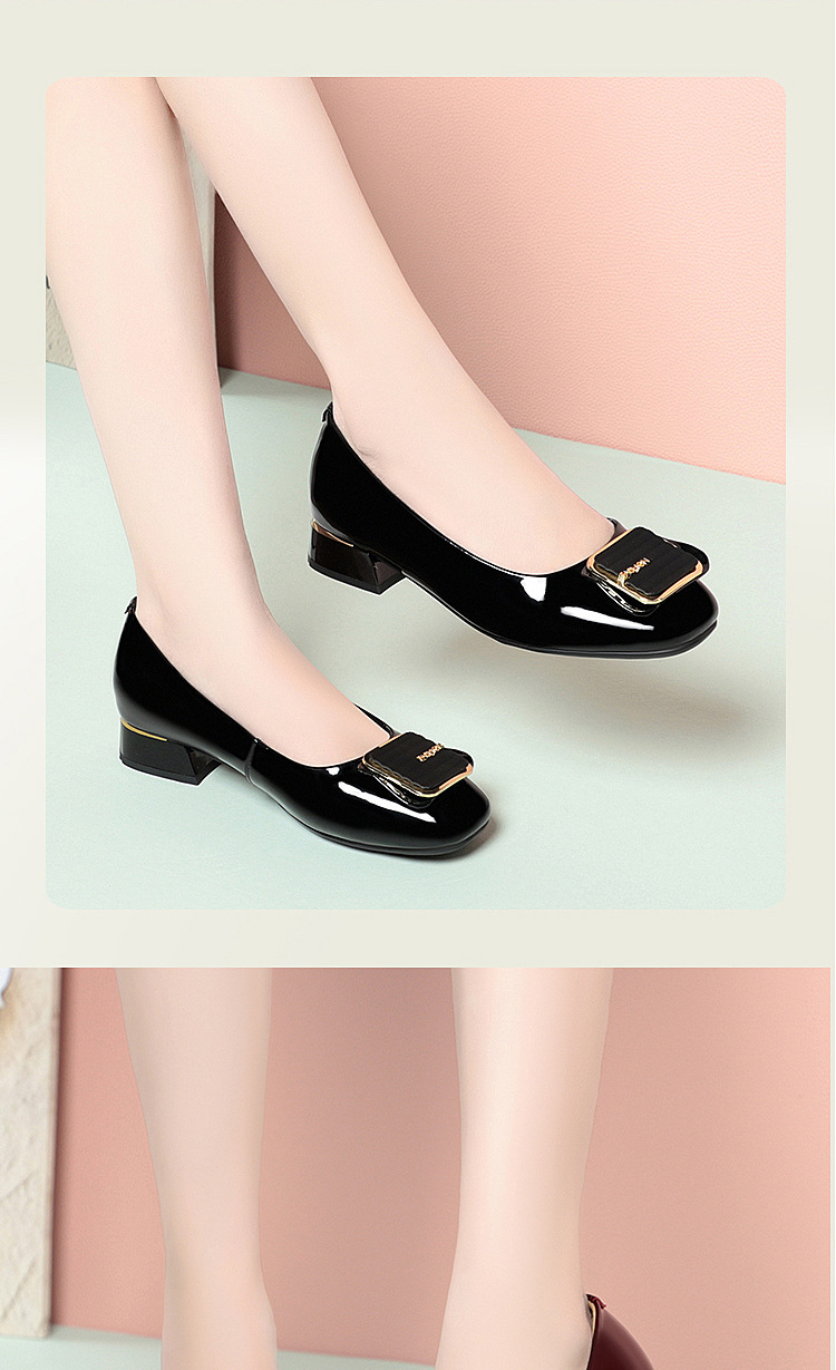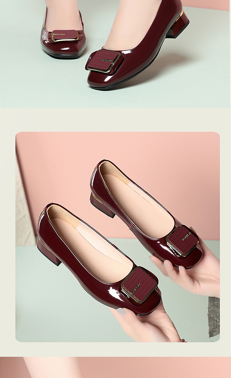 봄과 가을 정품 가죽 특허 가죽 싱글 레이어 신발 여성용 얕은 두꺼운 힐 웨딩 신발 밝은 가죽 낮은 발 뒤꿈치 신발 광장 발가락 새로운 여성 신발스토어 가기