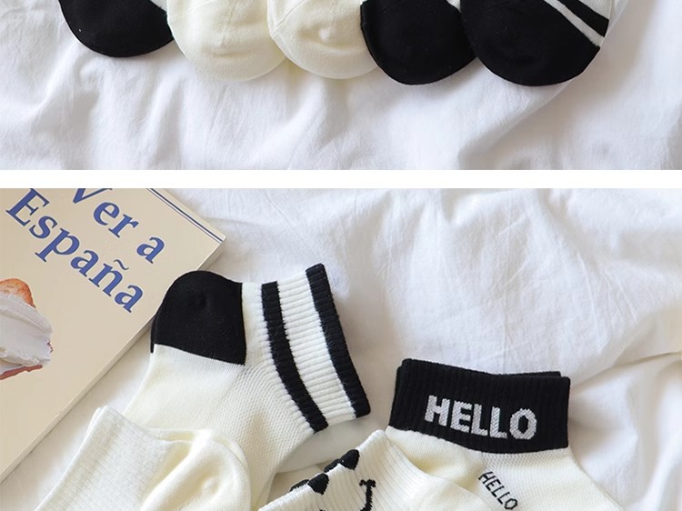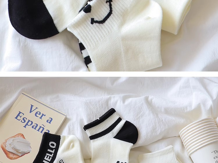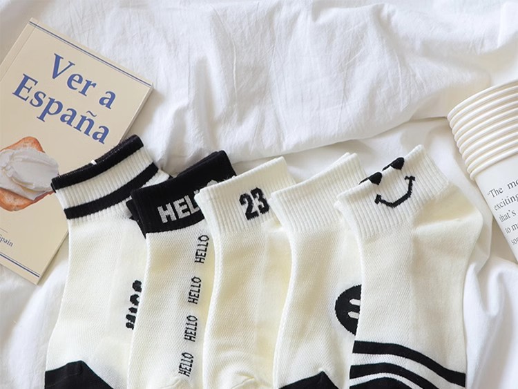 공장 흑백 줄무늬 양말 어린이 귀여운 스마일 짧은 양말 봄과 여름 메쉬는 짧은 편지 면화를 떨어지지 않습니다.스토어 가기