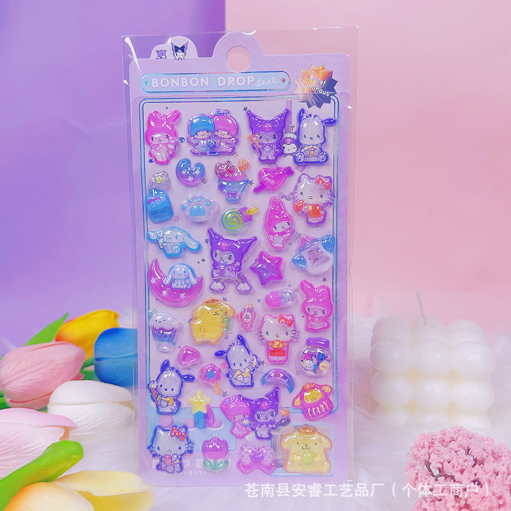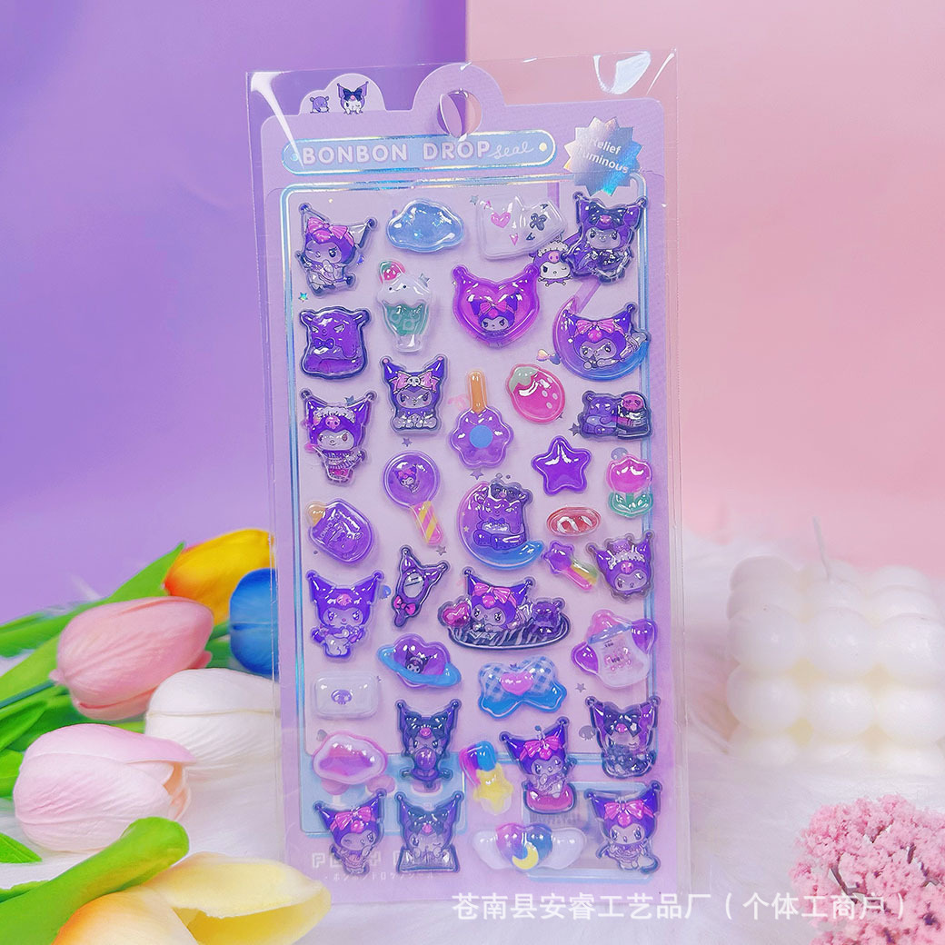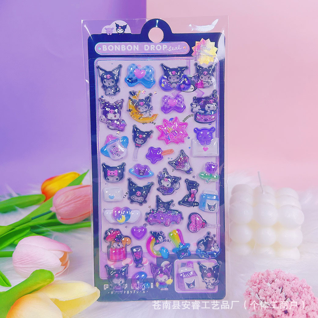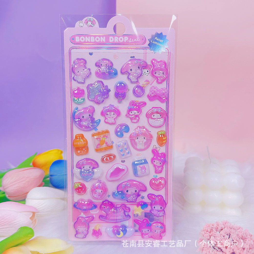 새로운 양각 만화 Sanrio Kulomi Merotti 3D 입체 양각 빛나는 스티커 어린이 귀여운 재미스토어 가기