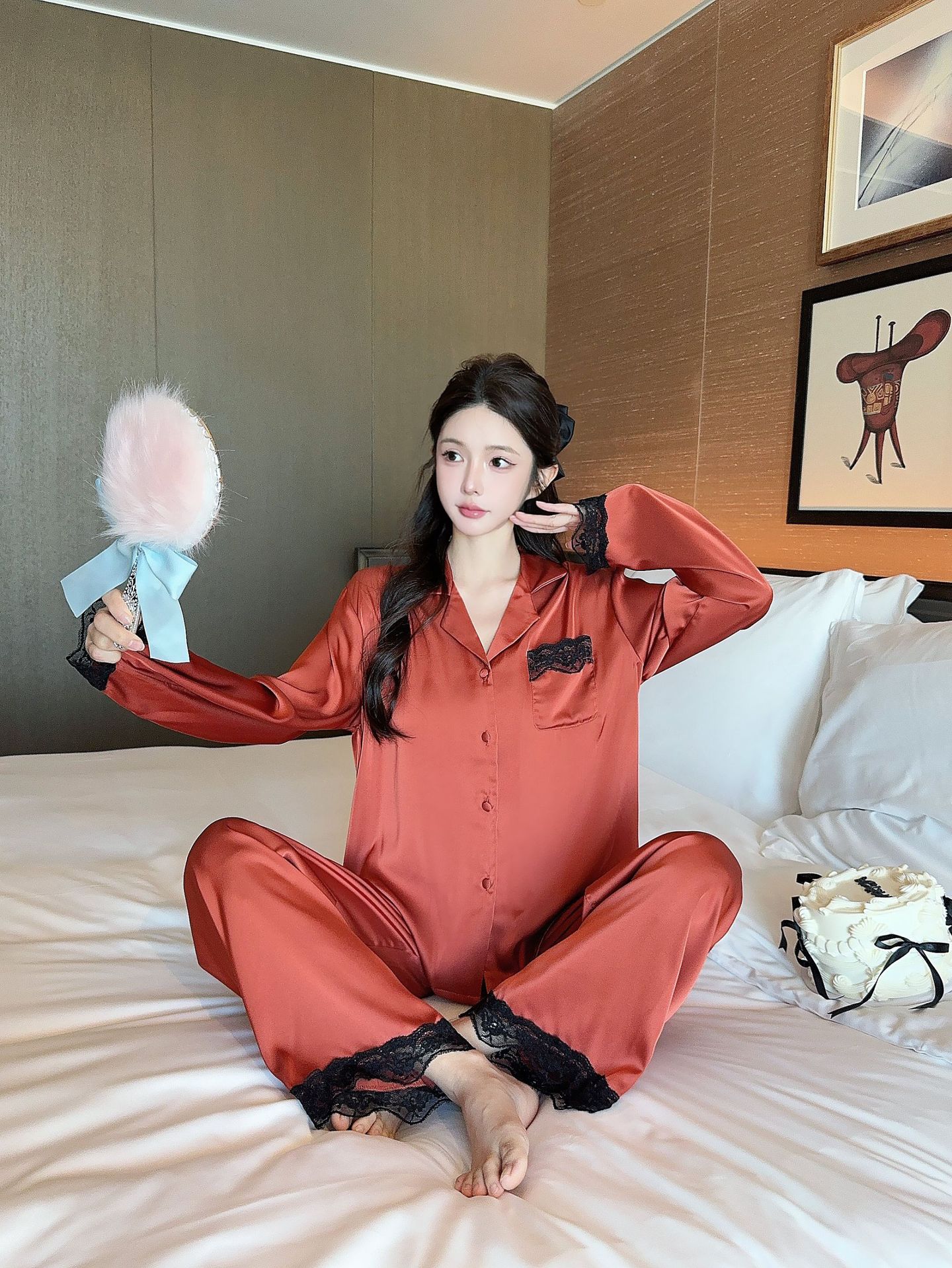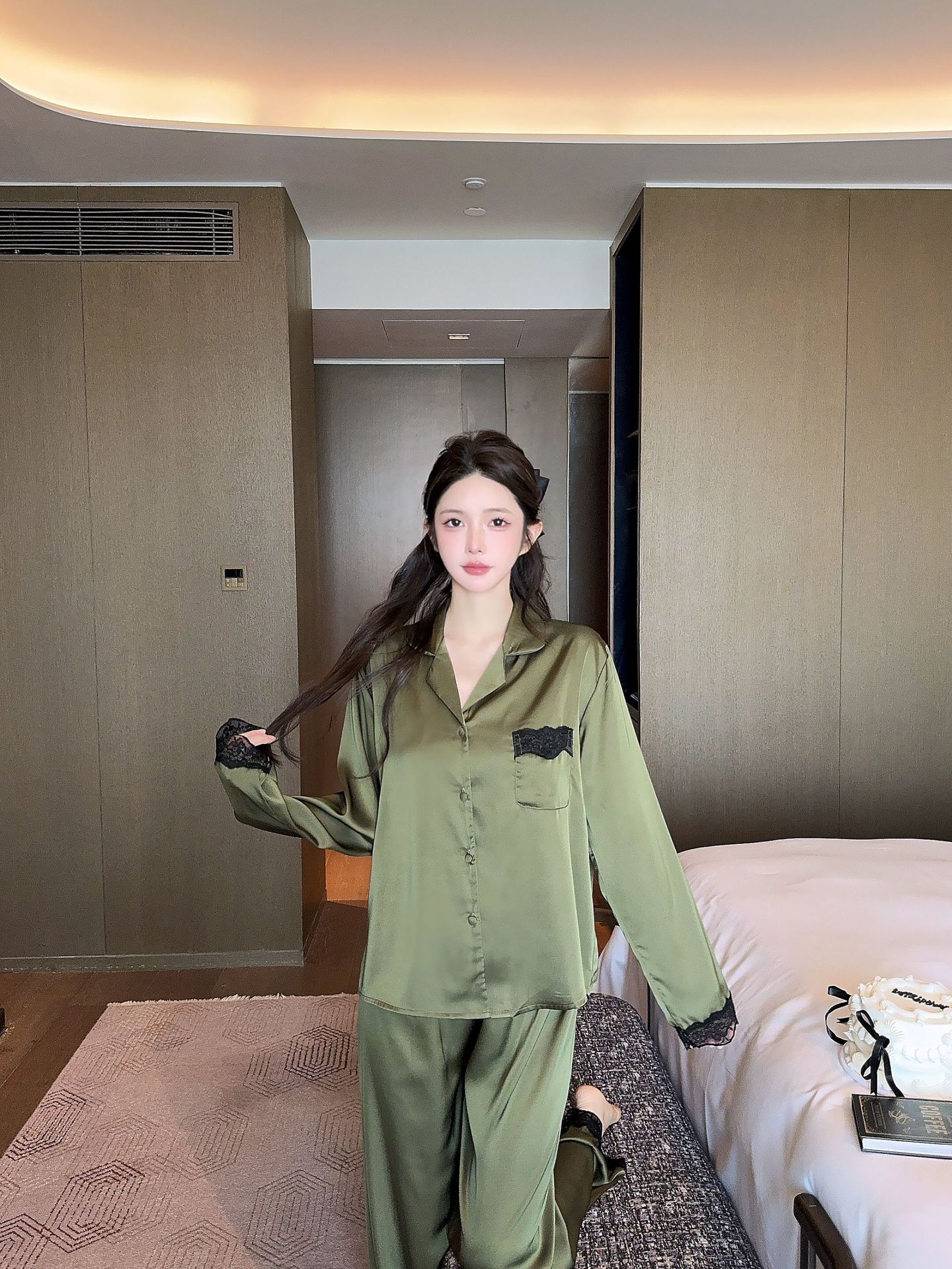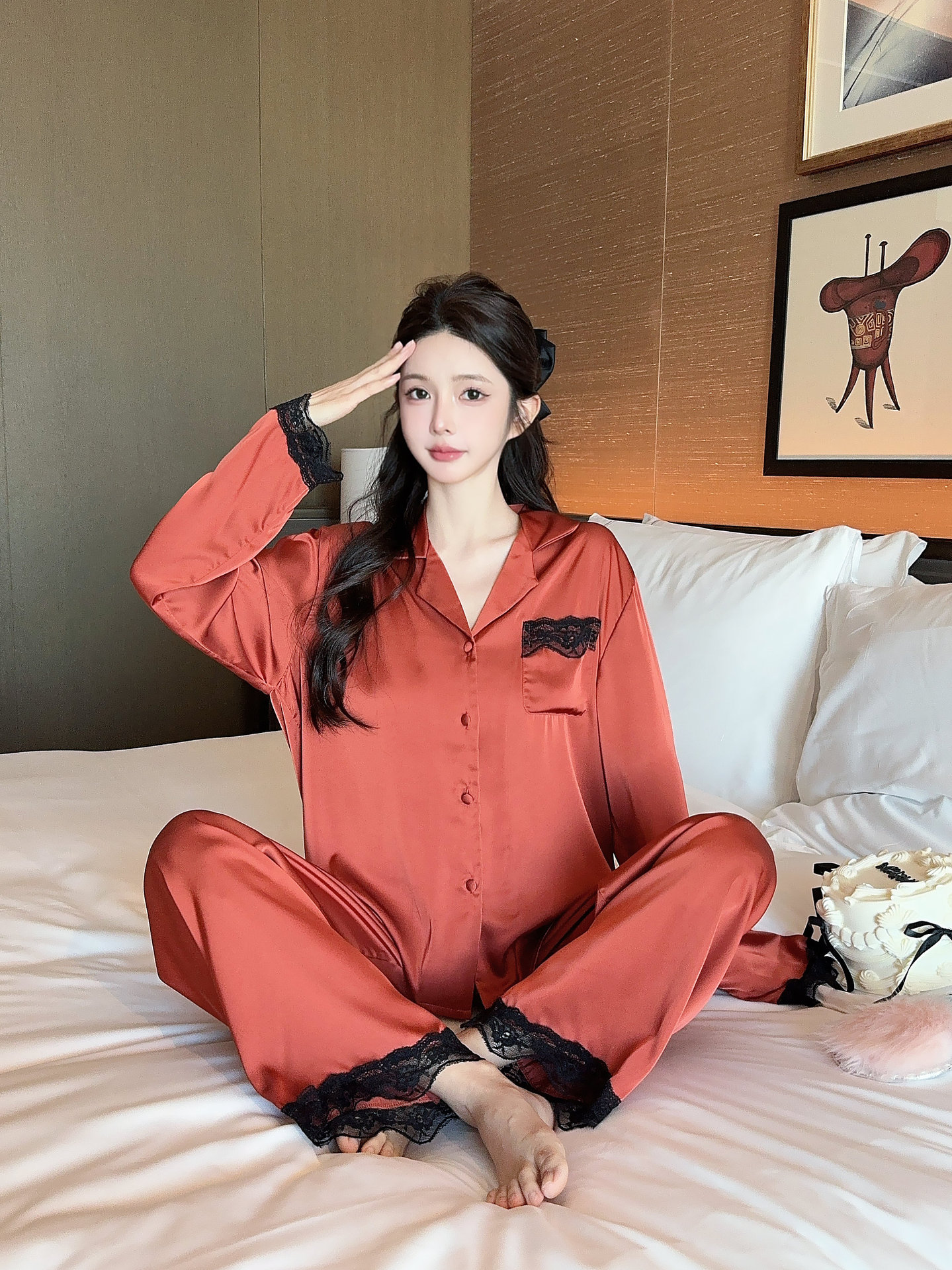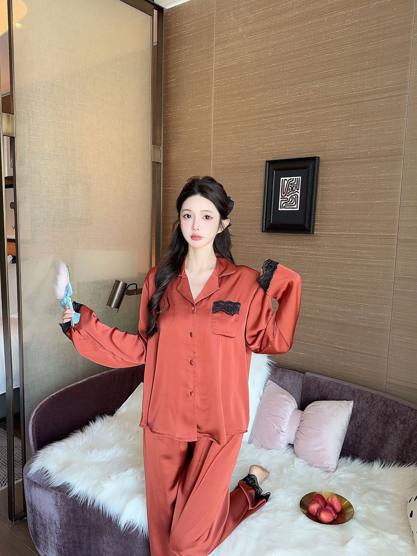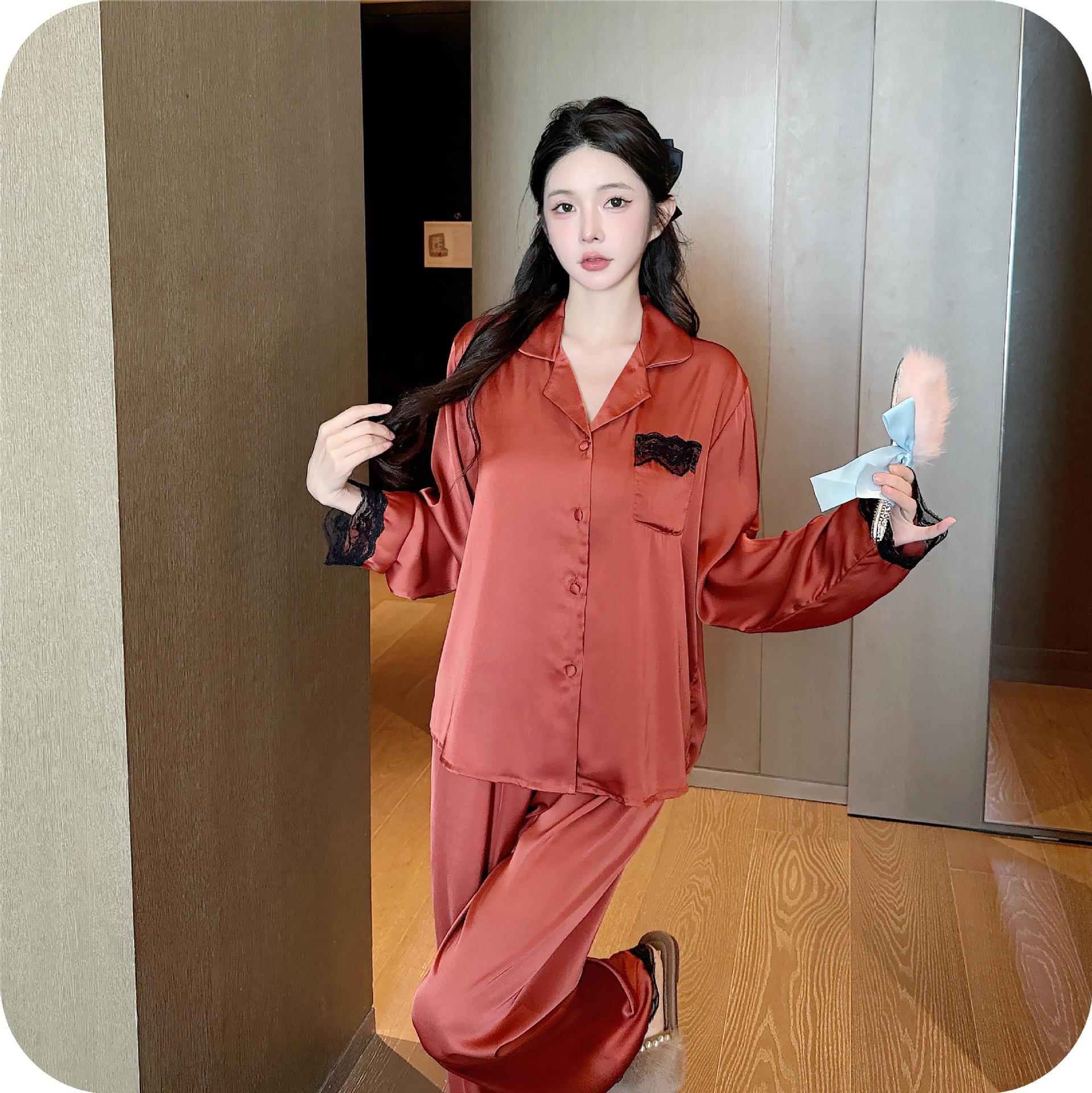 [라즈베리 잼] 아이스실크 봄 파자마 여성 긴소매 바지 한국식 카디건 레이스 아우터 홈 의류스토어 가기