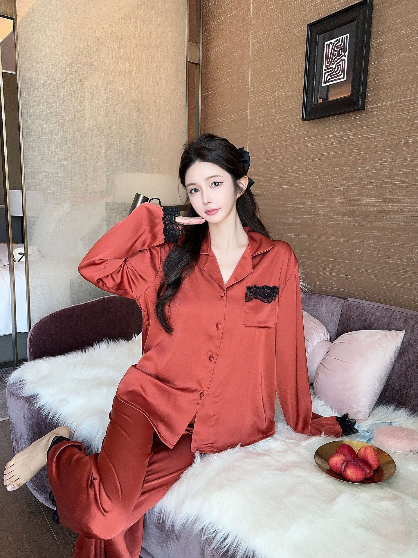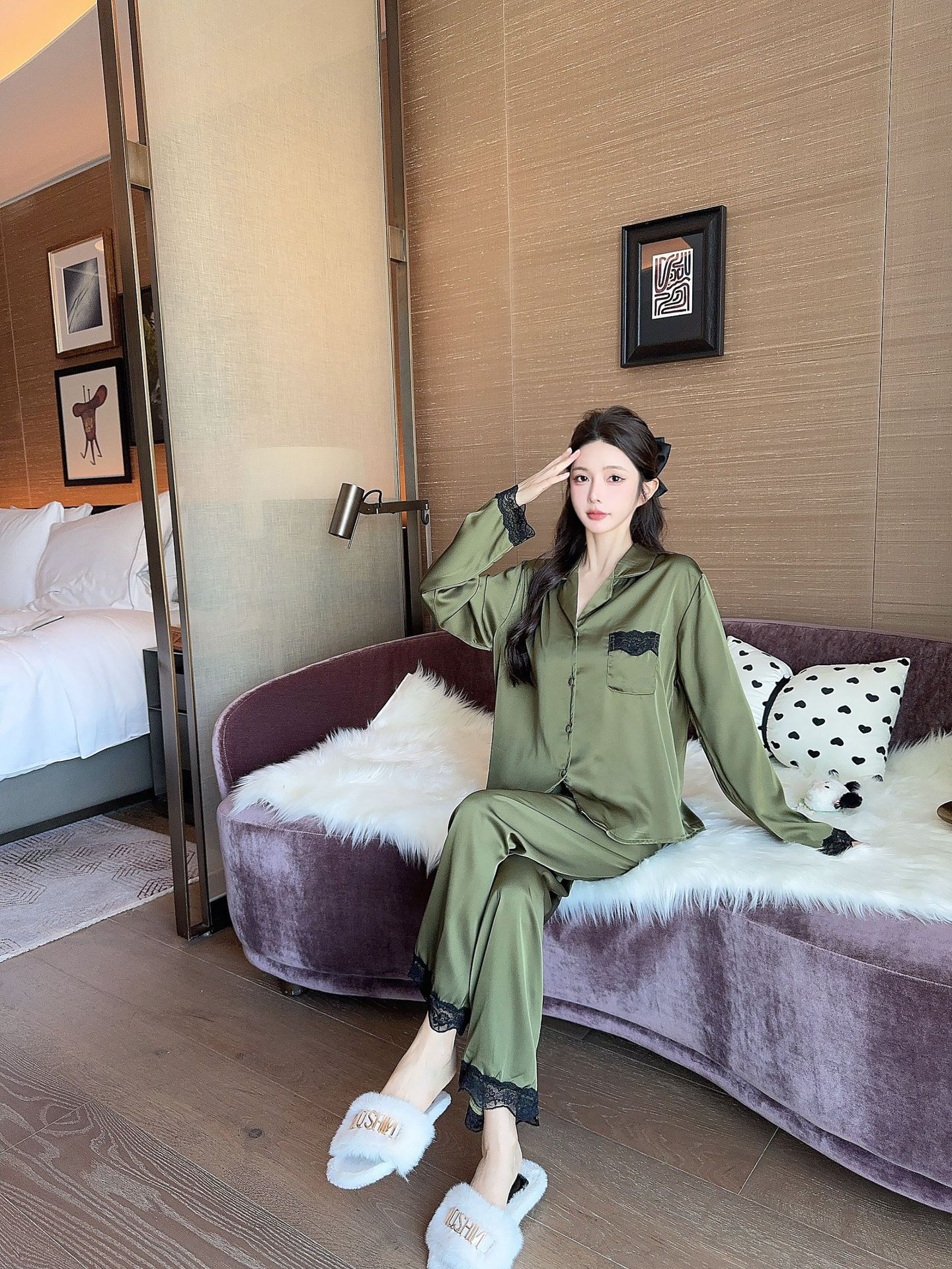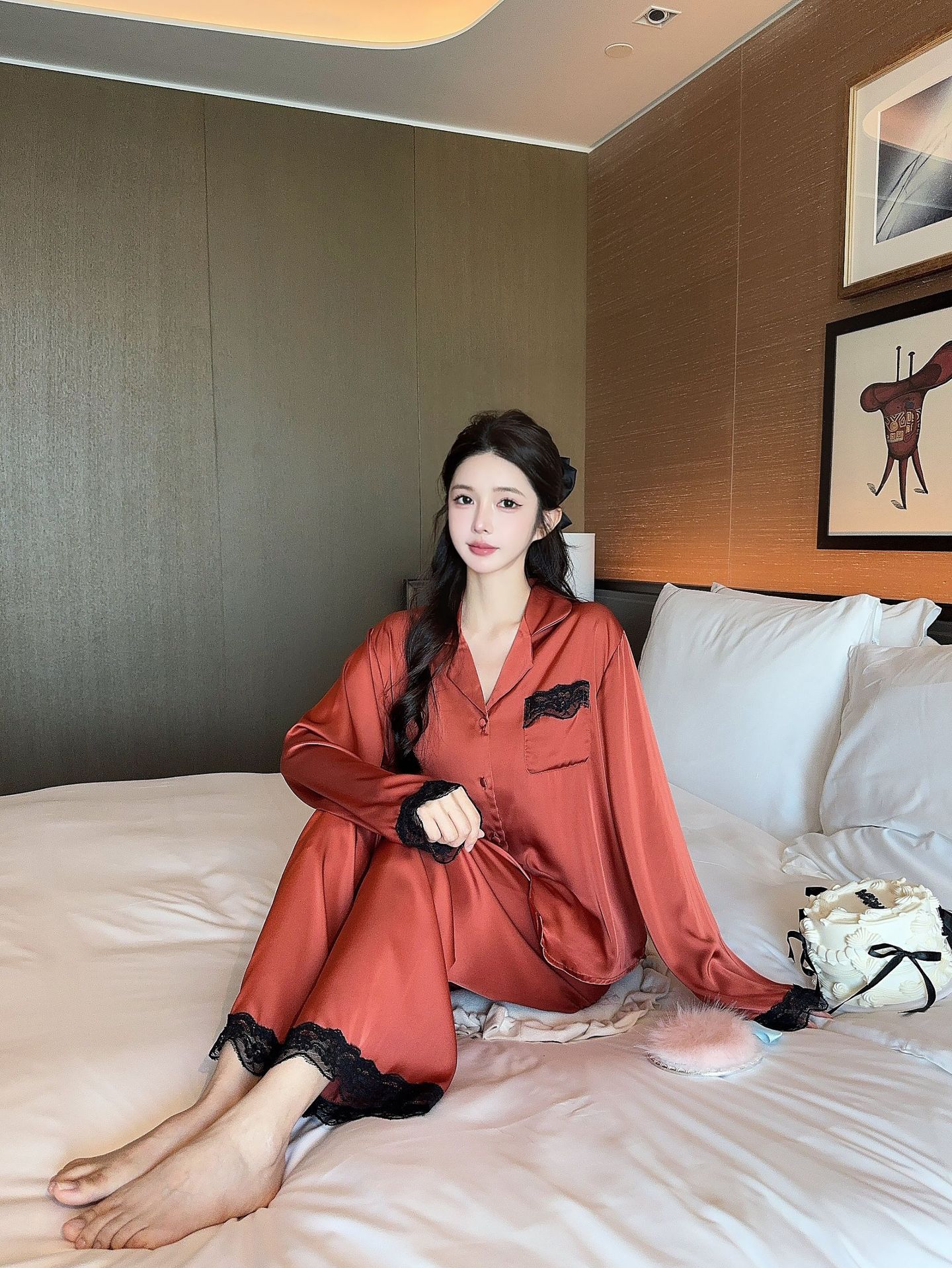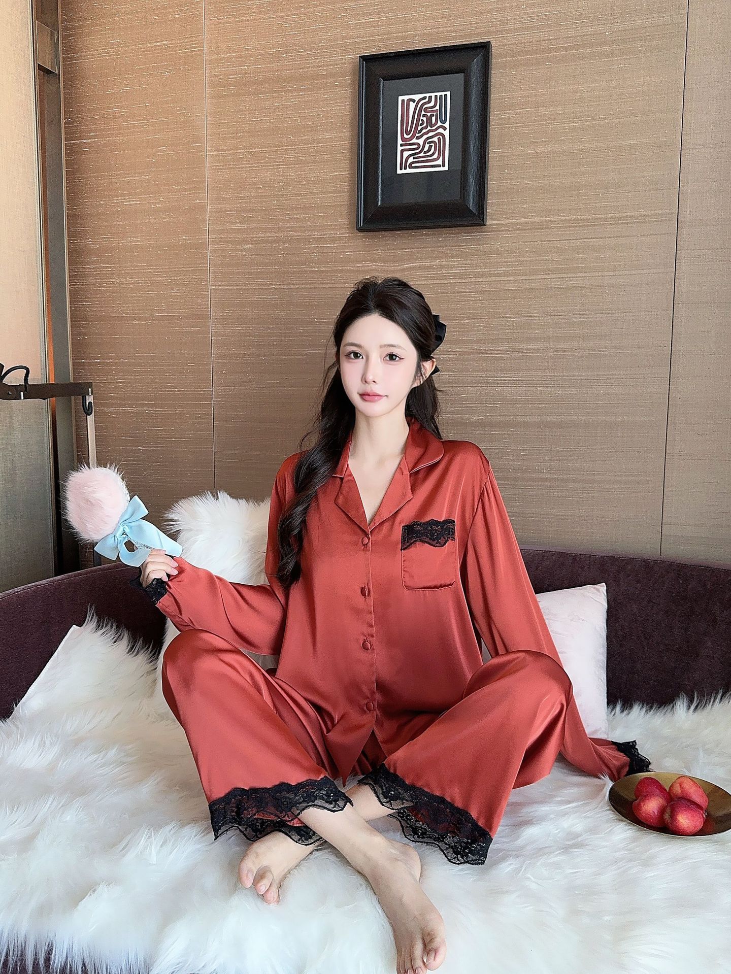 [라즈베리 잼] 아이스실크 봄 파자마 여성 긴소매 바지 한국식 카디건 레이스 아우터 홈 의류스토어 가기