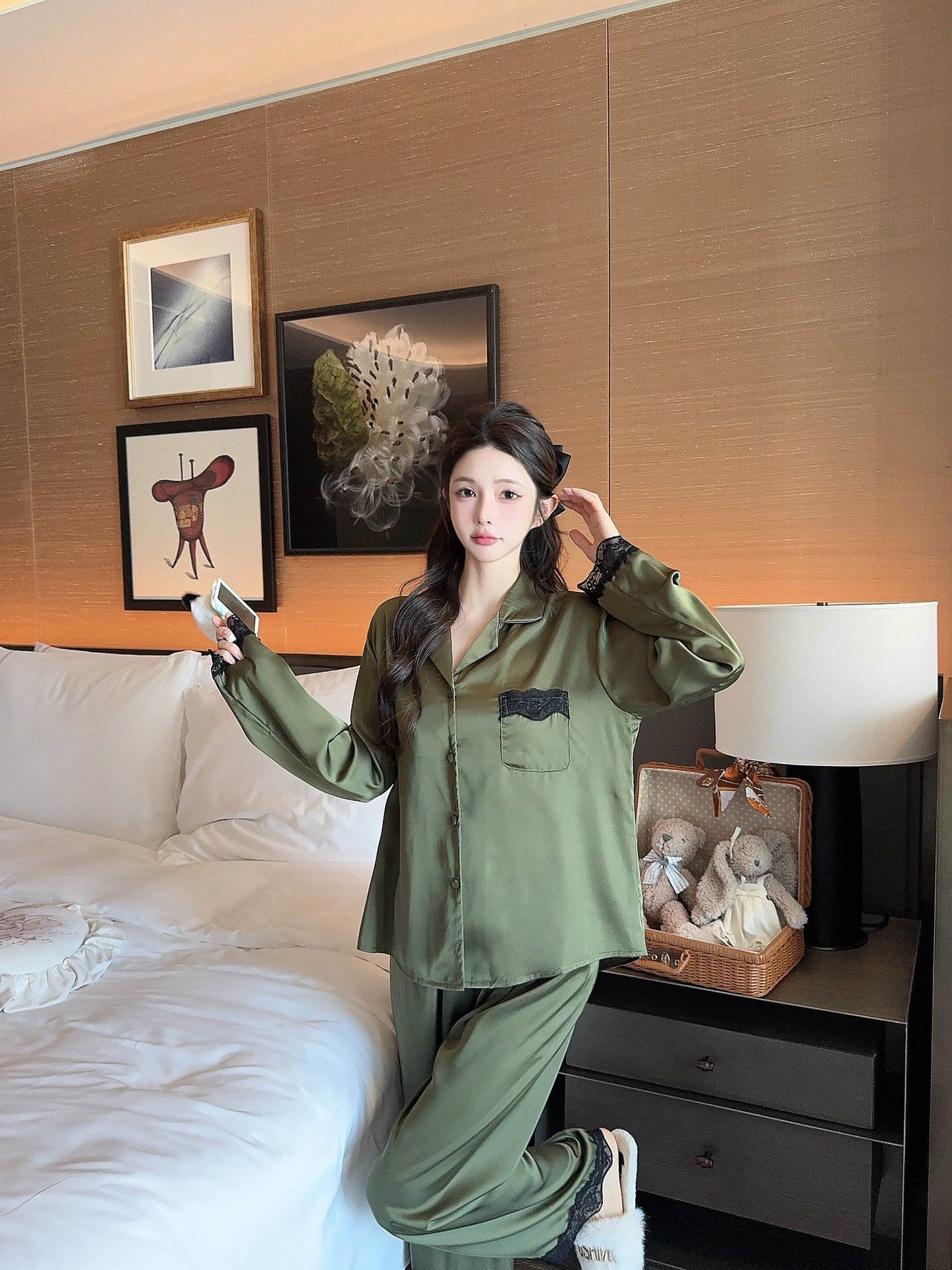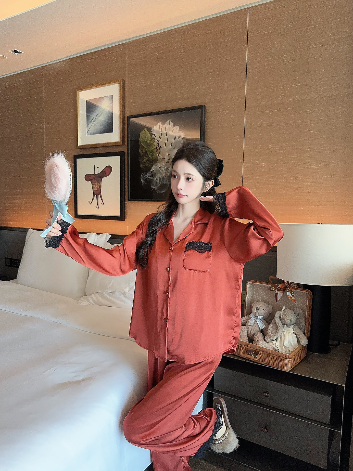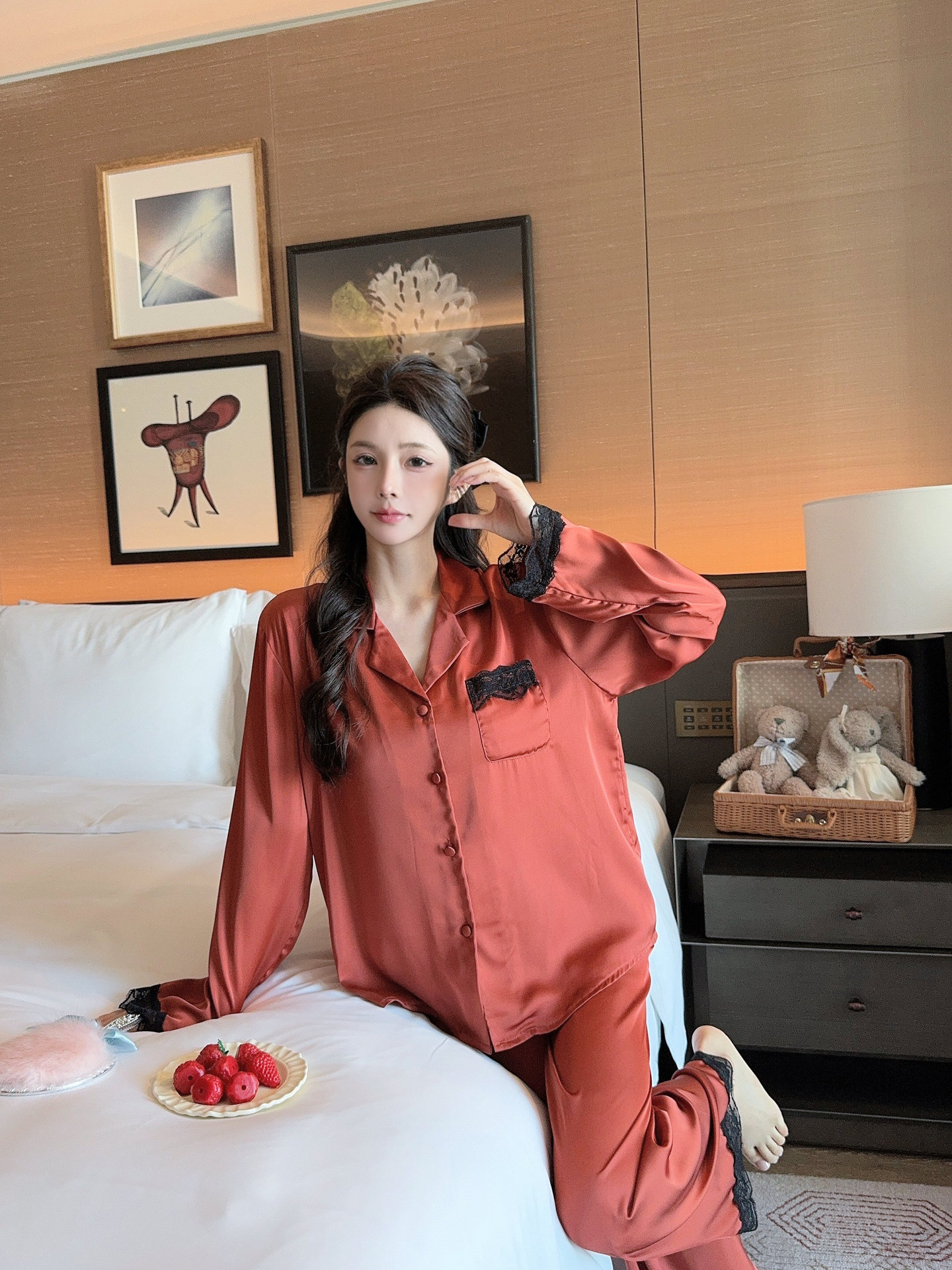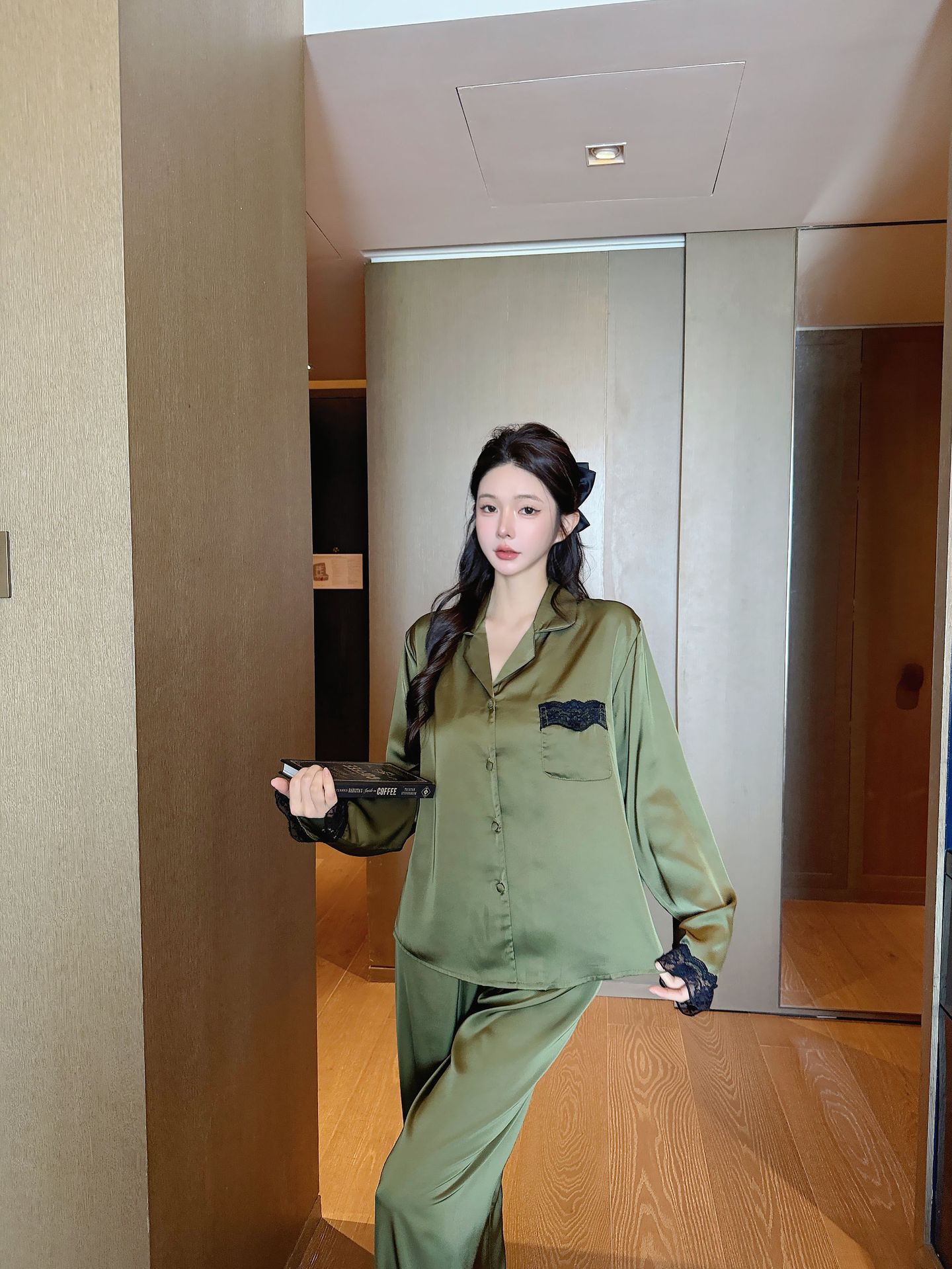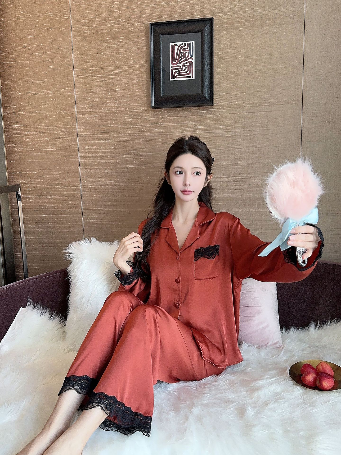 [라즈베리 잼] 아이스실크 봄 파자마 여성 긴소매 바지 한국식 카디건 레이스 아우터 홈 의류스토어 가기