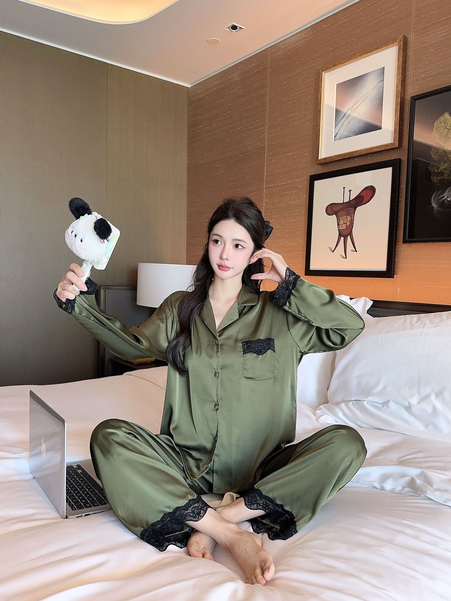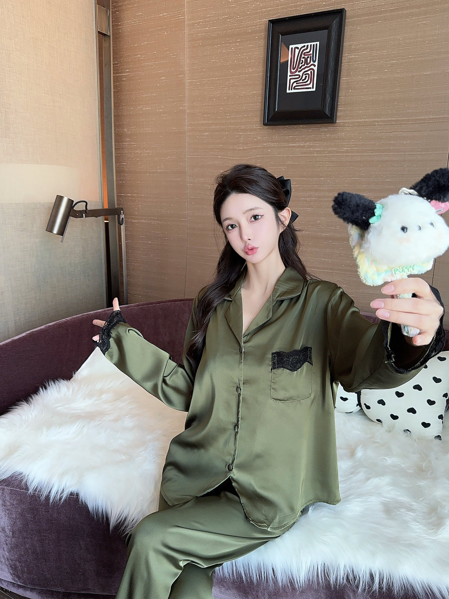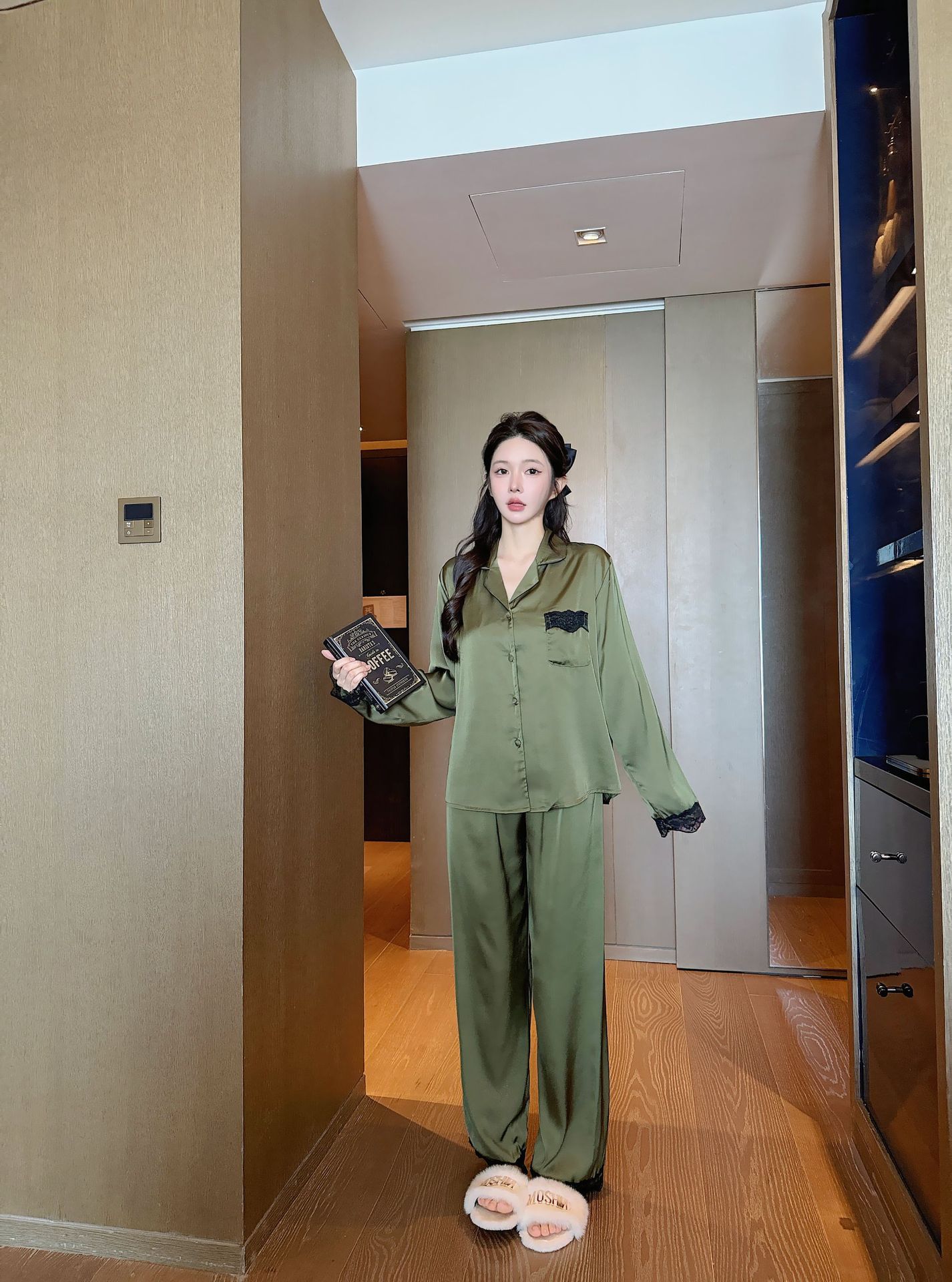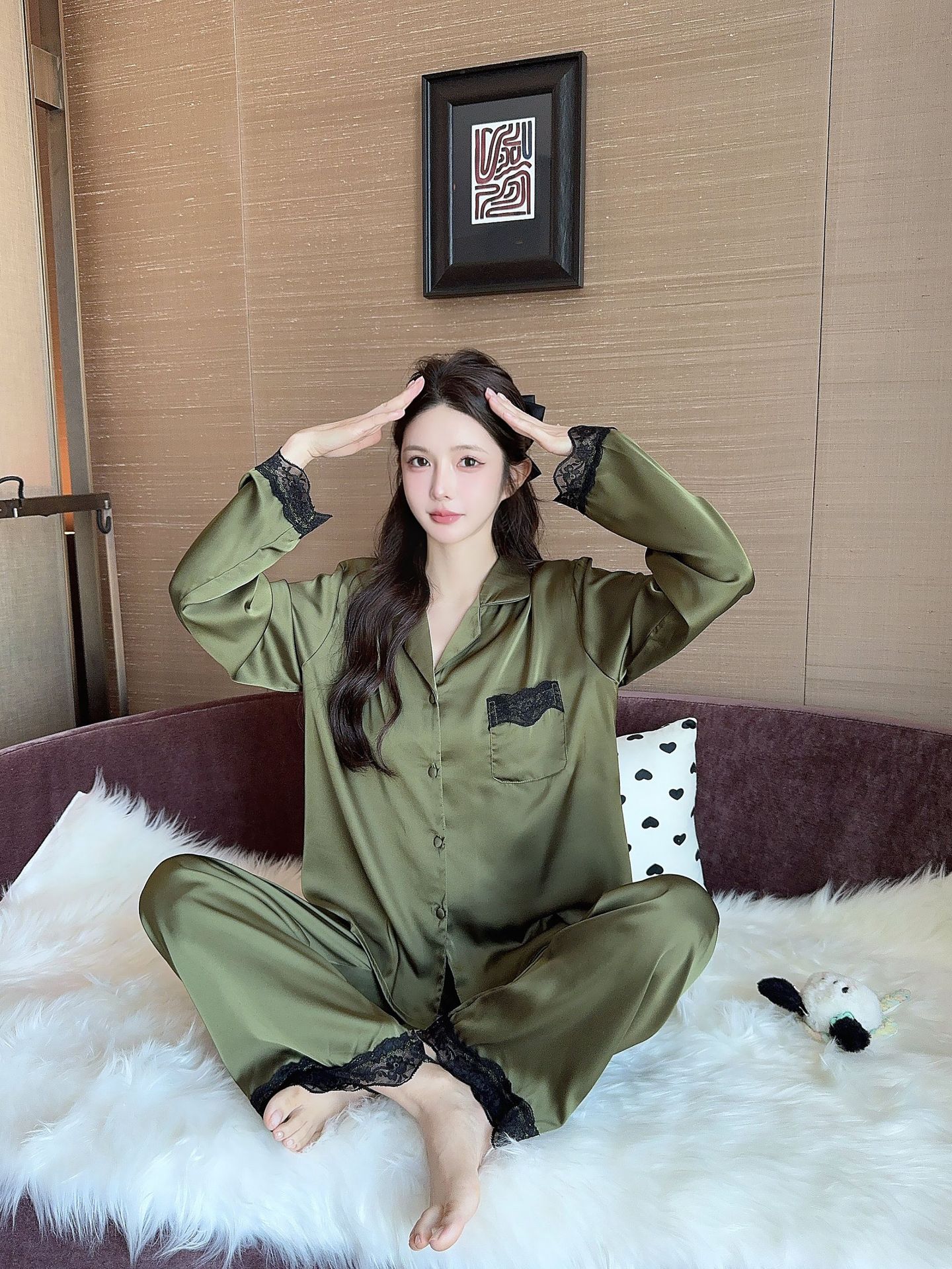 [라즈베리 잼] 아이스실크 봄 파자마 여성 긴소매 바지 한국식 카디건 레이스 아우터 홈 의류