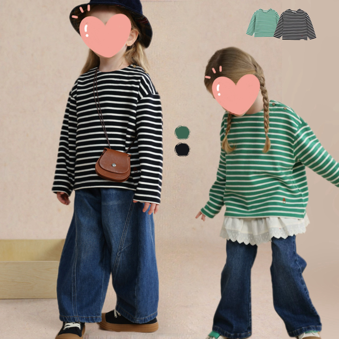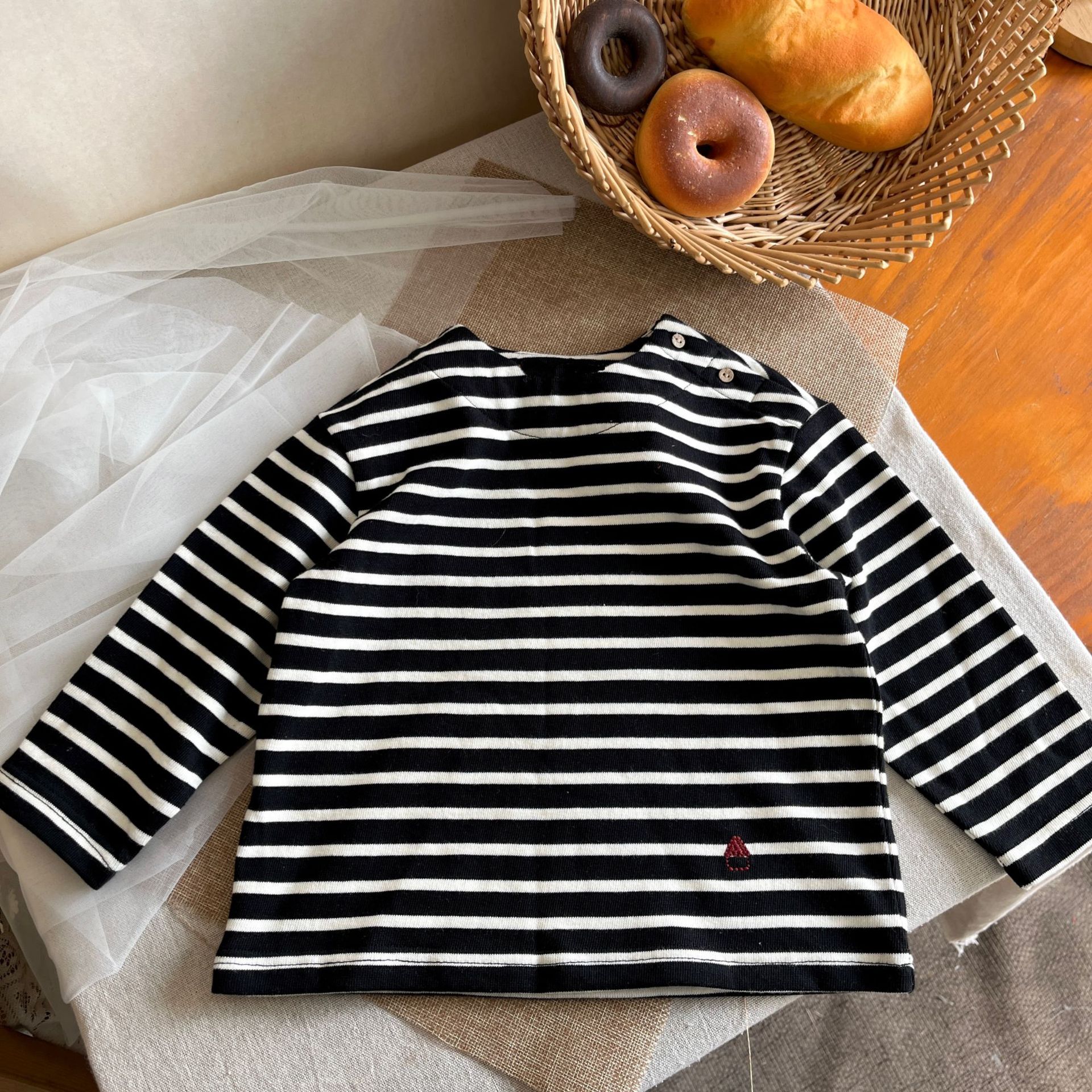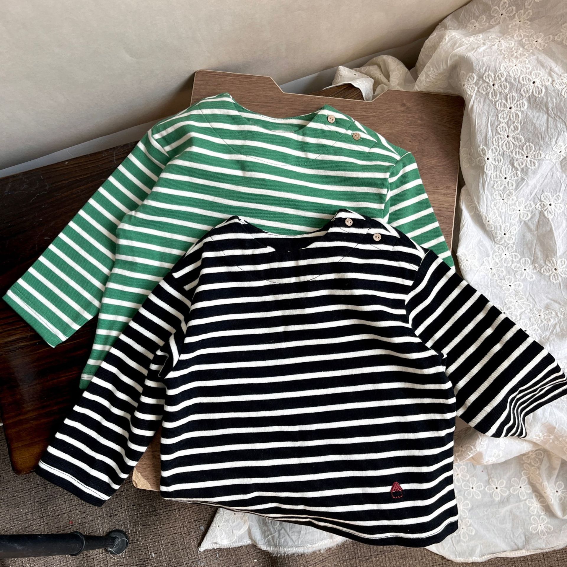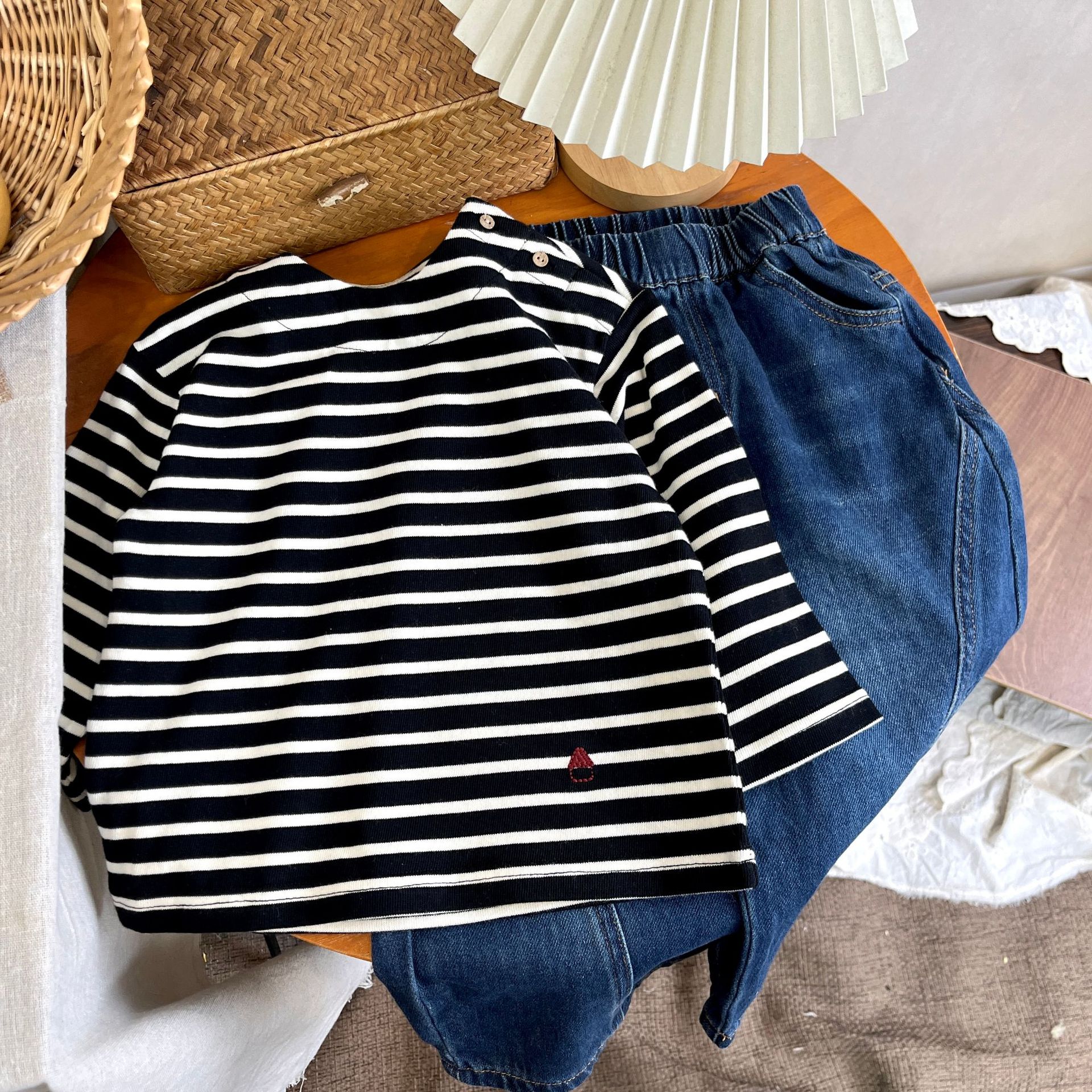재고 있음 ~ 2025 가을 새로운 한국 스타일 어린이 유치원 클래식 다목적 서양식 자수 스트라이프 긴팔 티셔츠