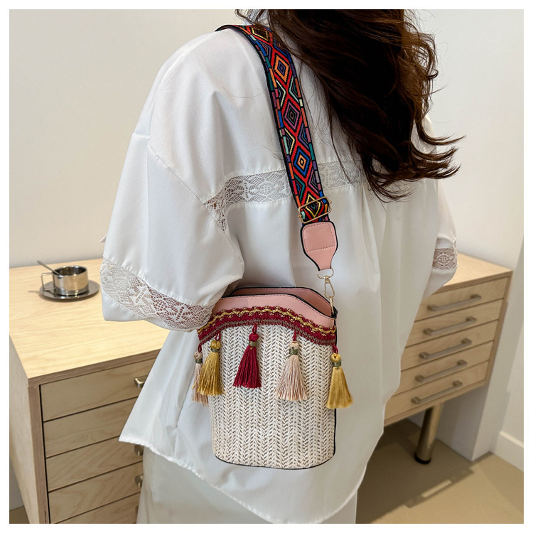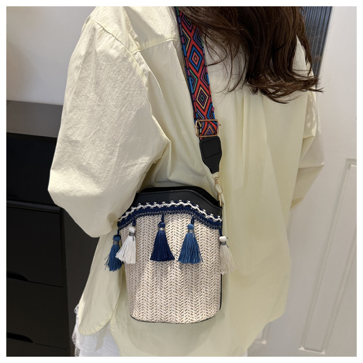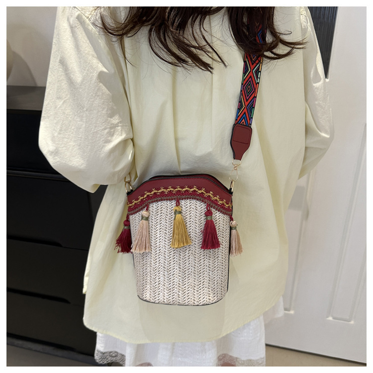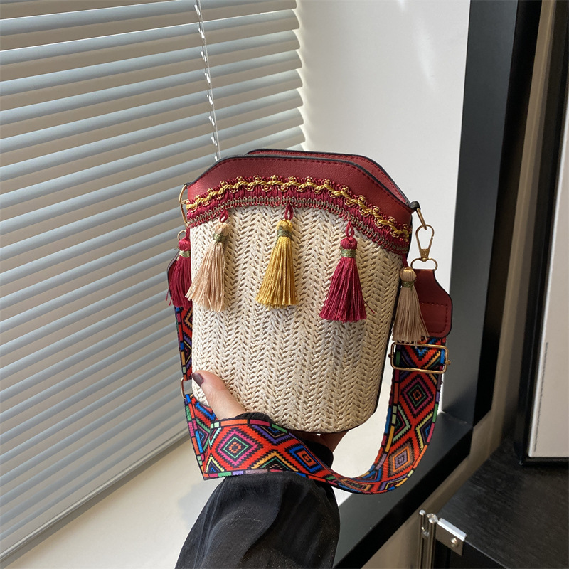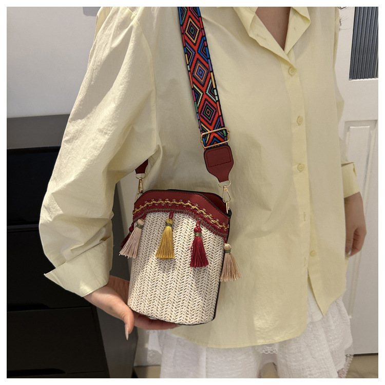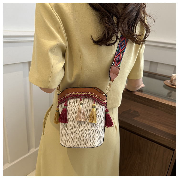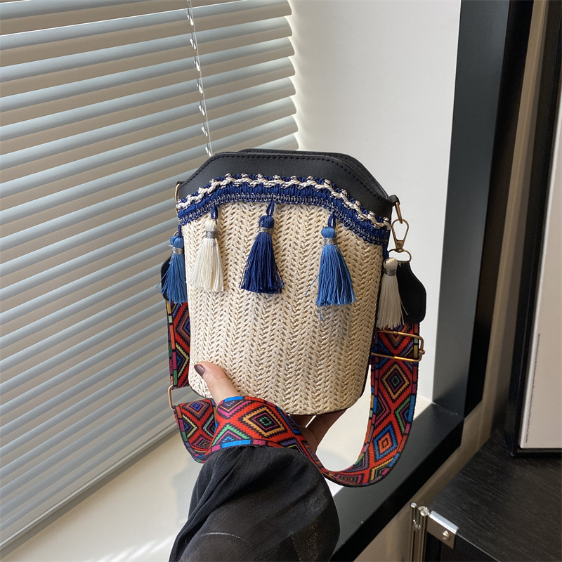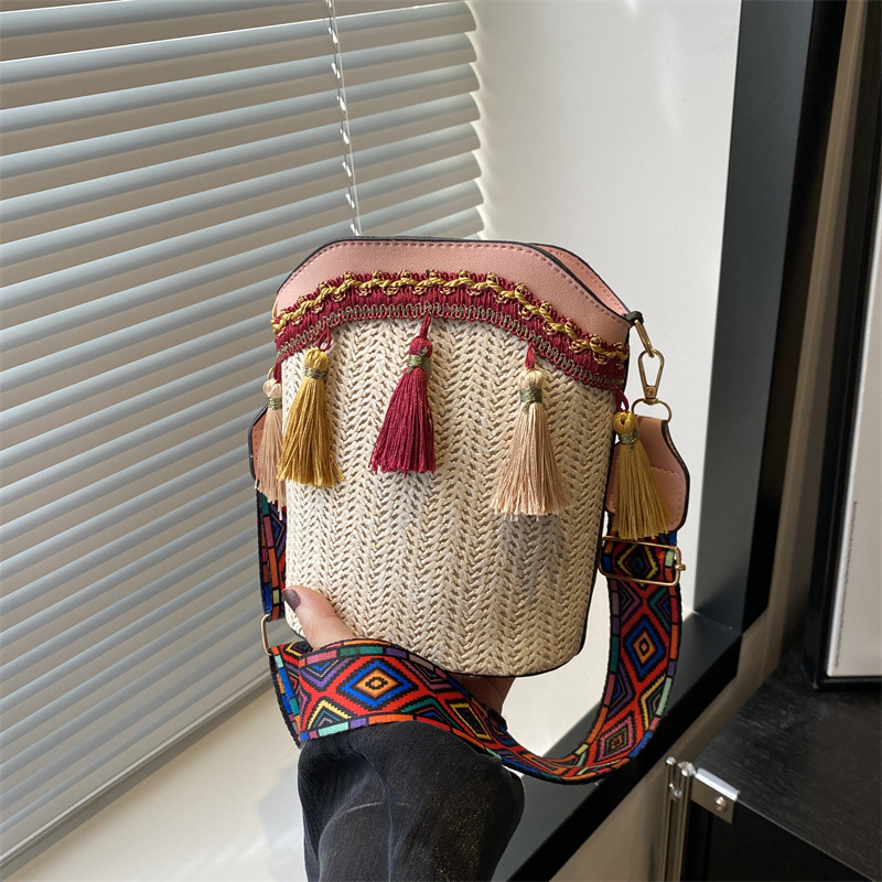 2025 인기있는 새로운 패션 민족 스타일 높은 문자 짠 크로스 백 어깨 가방 버킷 가방 술 여성용 가방