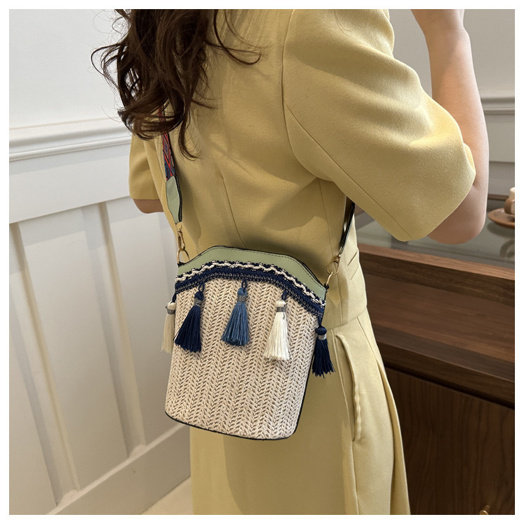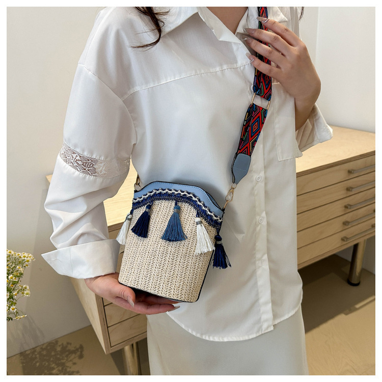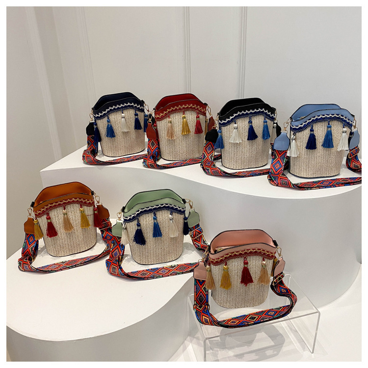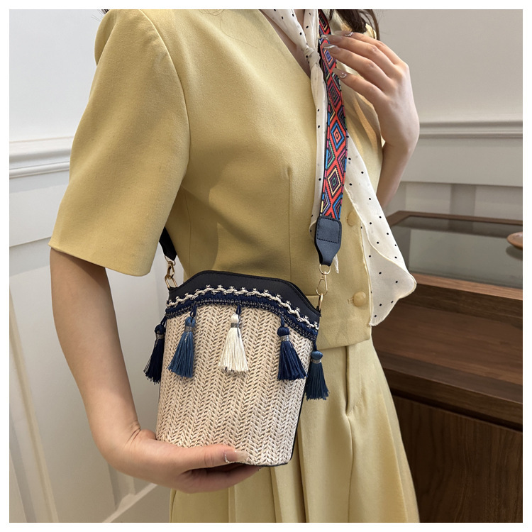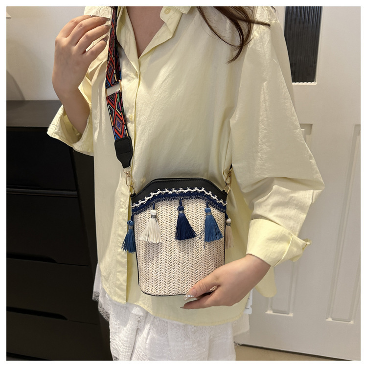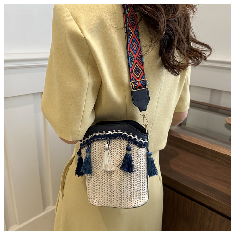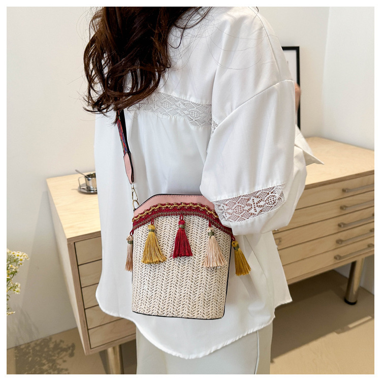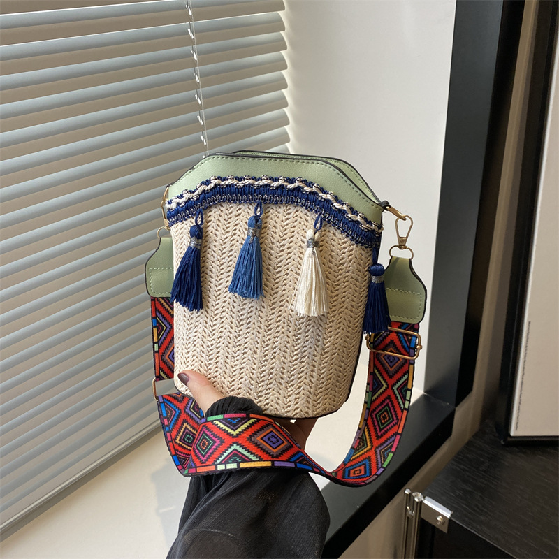 2025 인기있는 새로운 패션 민족 스타일 높은 문자 짠 크로스 백 어깨 가방 버킷 가방 술 여성용 가방