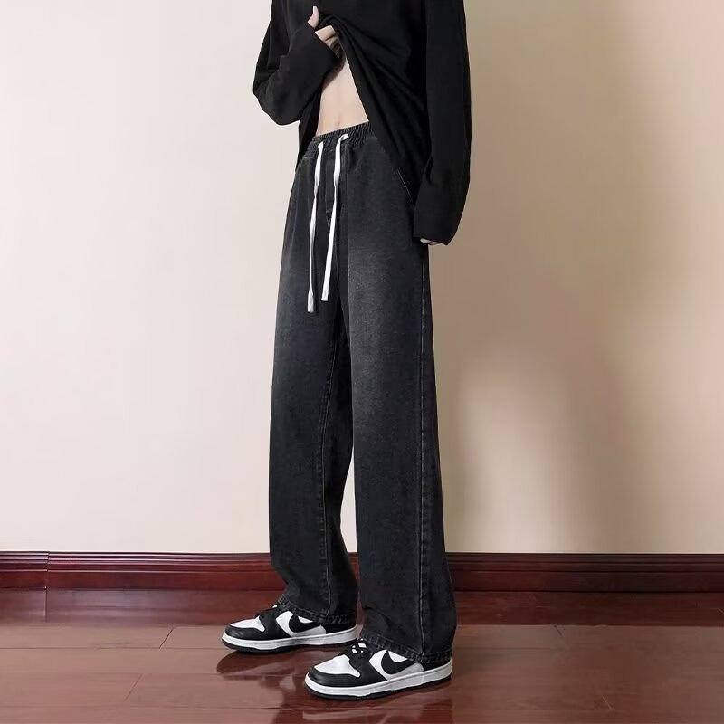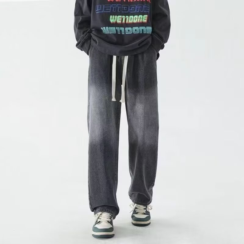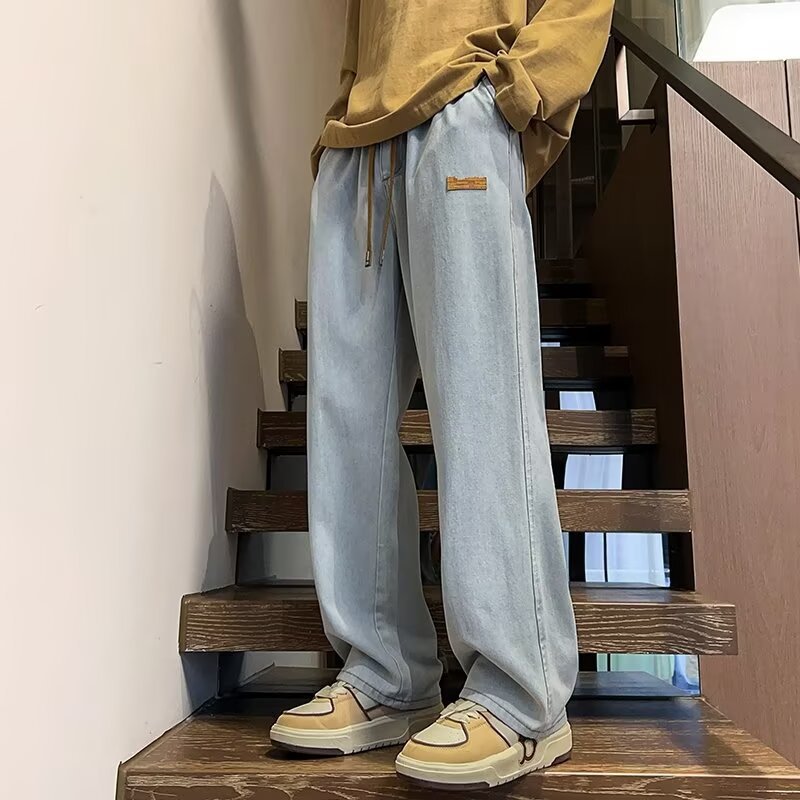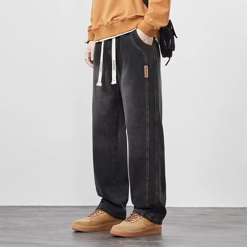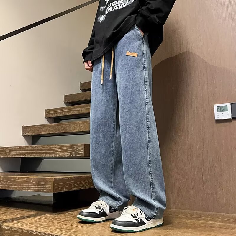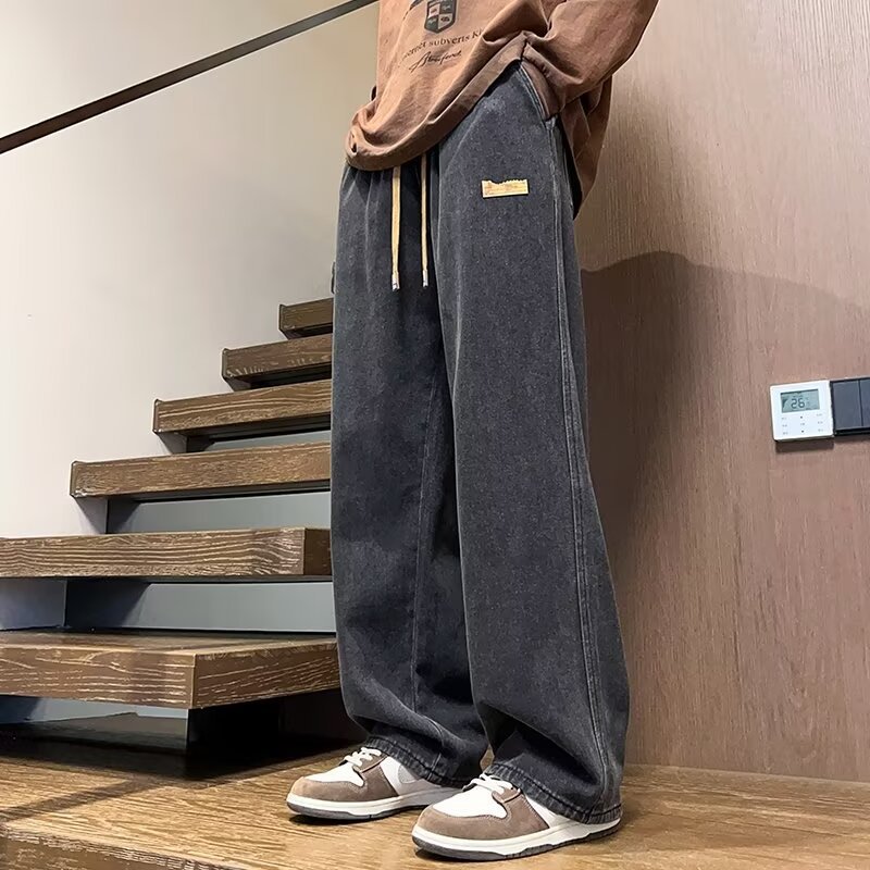 2025 봄과 가을 느슨한 스트레이트 청바지 남성용 아메리칸 스타일 레트로 드로스트링 와이드 레그 캐주얼 롱 팬츠 남성용 트렌디 브랜드스토어 가기