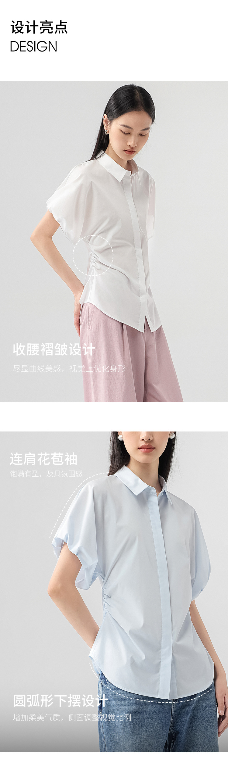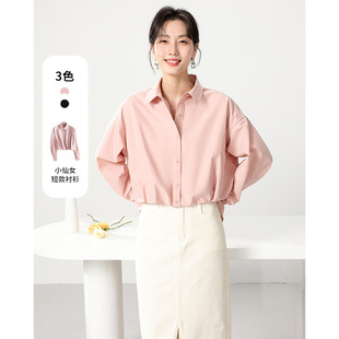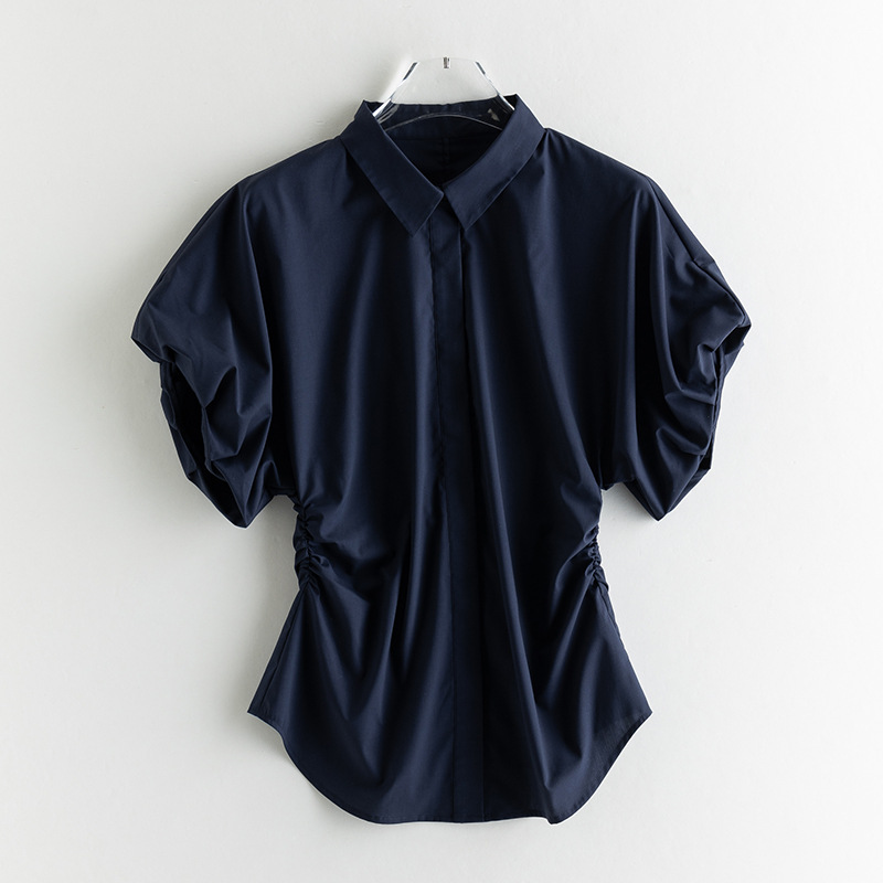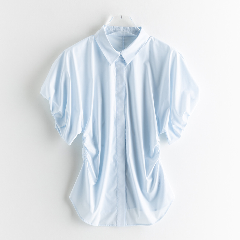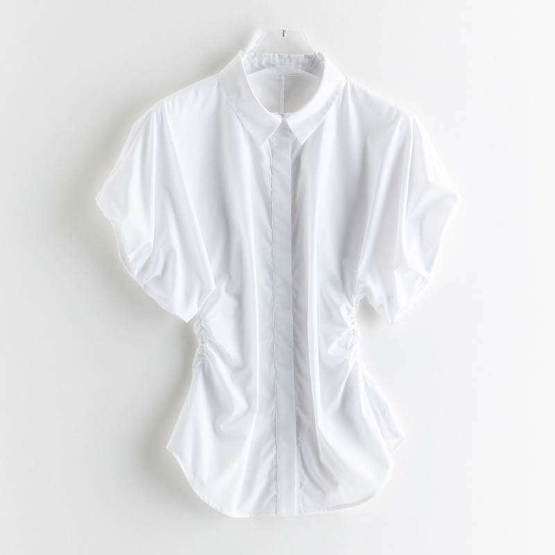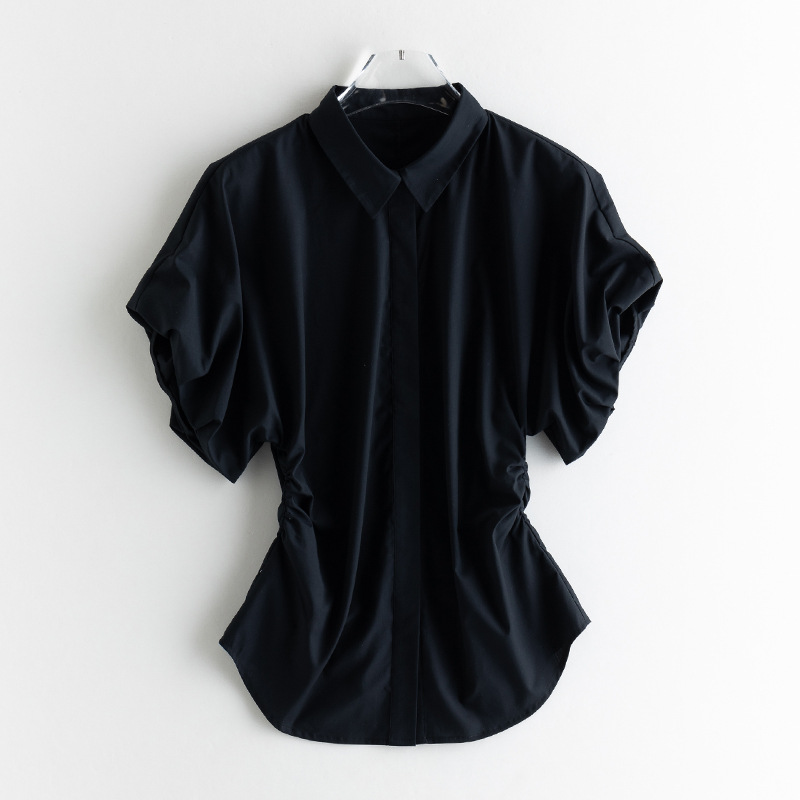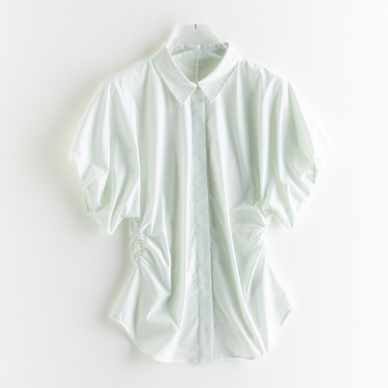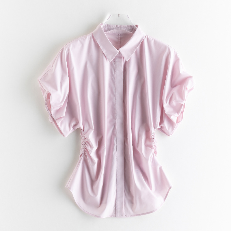 25 봄과 여름 새로운 프랑스 스타일 로맨틱 코 허리 핀치 주름 셔츠 비 다림질 쿨 스키니 젠틀 버드 짧은 소매 셔츠