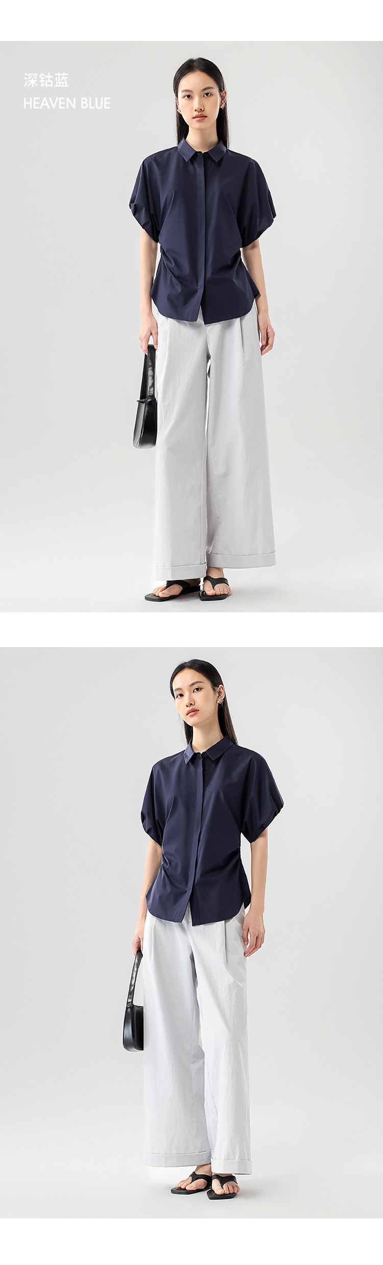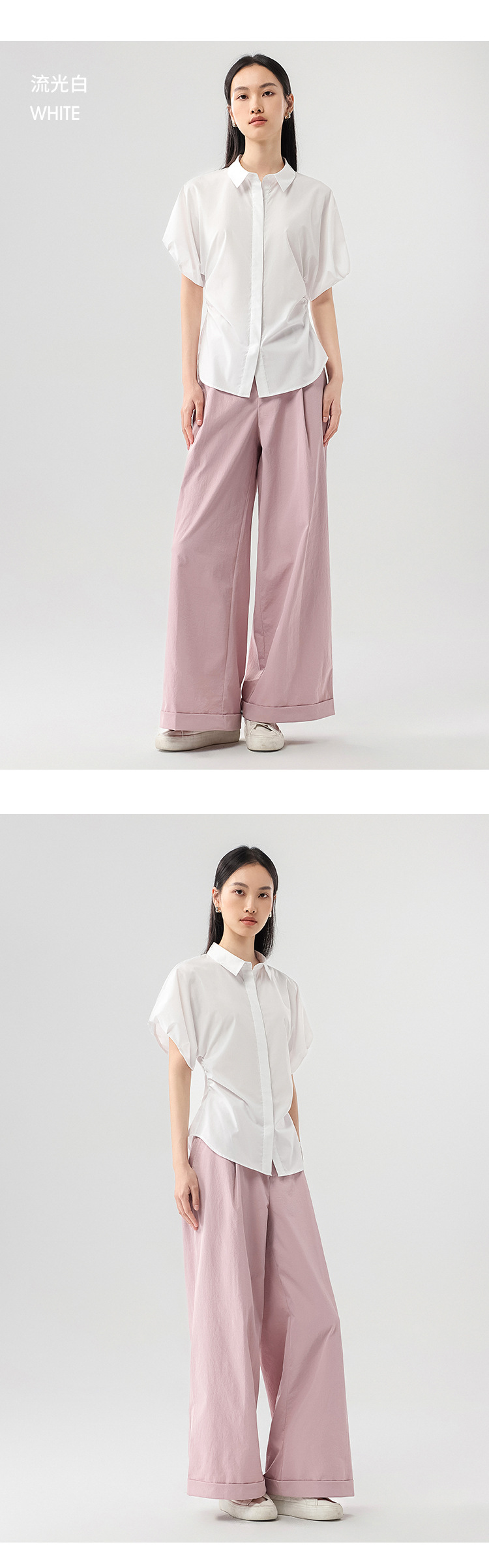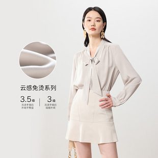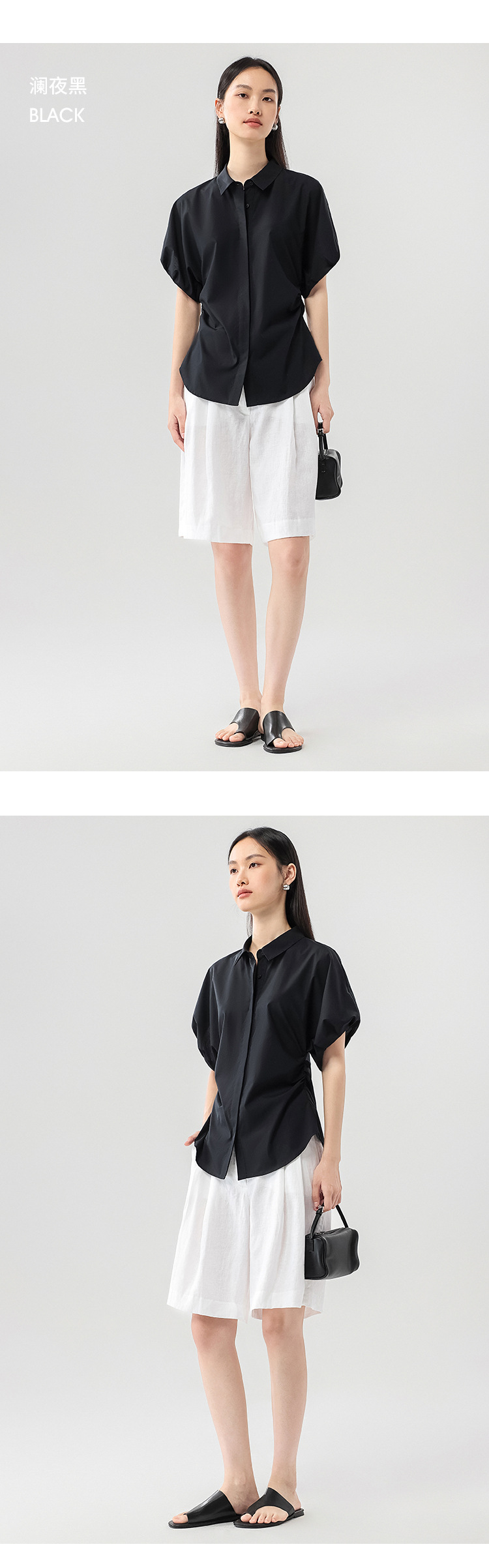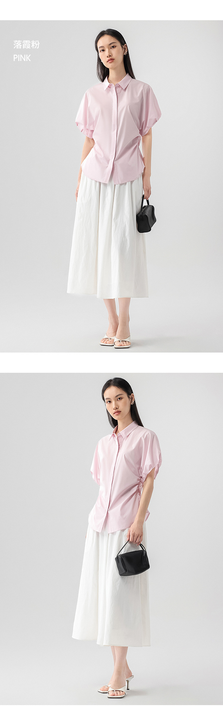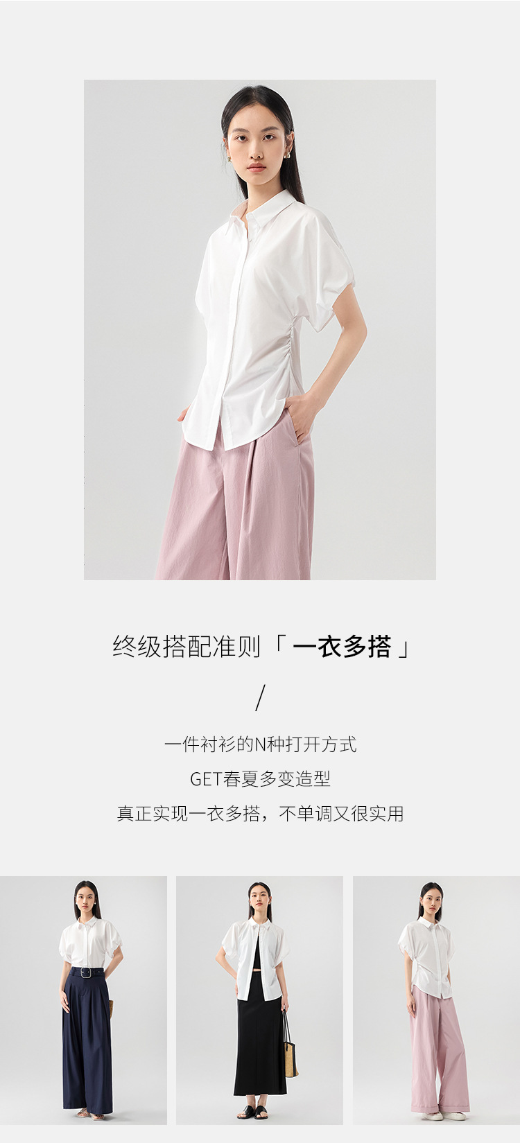 25 봄과 여름 새로운 프랑스 스타일 로맨틱 코 허리 핀치 주름 셔츠 비 다림질 쿨 스키니 젠틀 버드 짧은 소매 셔츠