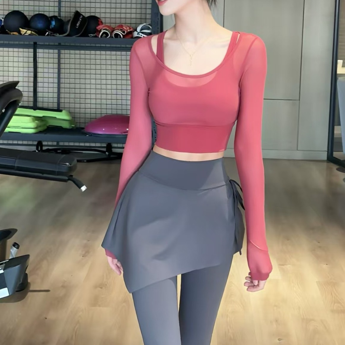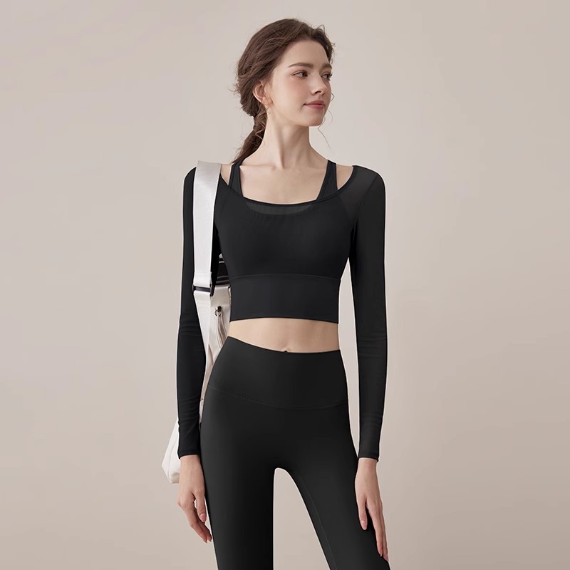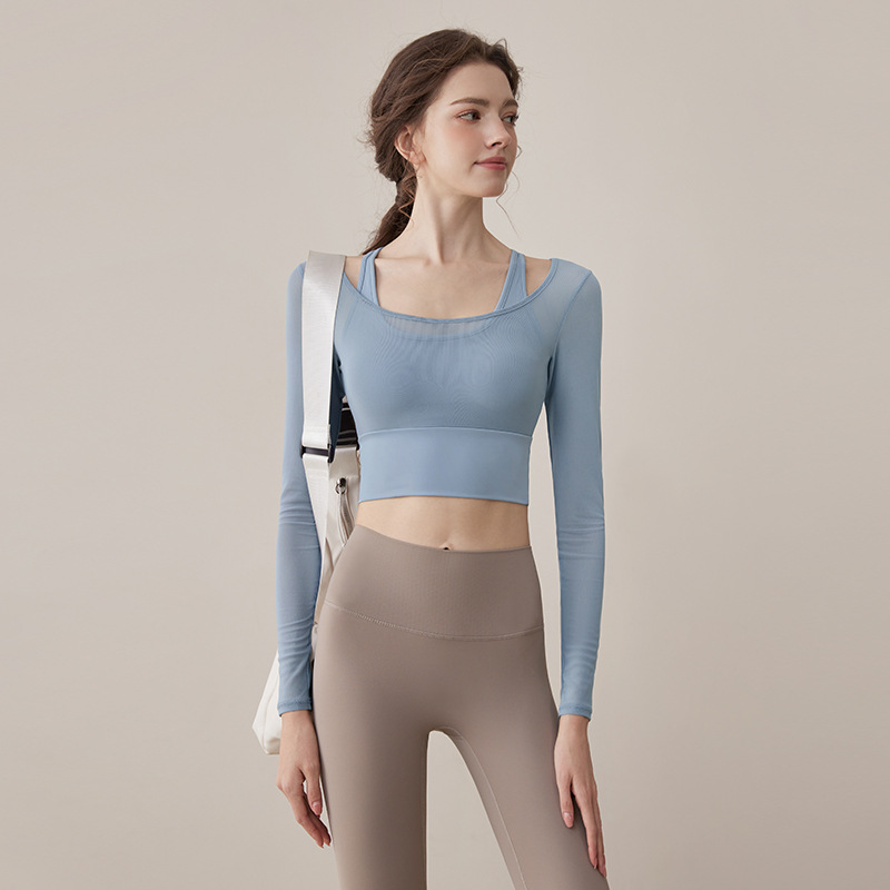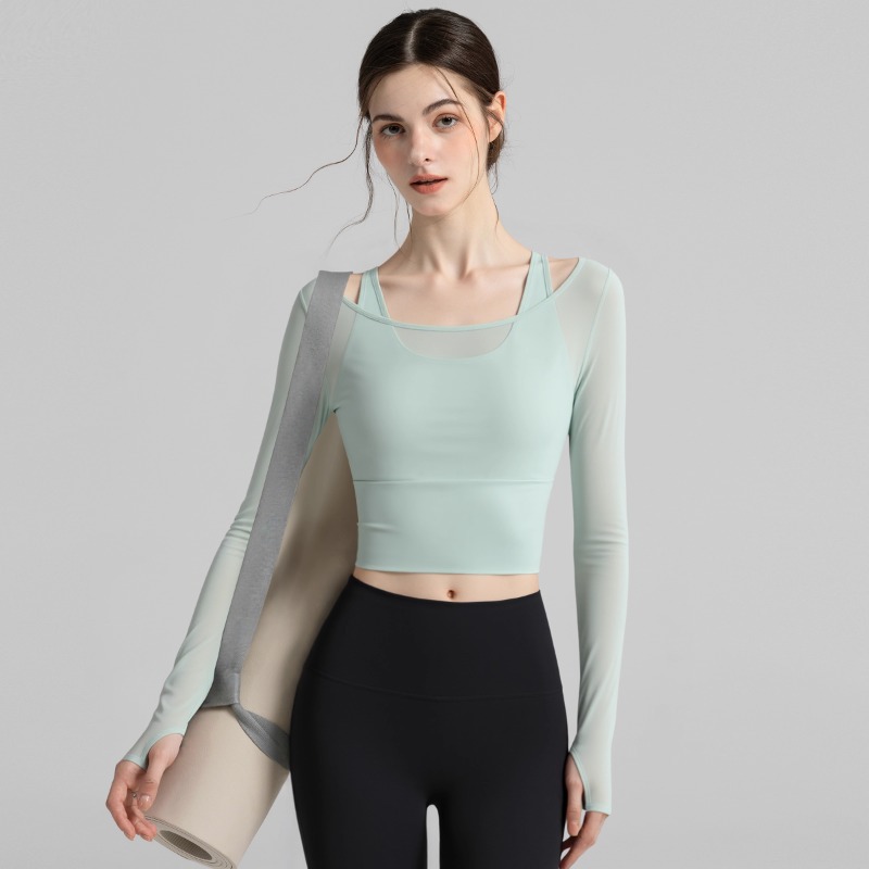 스포츠 요가 의류 여성의 봄과 가을 새로운 패션 캐주얼 메쉬 아름다운 등 긴 소매 필라테스 훈련 피트니스 탑 여성