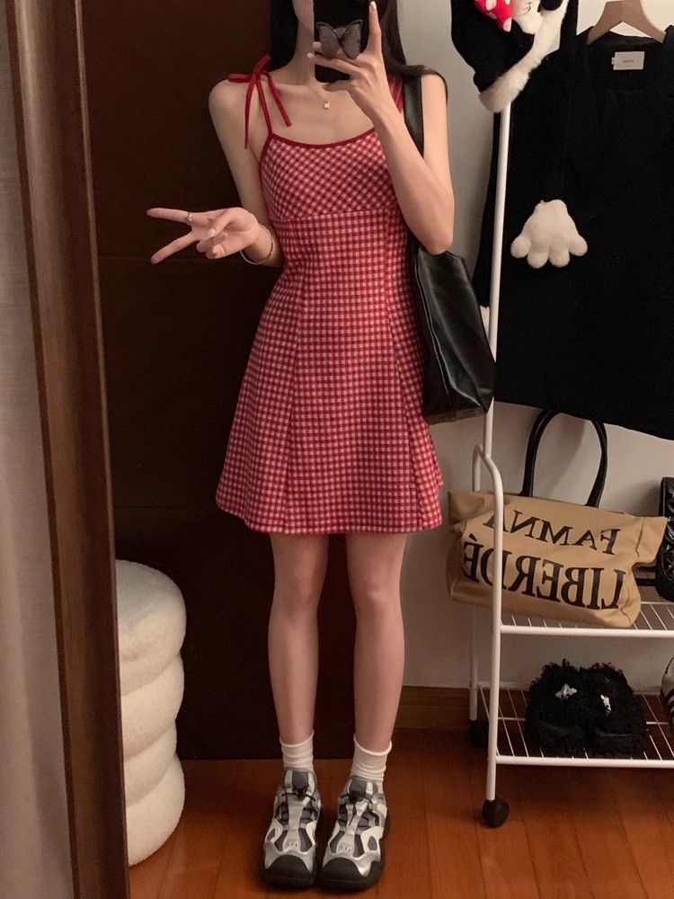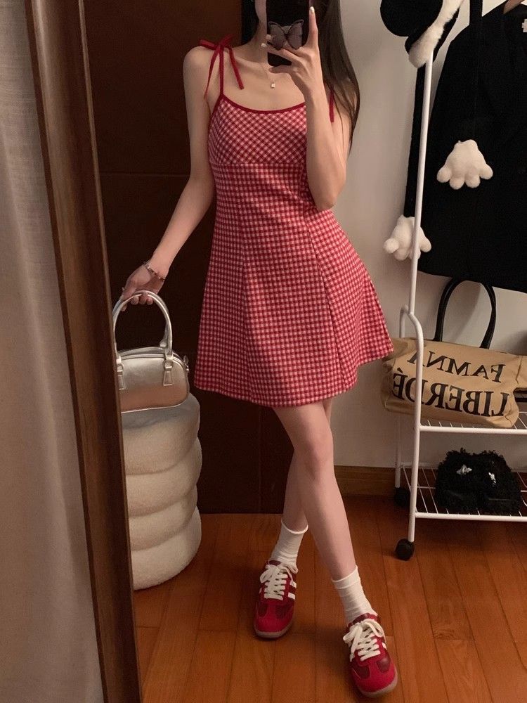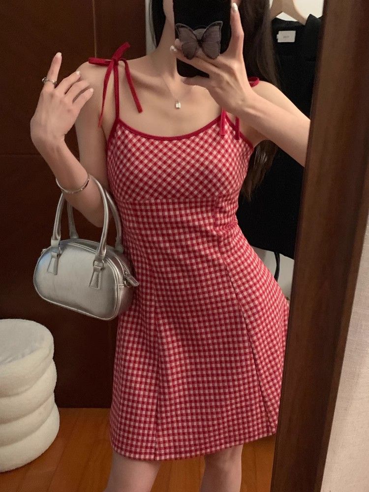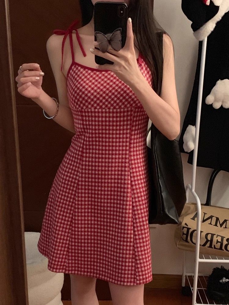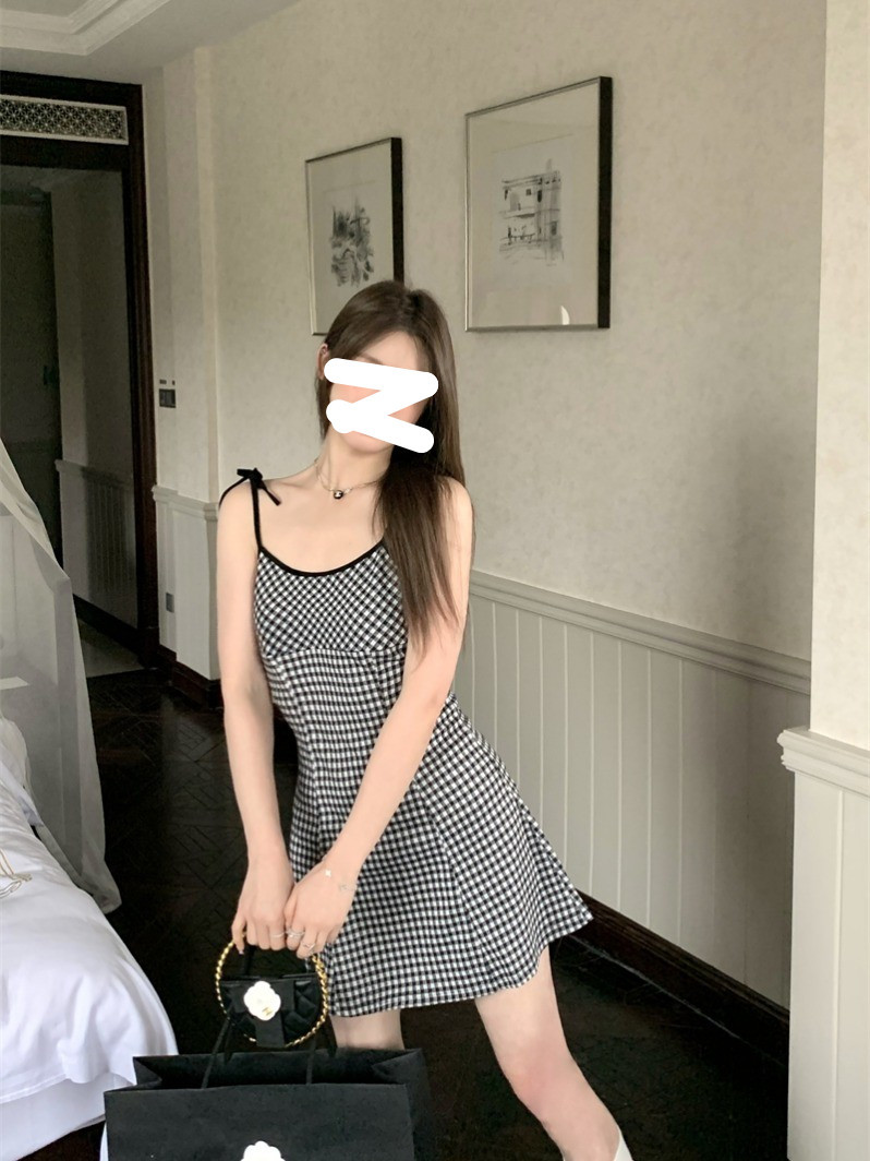 달콤한 향신료 소녀 대비 컬러 격자 무늬 슬립 스커트 여성의 이른 봄 및 여름 연령 감소 슬림 핏 A 라인 스커트 원피스 스커트 대외 무역스토어 가기