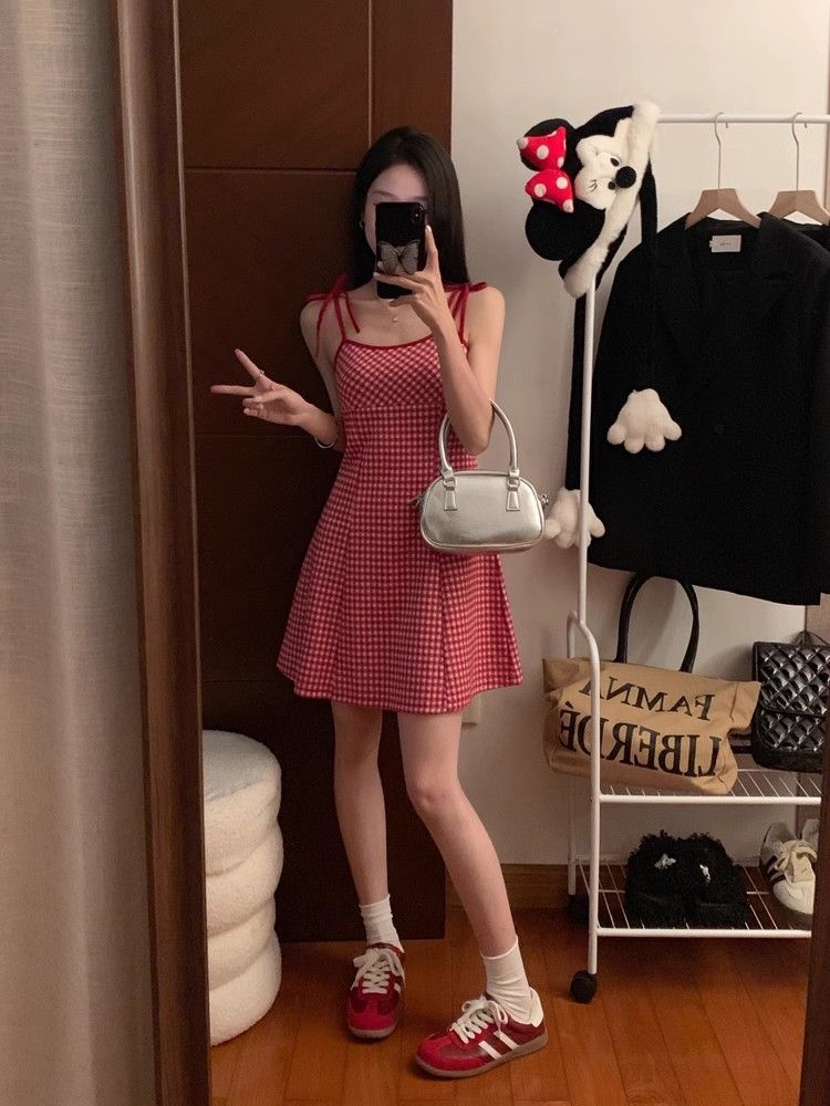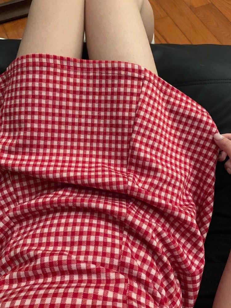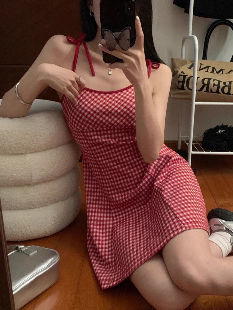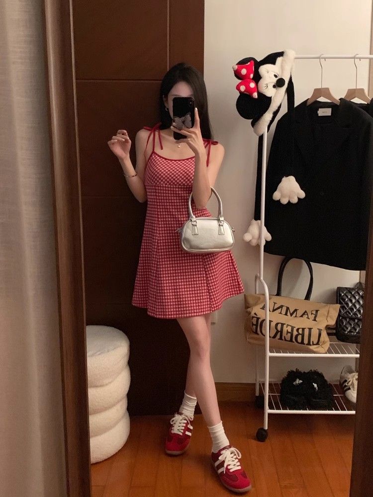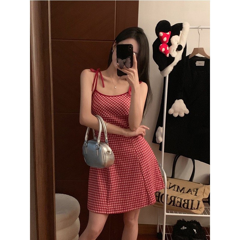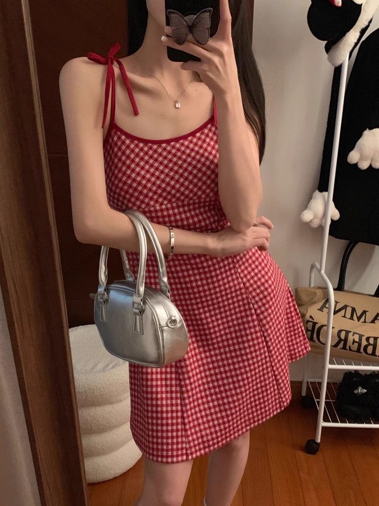 달콤한 향신료 소녀 대비 컬러 격자 무늬 슬립 스커트 여성의 이른 봄 및 여름 연령 감소 슬림 핏 A 라인 스커트 원피스 스커트 대외 무역스토어 가기