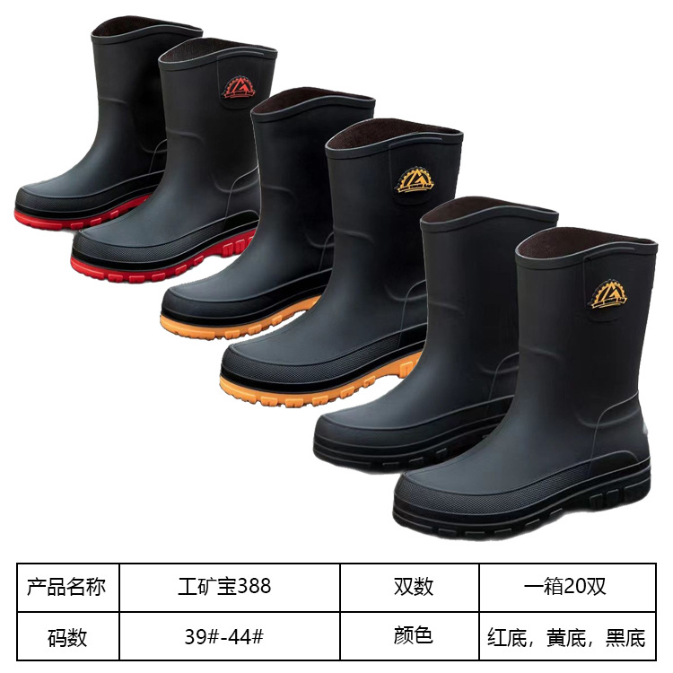 工矿宝388男中筒雨鞋25厘米高钓鱼鞋,颜色:红底,黄底,黑底3个颜色。388特点:高档磨砂鞋面,配有加厚鞋垫,加厚鞋底,加厚鞋筒,25厘米钓鱼鞋,时尚休闲款。