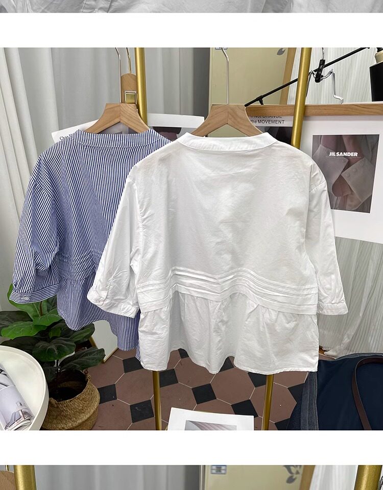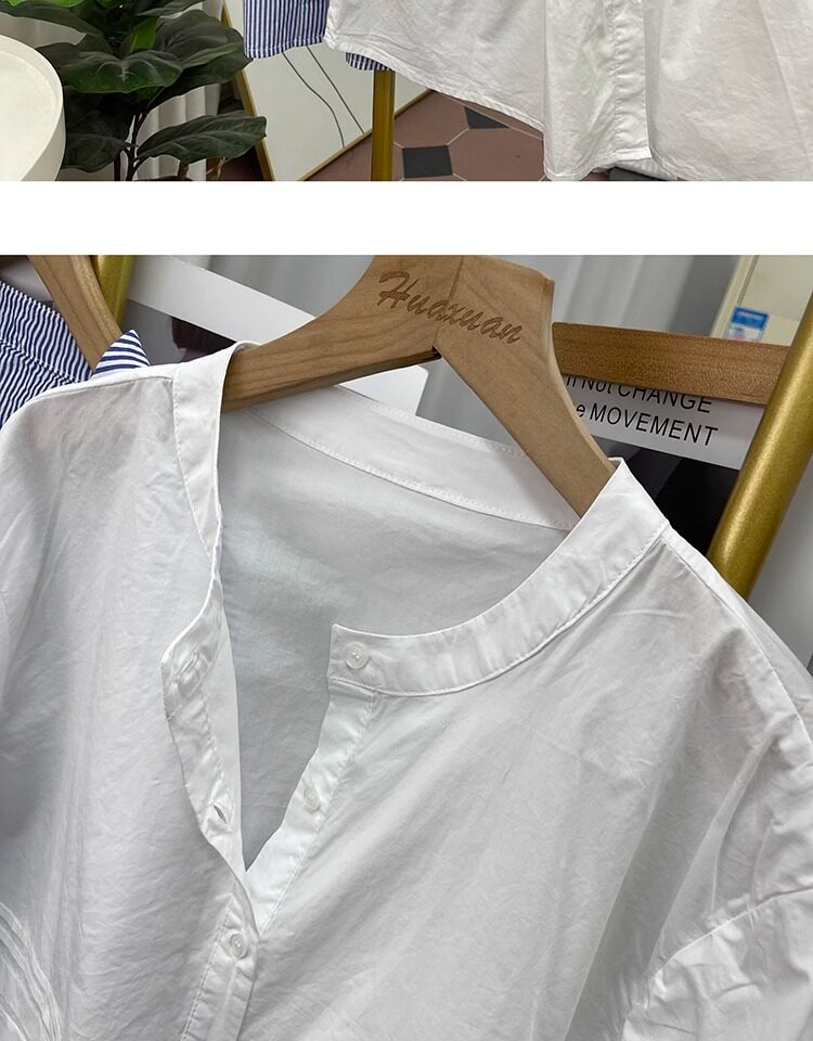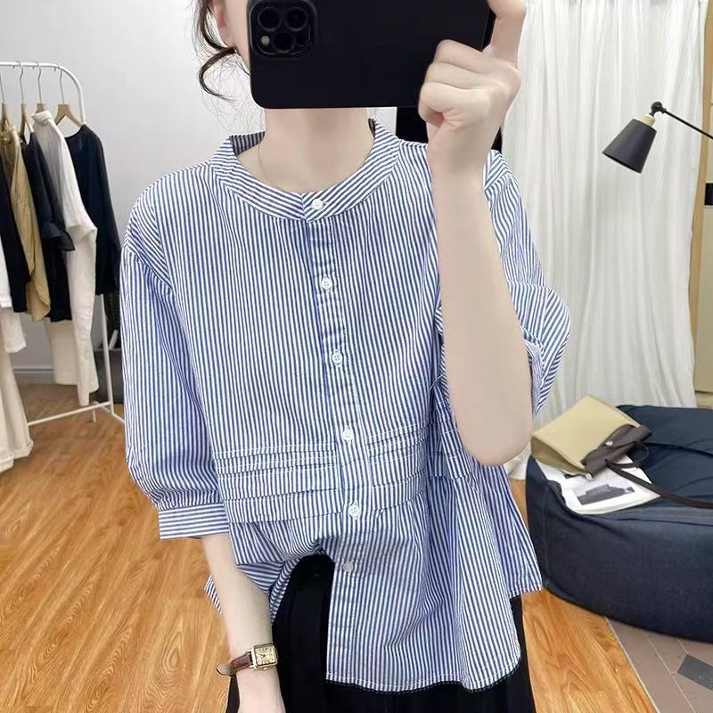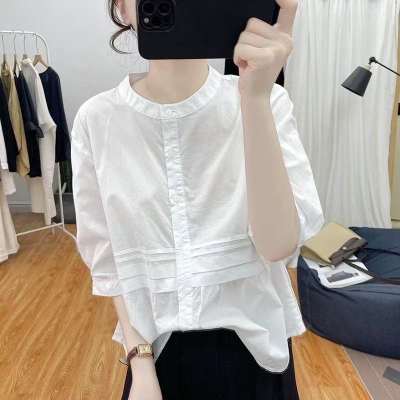 여름 랜턴 슬리브 코튼 반팔 셔츠 여성 연령 감소 루즈 탑 2025 새로운 라운드 넥 주름 슬림 셔츠스토어 가기