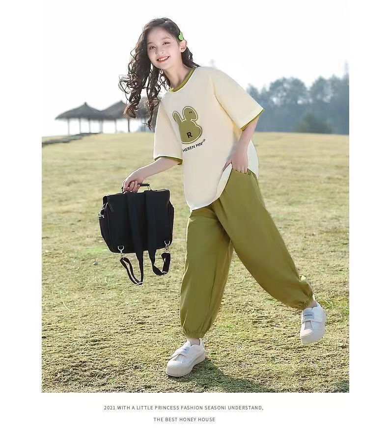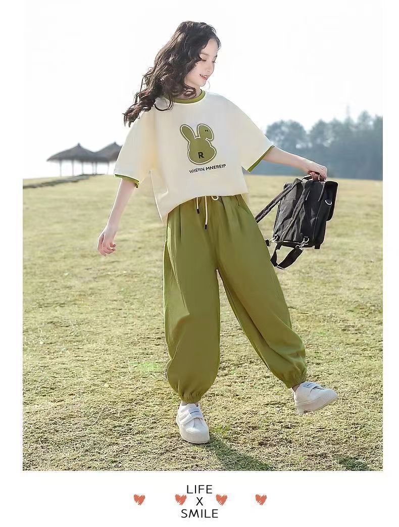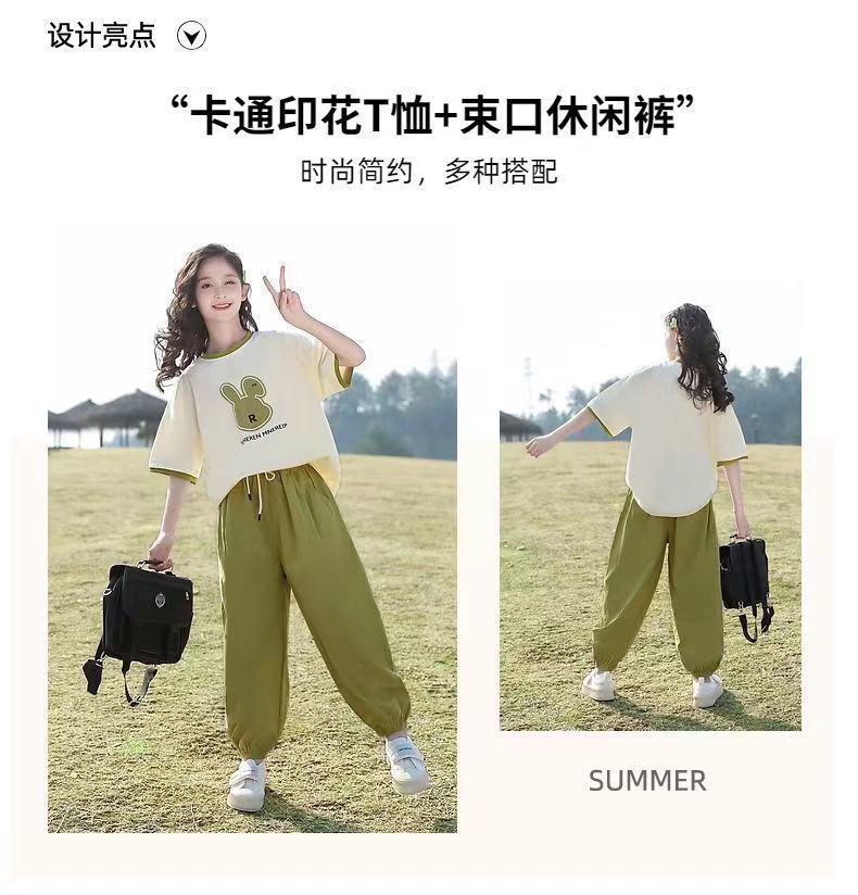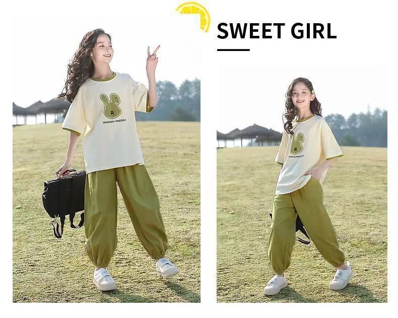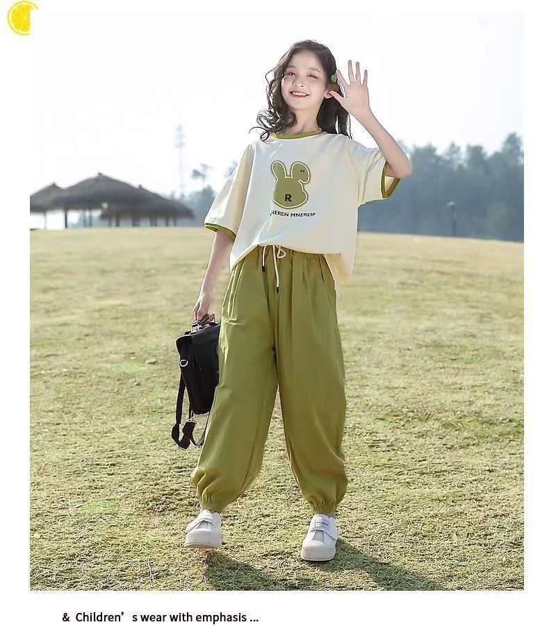 여자 여름 패션 스포츠 세트 2025 새로운 서양 스타일 유행 큰 어린이 유행 짧은 소매 바지 투피스 세트스토어 가기