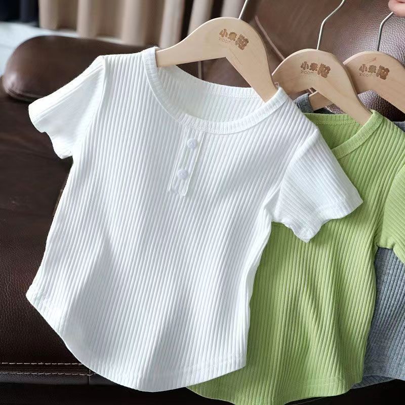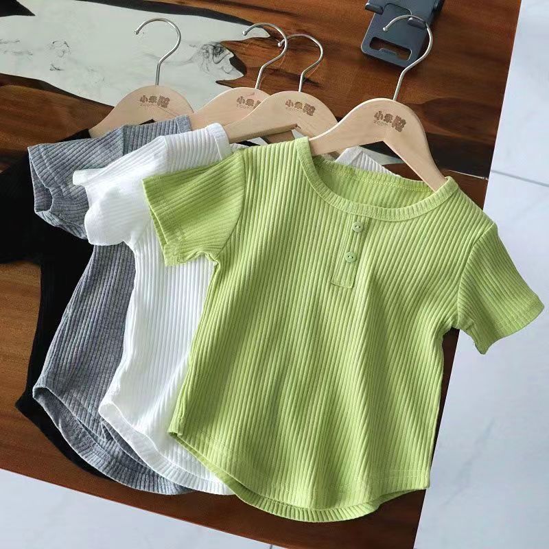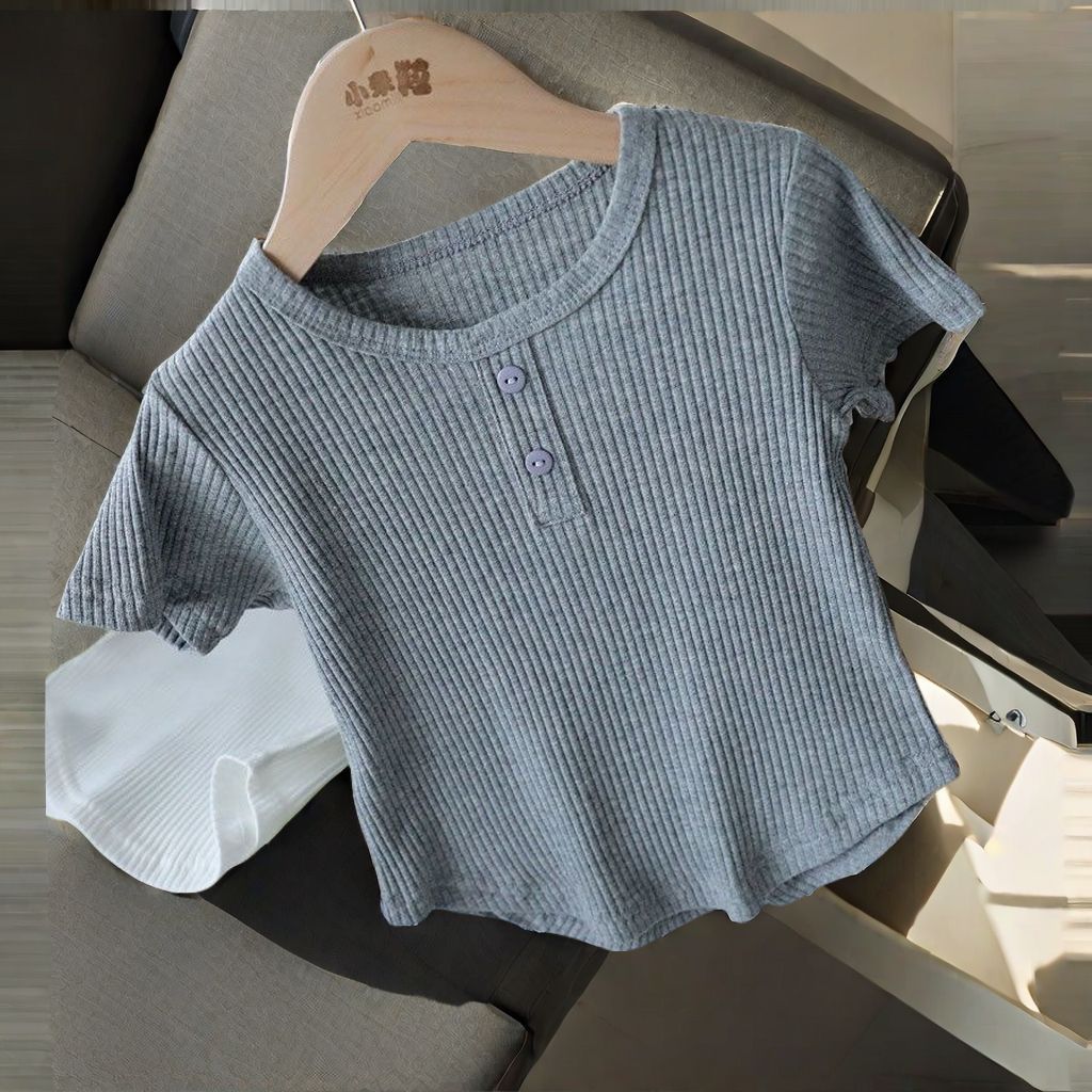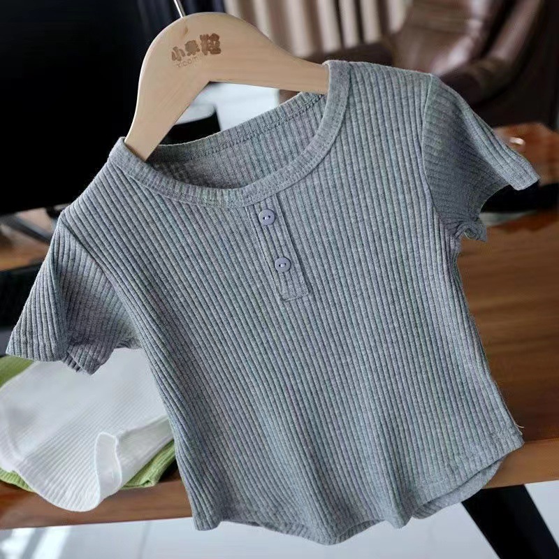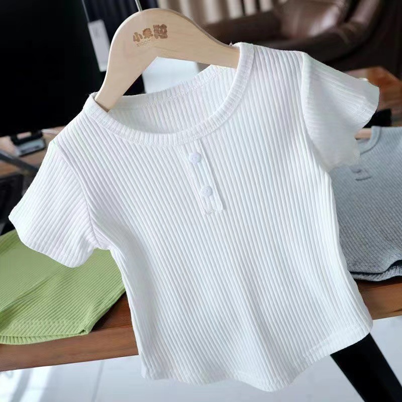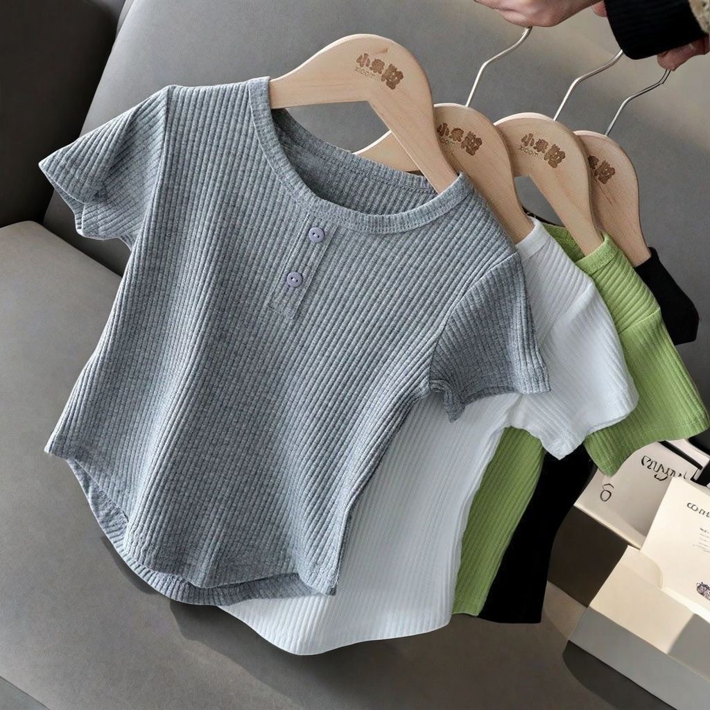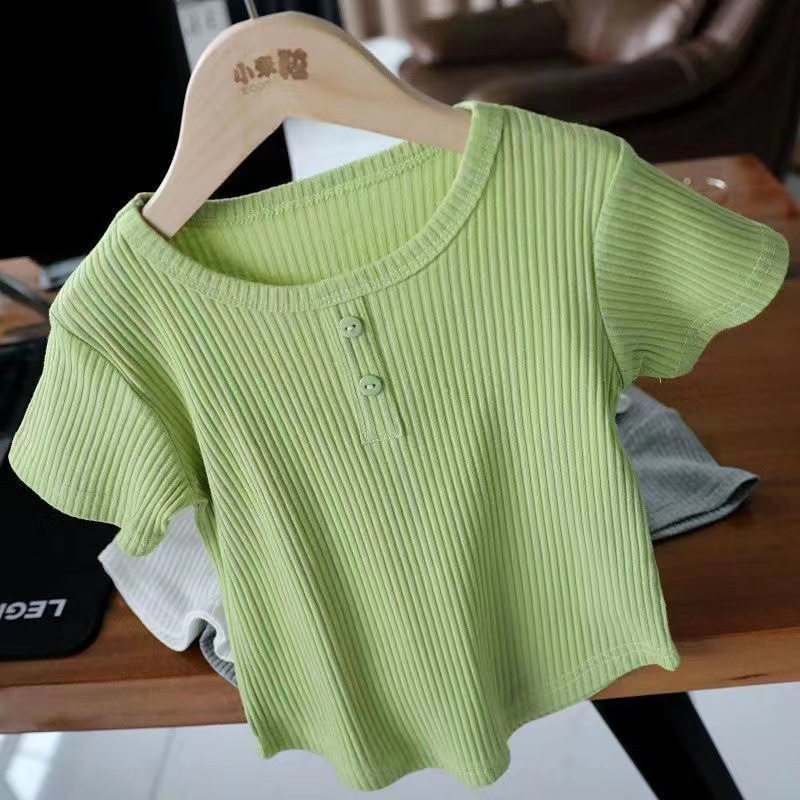 여자 반팔 티셔츠 여름 새로운 어린이 아기 솔리드 컬러 웨스턴 스타일 올 매치 하이 허리 슬림 핏 쇼트 탑스토어 가기