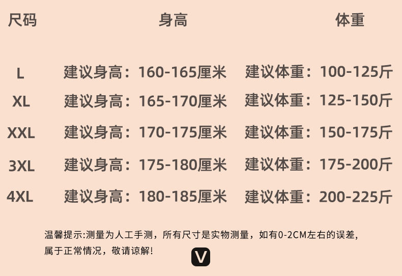 男款 90-180斤尺码表