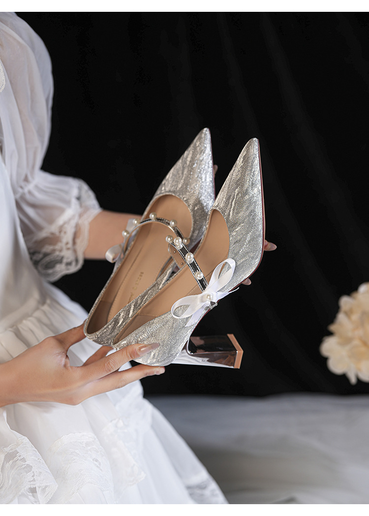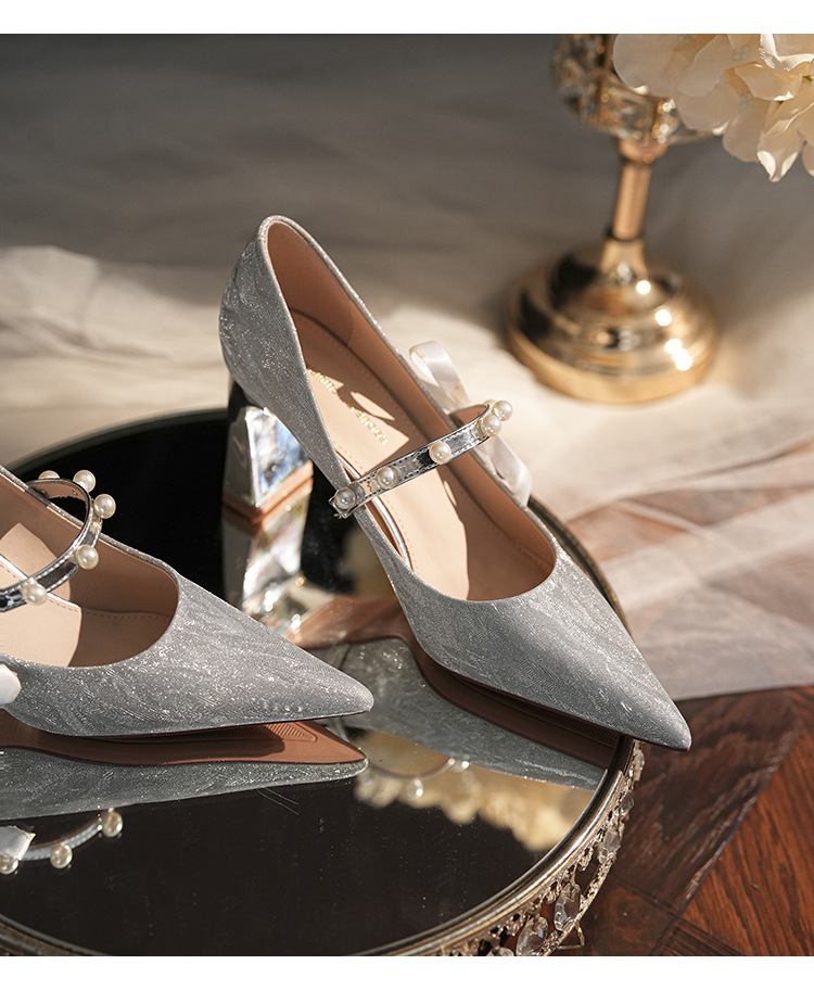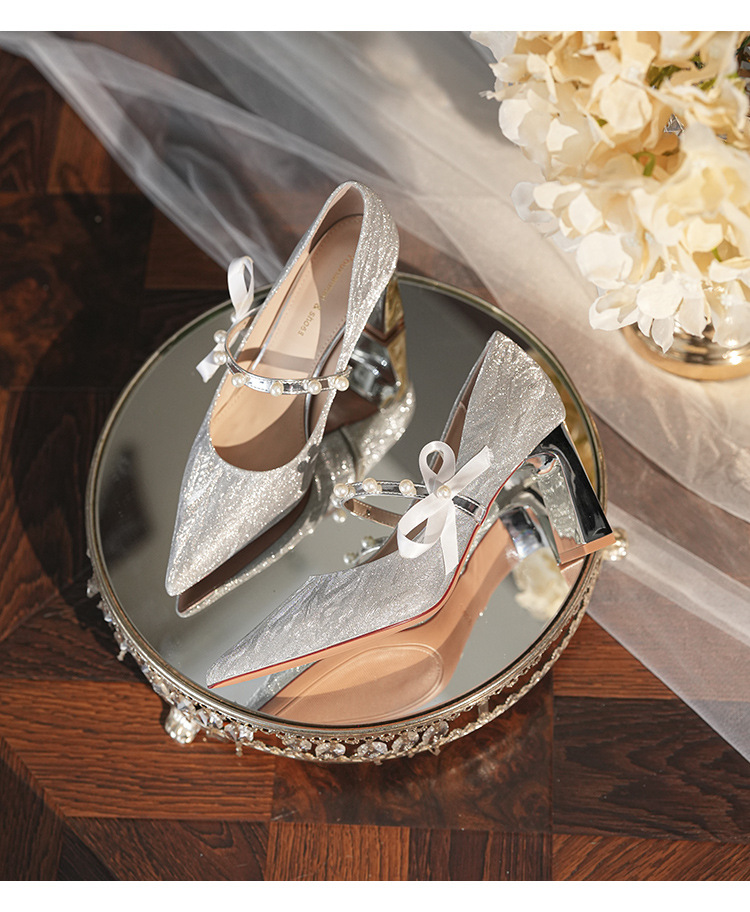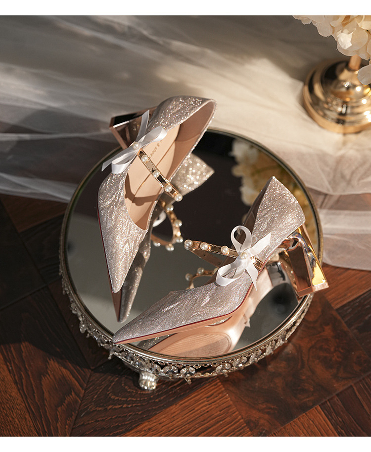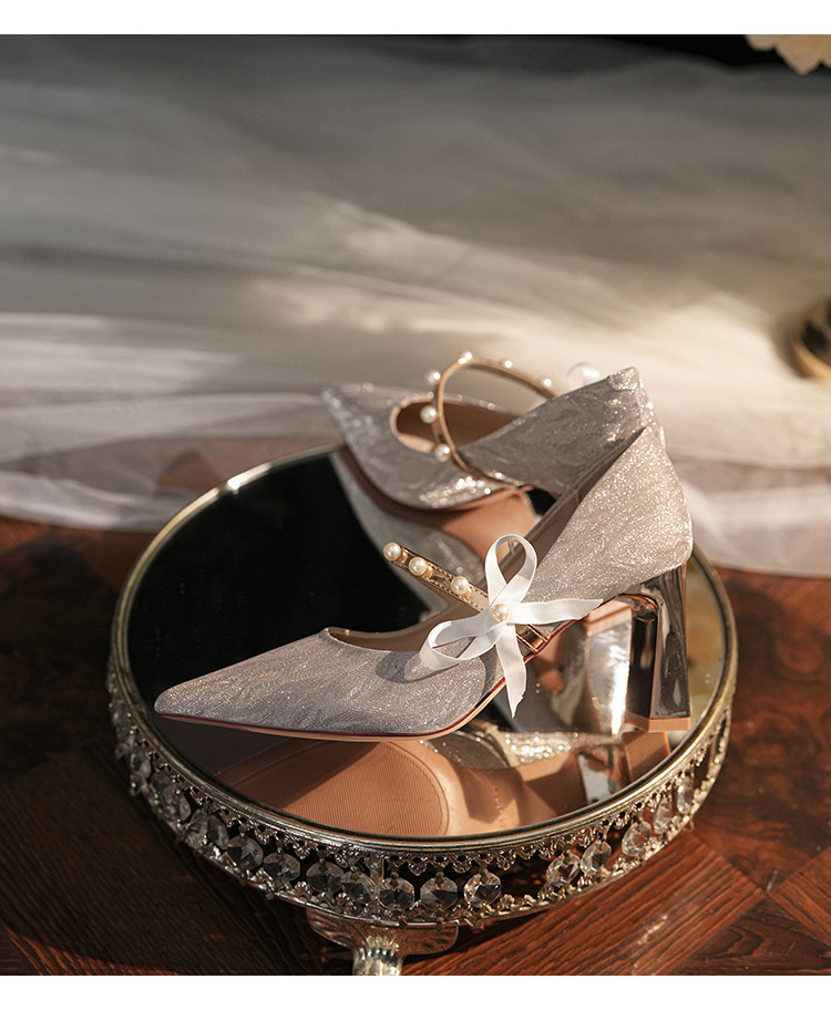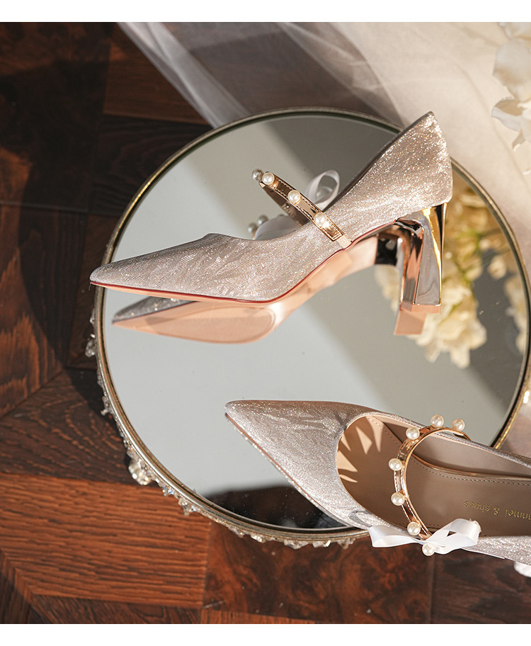 7777-2 여성용 호피무늬 하이힐 2025 봄 신작 뾰족한 굽 진주 원 스트랩 메인 거즈 Xiuhe 웨딩 슈즈스토어 가기