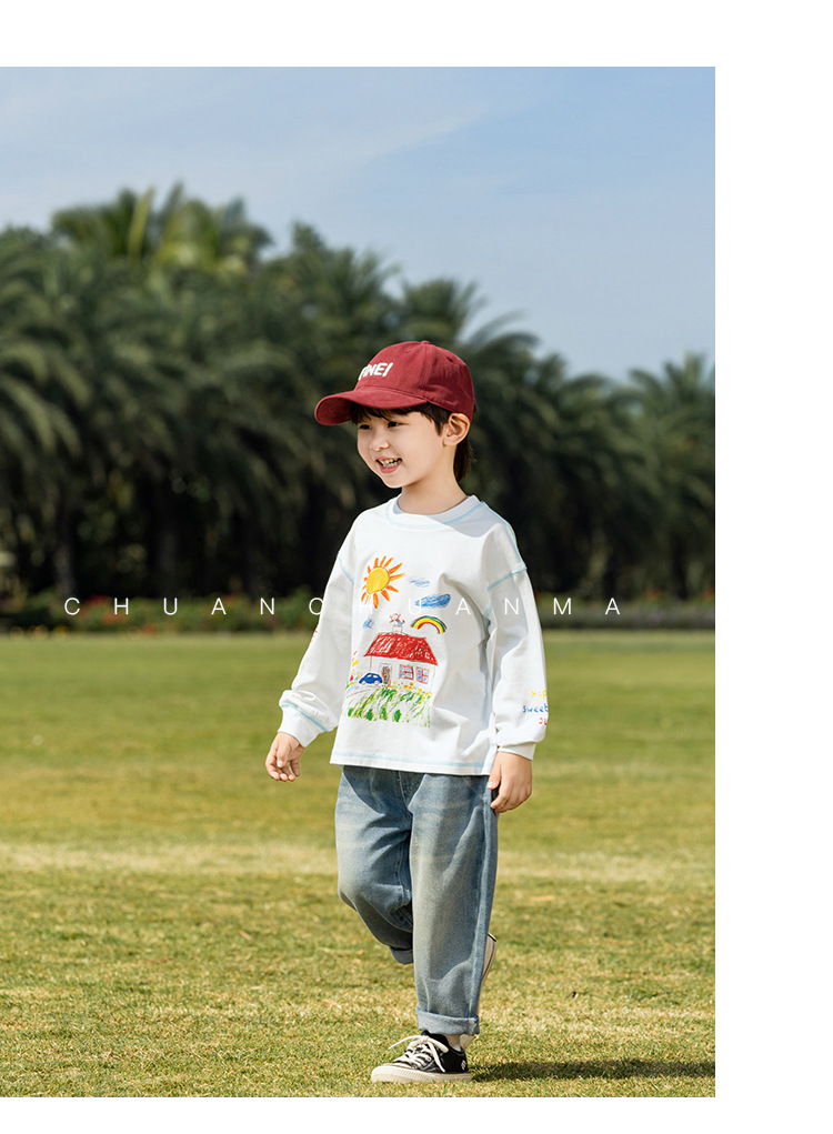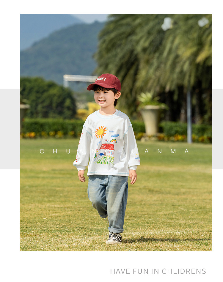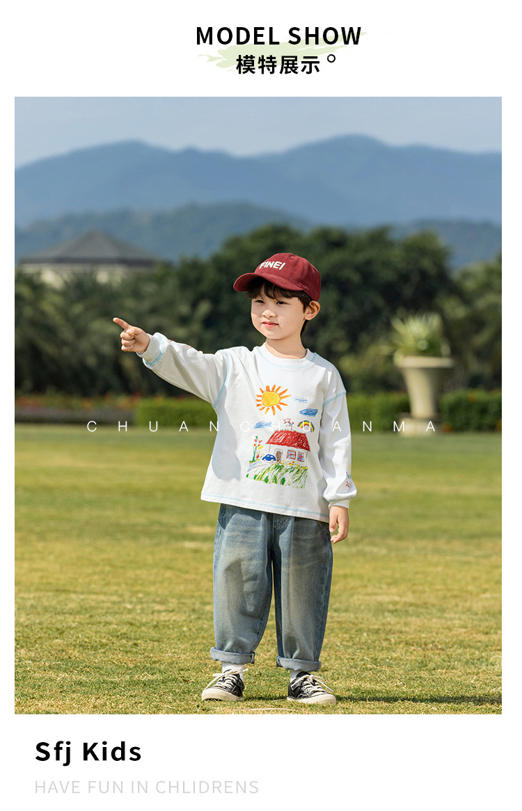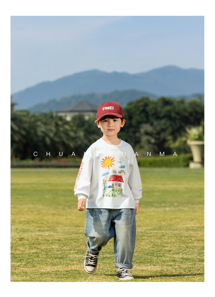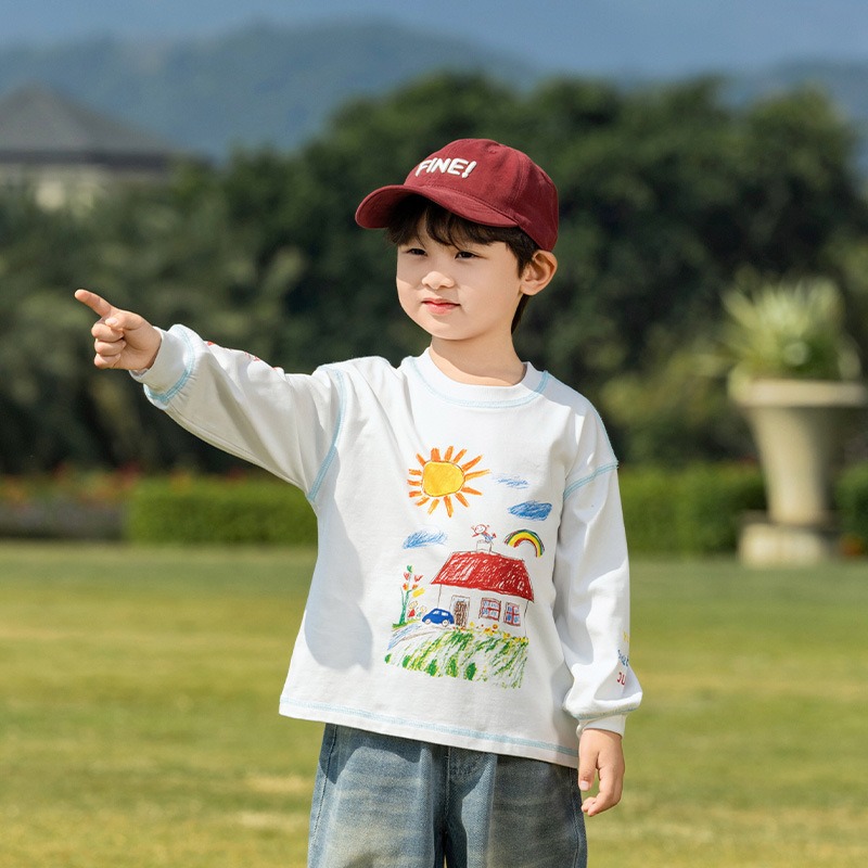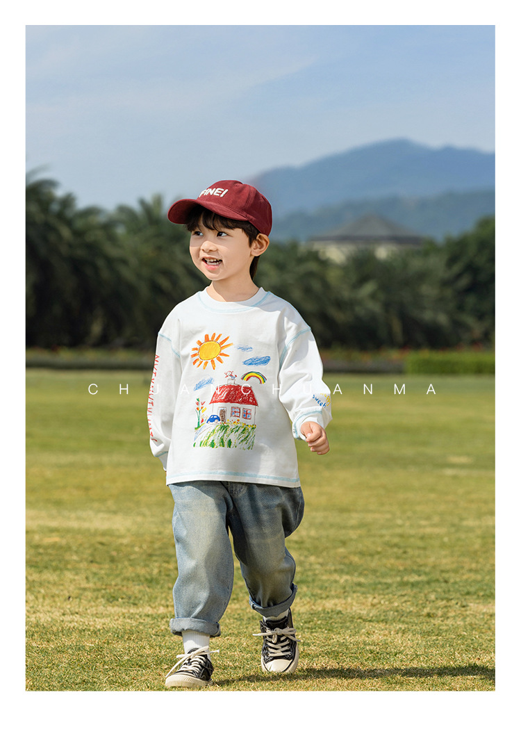 샤나오 2025 봄 새로운 아동복 한국 스타일 귀여운 면 긴 소매 손으로 그린 인쇄 티셔츠 소년 소녀스토어 가기
