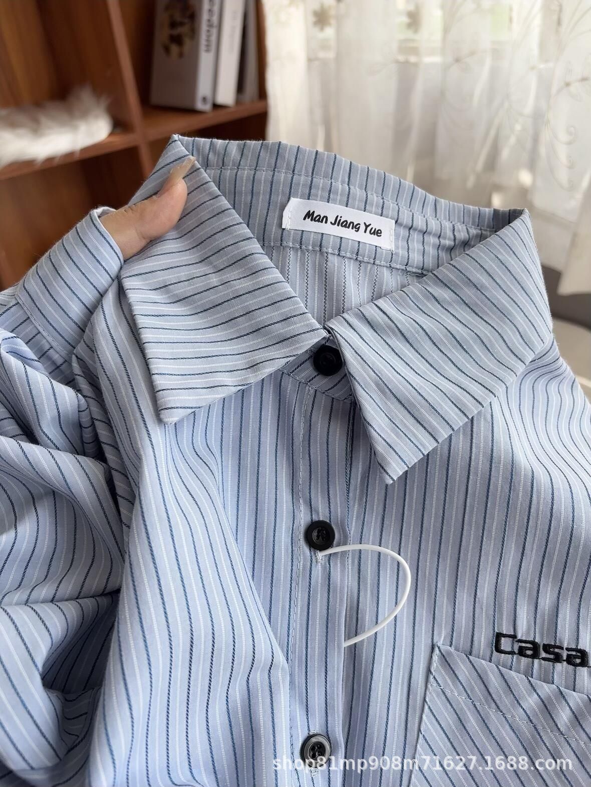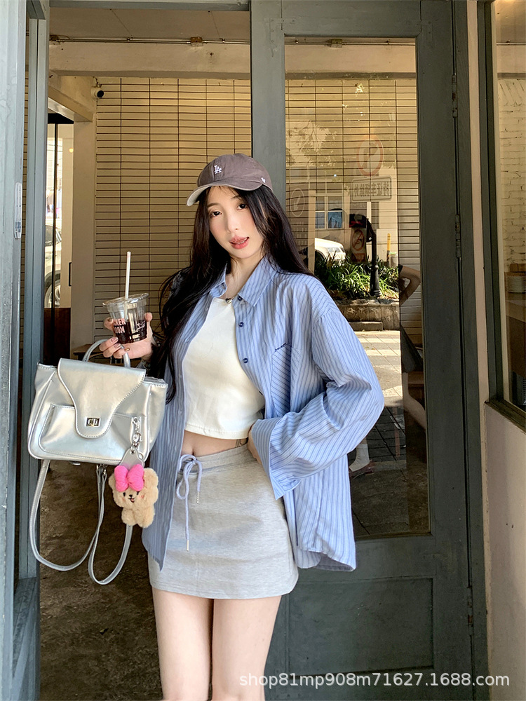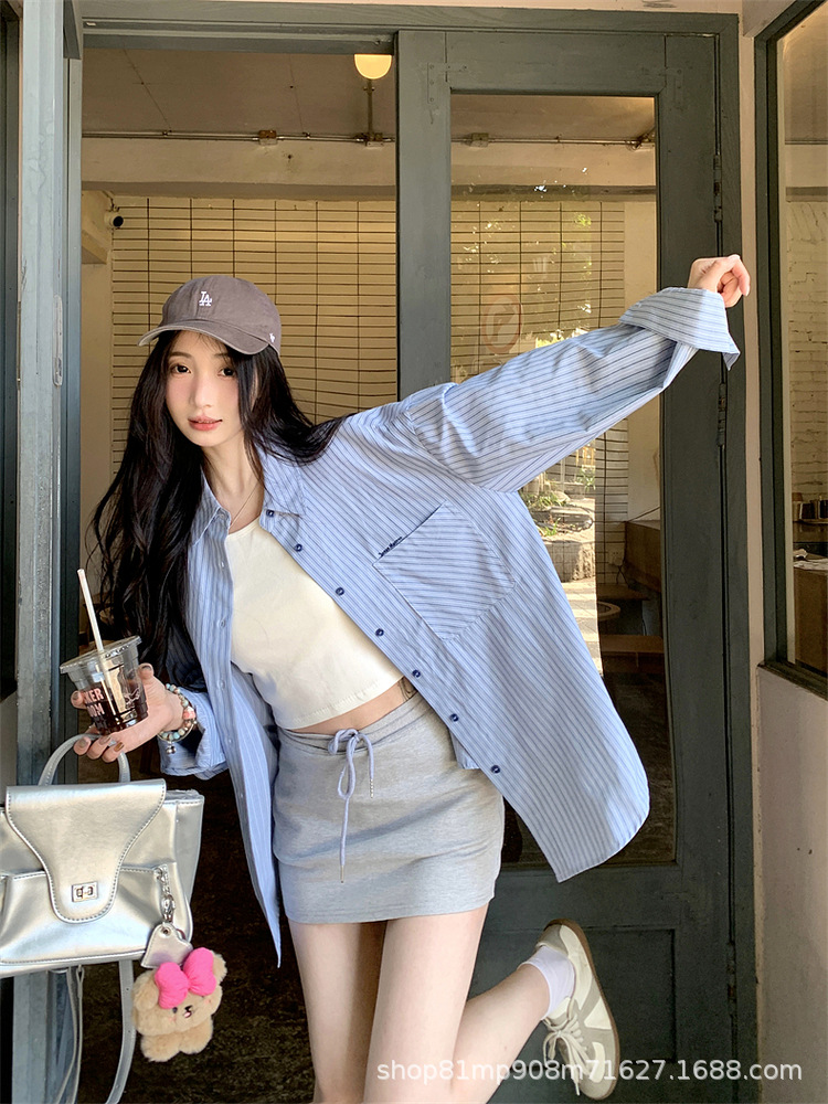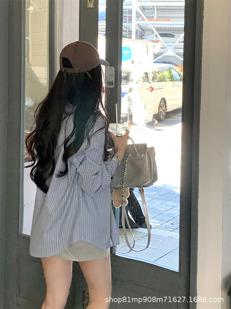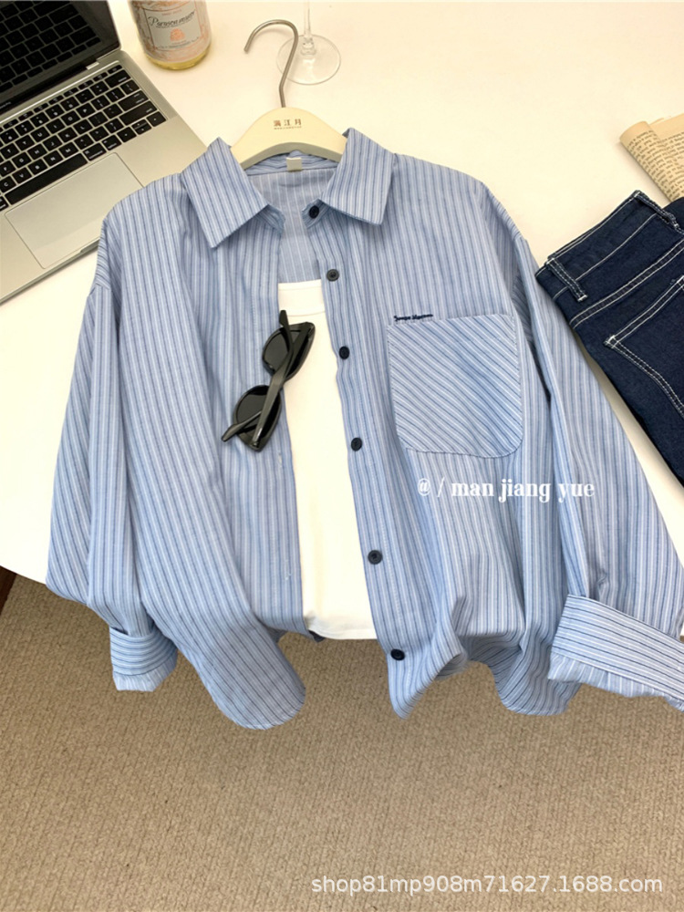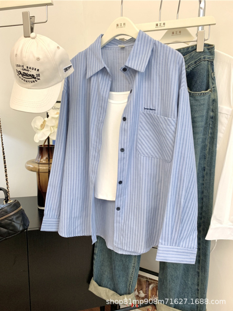 초가을 블루 스트라이프 셔츠 일본 스타일 여성 가을 의류 2025 신상 프렌치 스타일 긴팔 루즈 셔츠 여성용스토어 가기