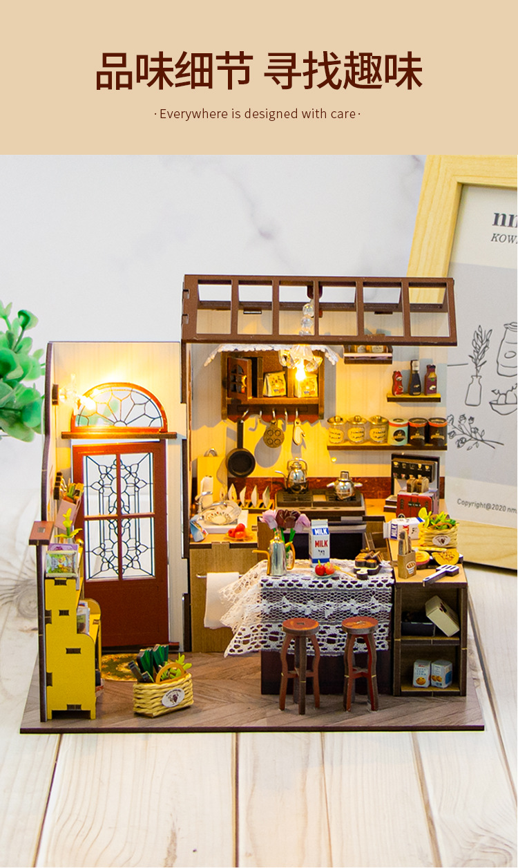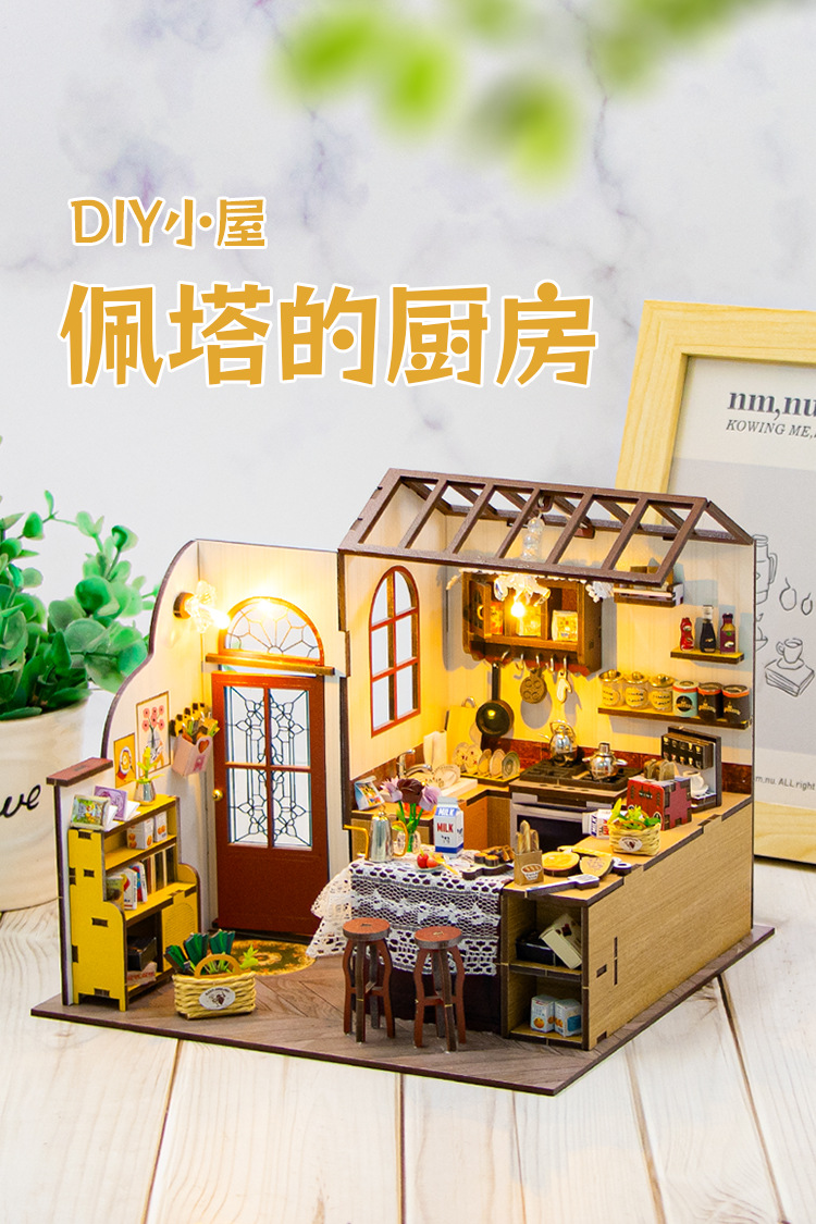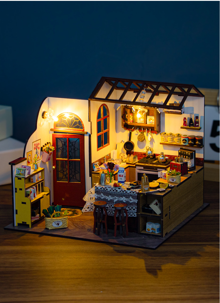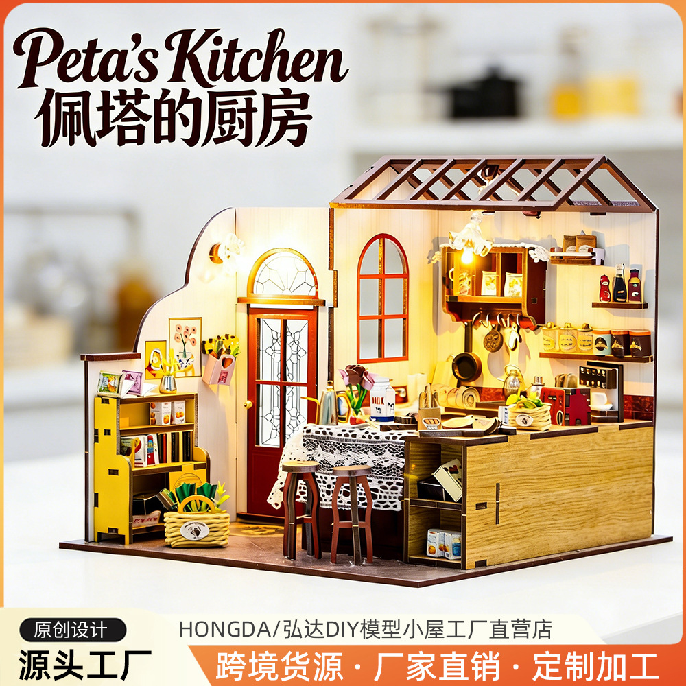 홍다 미니어처 부엌 DIY 퍼즐 수제 인형 집 모델 3D 나무 조립 인터넷 빨간 장난감 국경스토어 가기