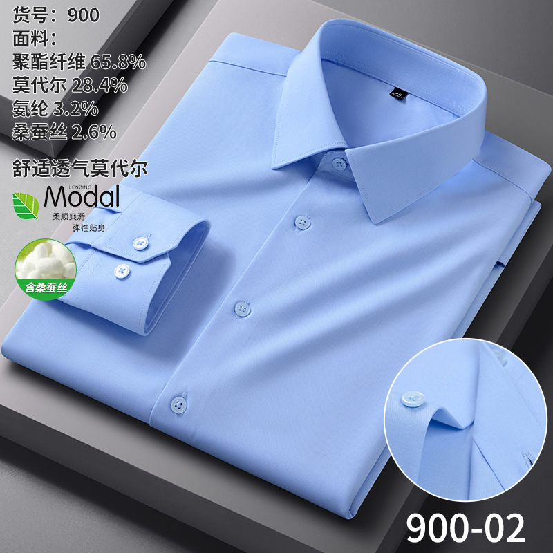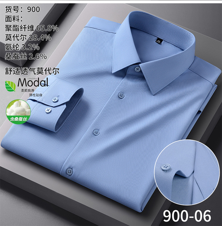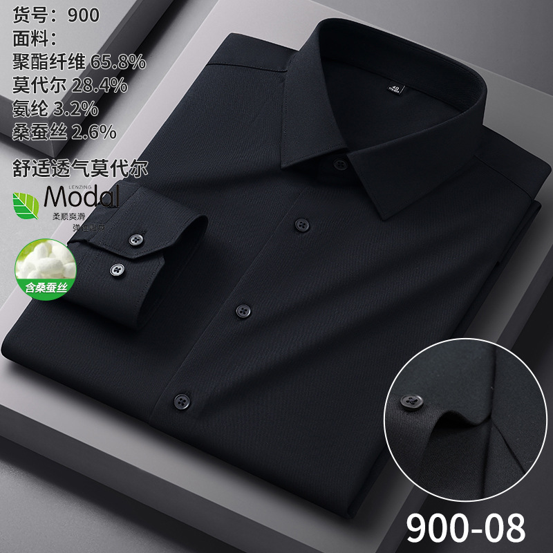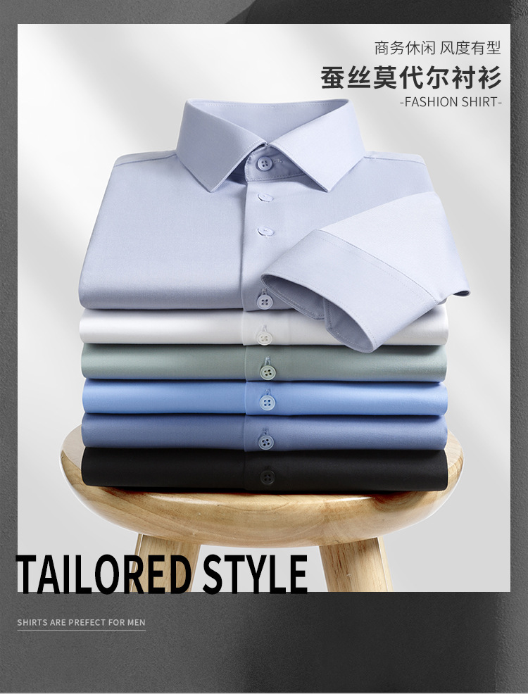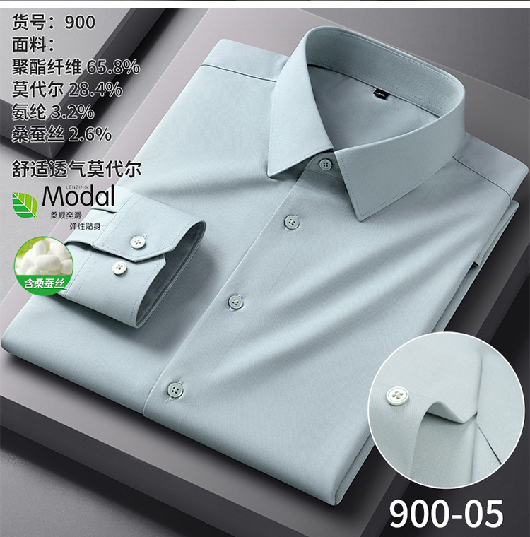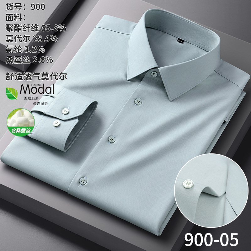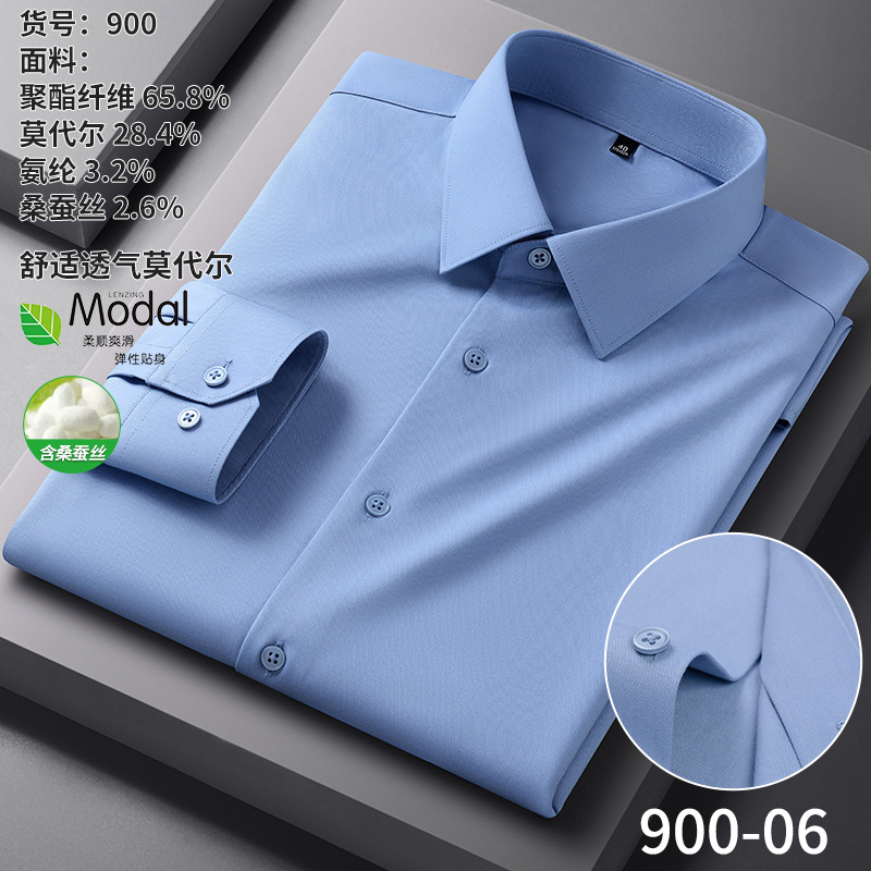 【신상품】남성용 멀버리 실크 긴팔 노아이론 셔츠 모달 비즈니스 캐주얼 신축성 솔리드 컬러 셔츠 면접용