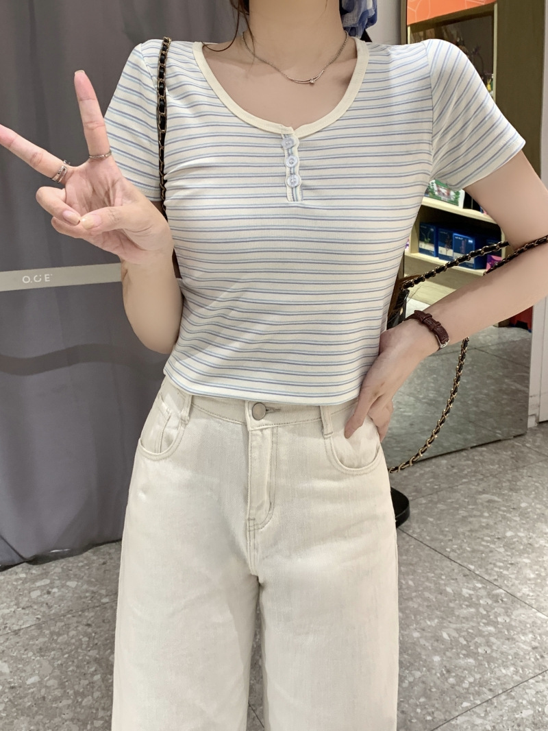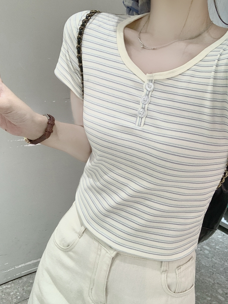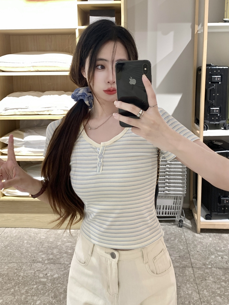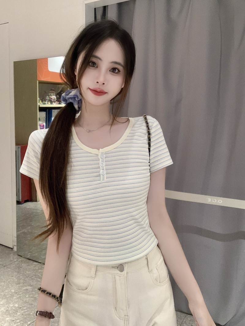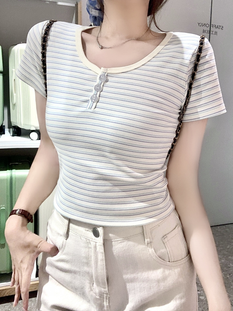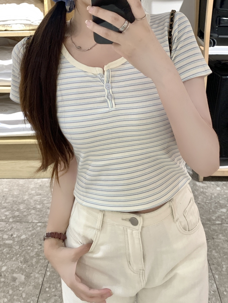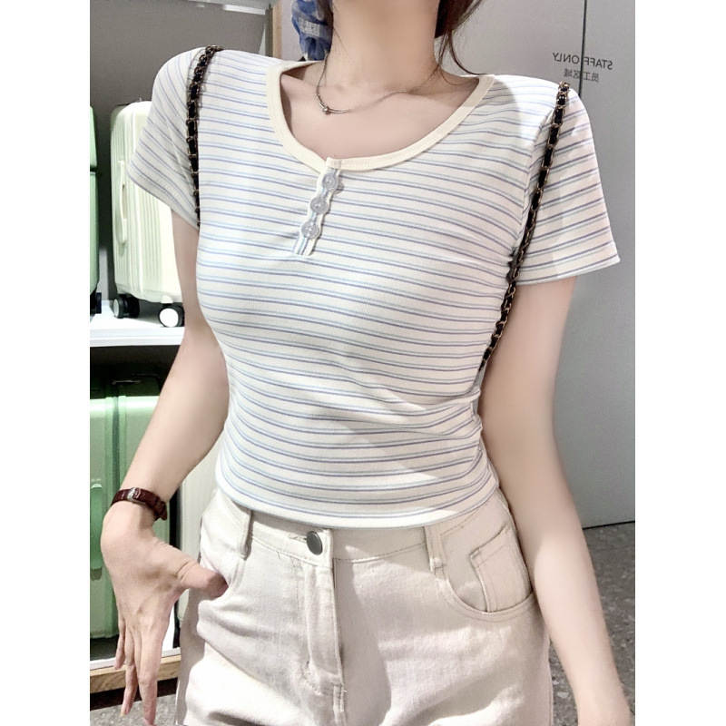 2026년 여름 신상 스트라이프 반팔 티셔츠, 여성용 슬림핏 숏탑, 프론트 숄더 디자인, 상큼하고 예술적인 소녀 스타일 상의스토어 가기