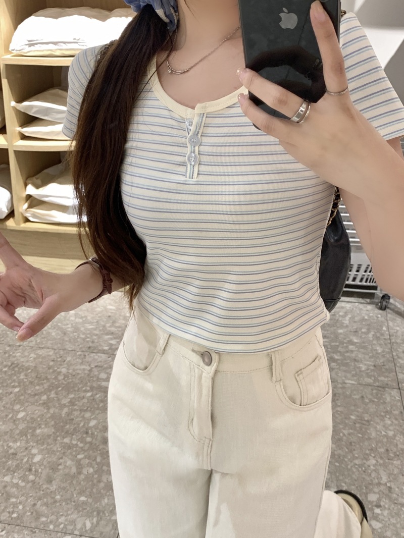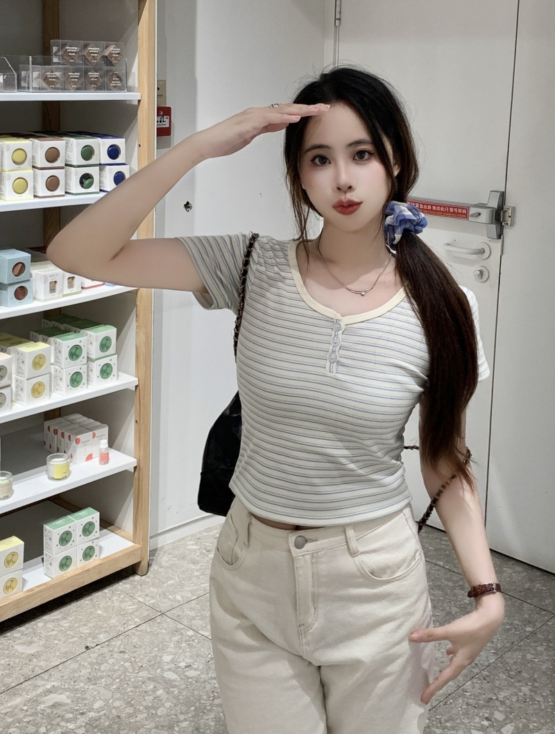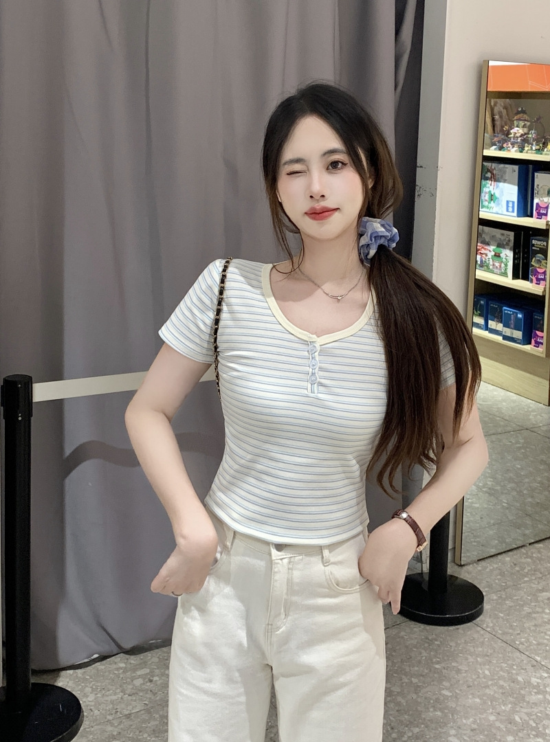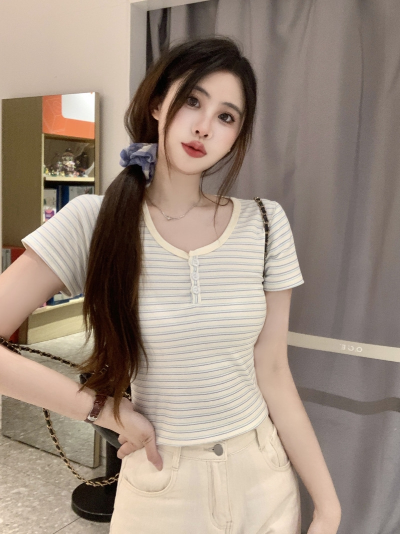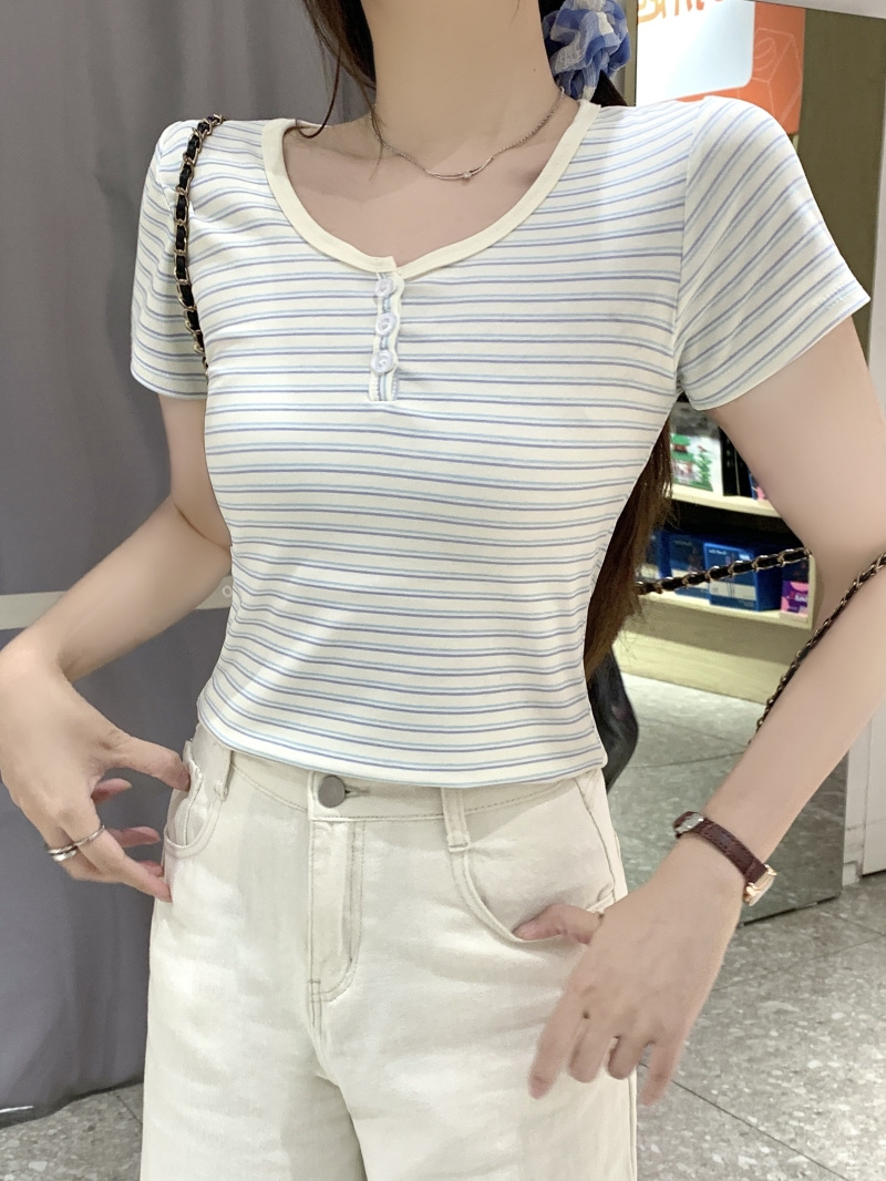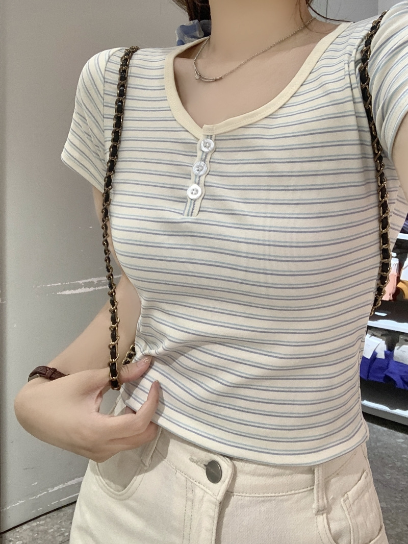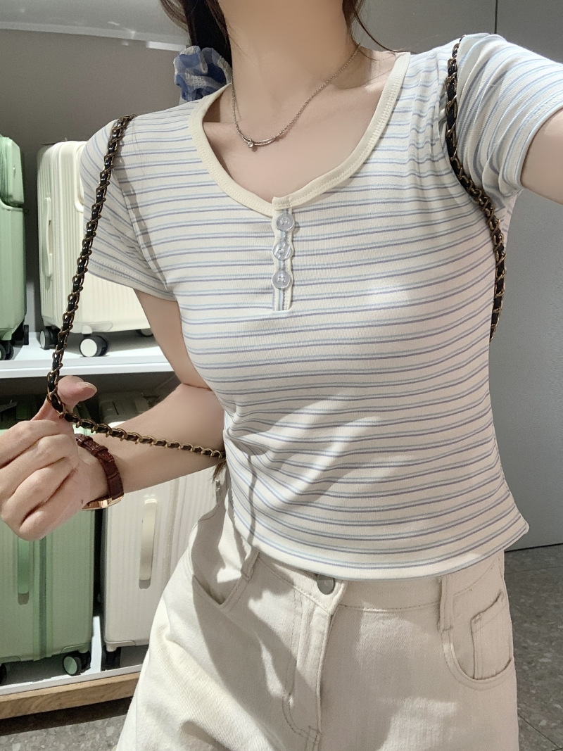 2026년 여름 신상 스트라이프 반팔 티셔츠, 여성용 슬림핏 숏탑, 프론트 숄더 디자인, 상큼하고 예술적인 소녀 스타일 상의스토어 가기