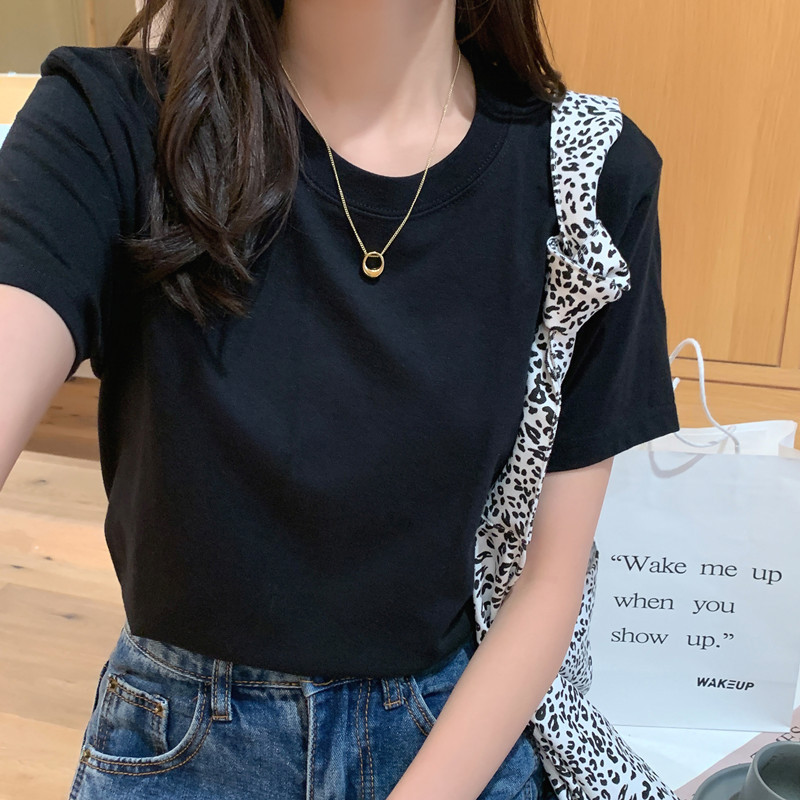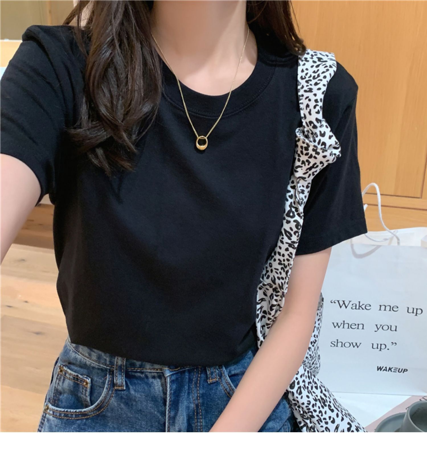 어깨 흰색 반팔 티셔츠 여성용 여름 얇은 느슨한 단색 기본 단순 슬리밍 코튼 탑