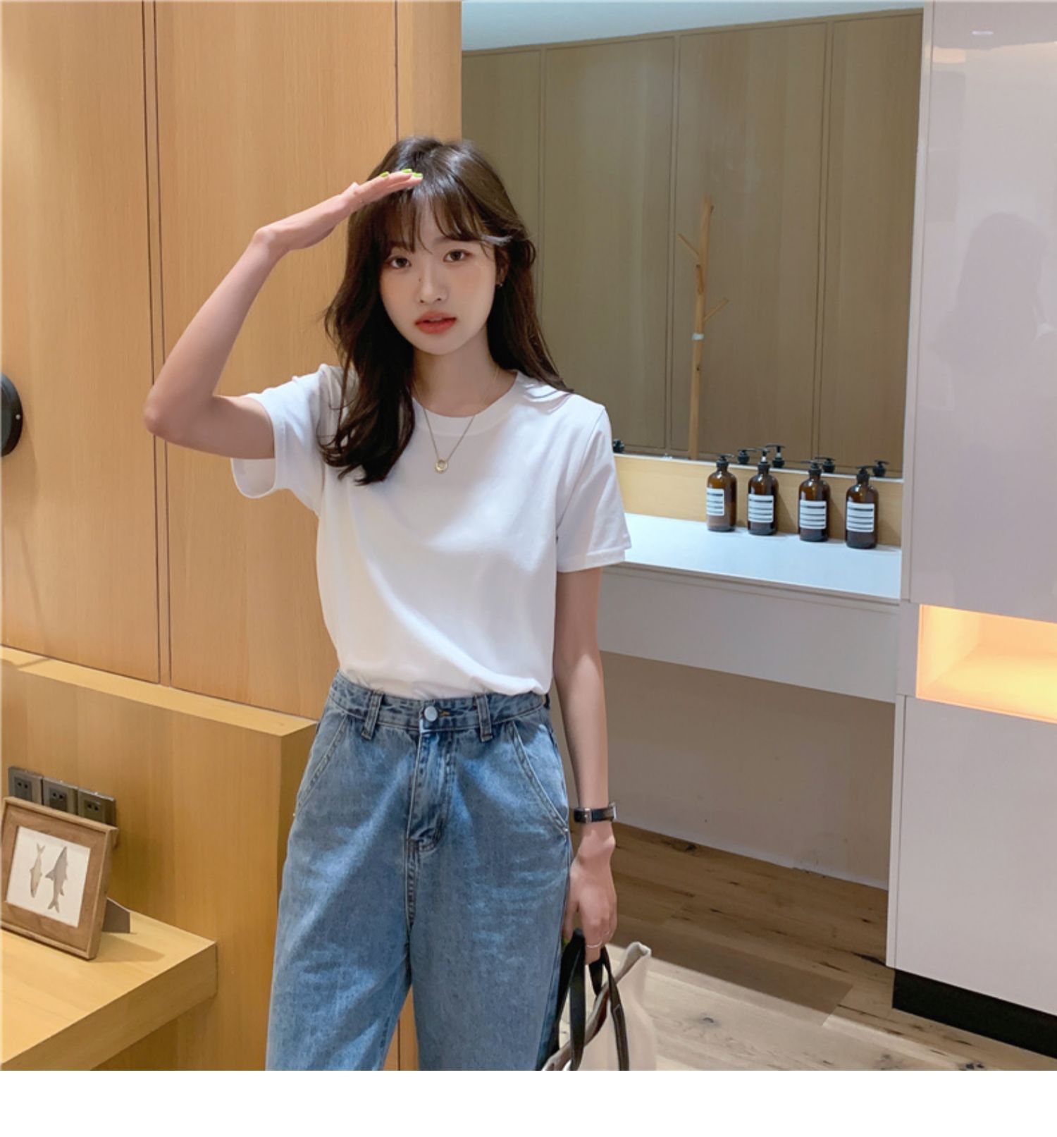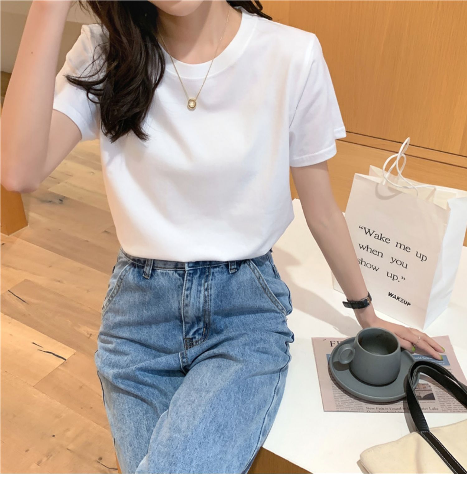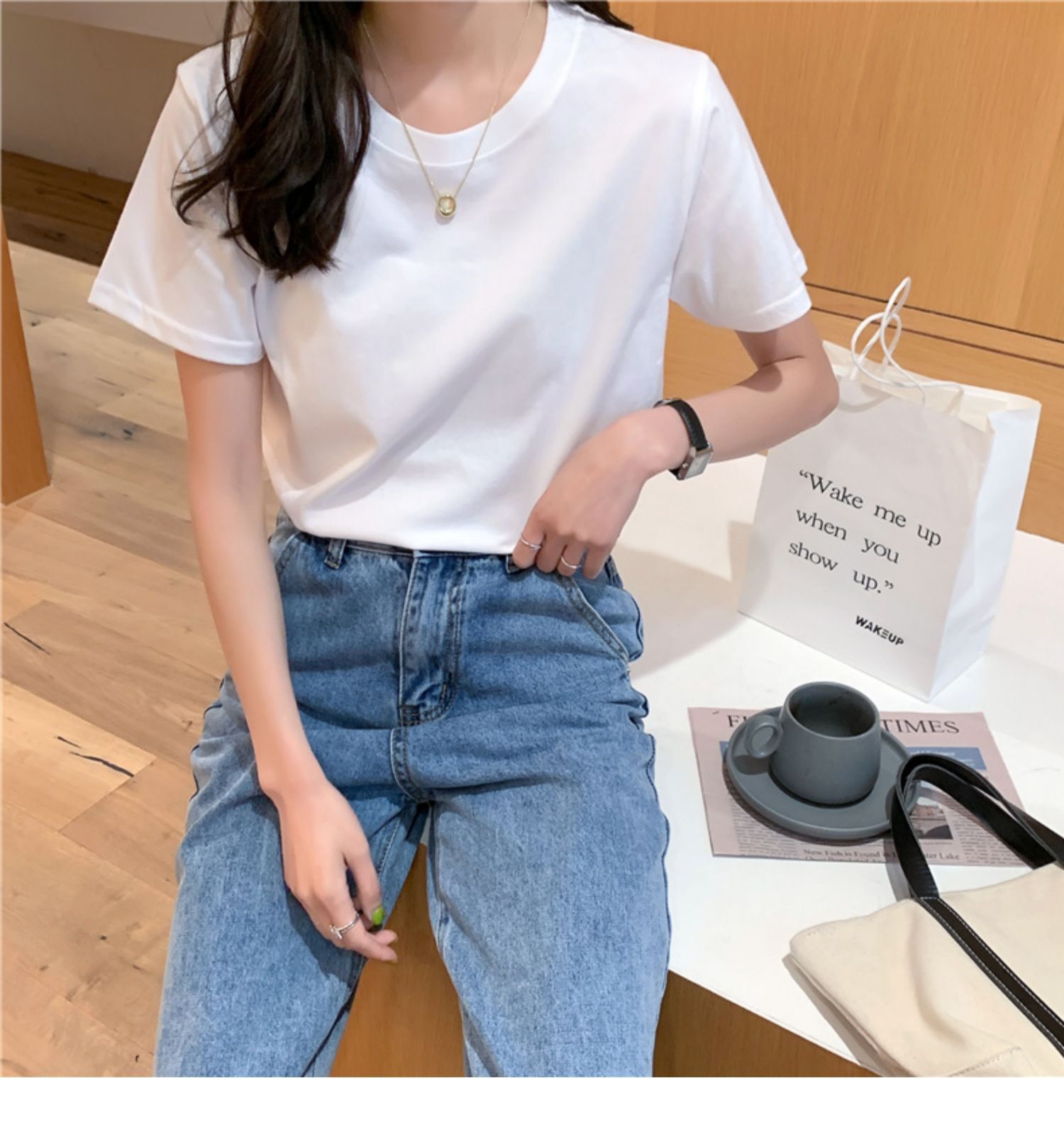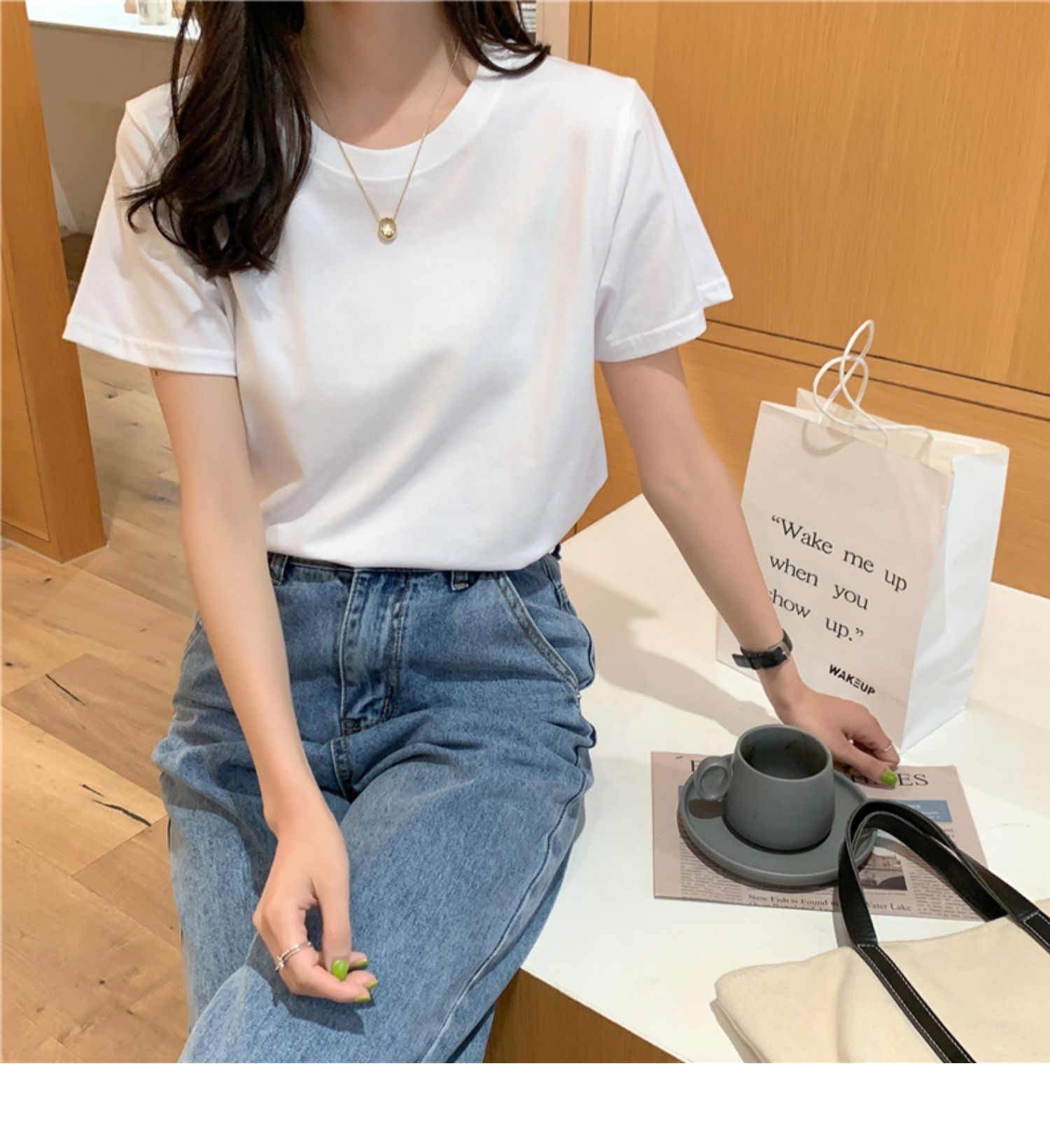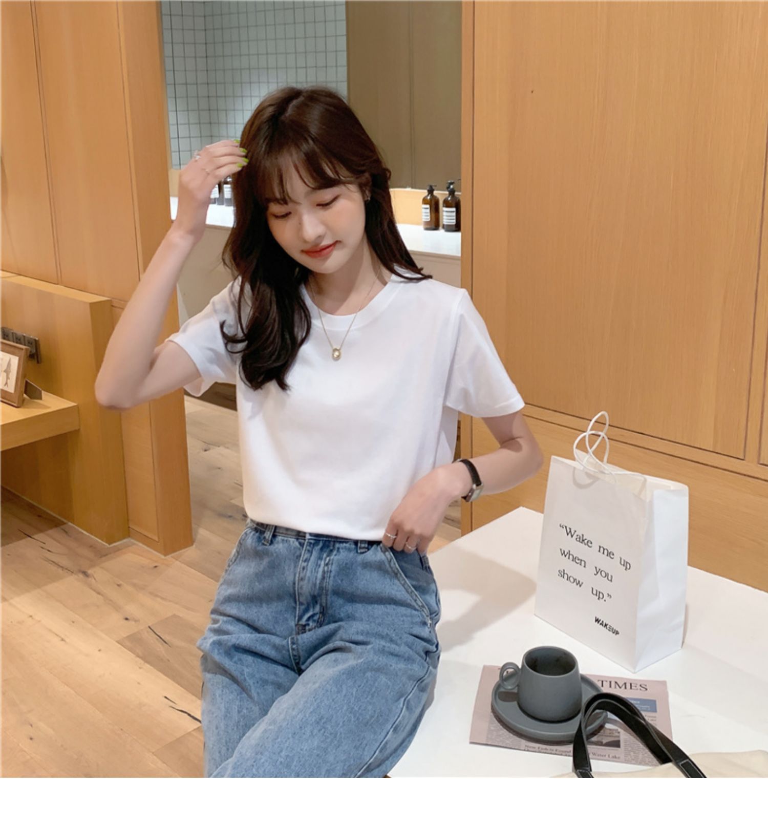 어깨 흰색 반팔 티셔츠 여성용 여름 얇은 느슨한 단색 기본 단순 슬리밍 코튼 탑스토어 가기