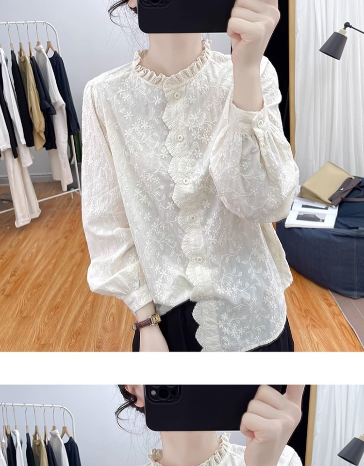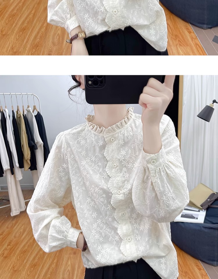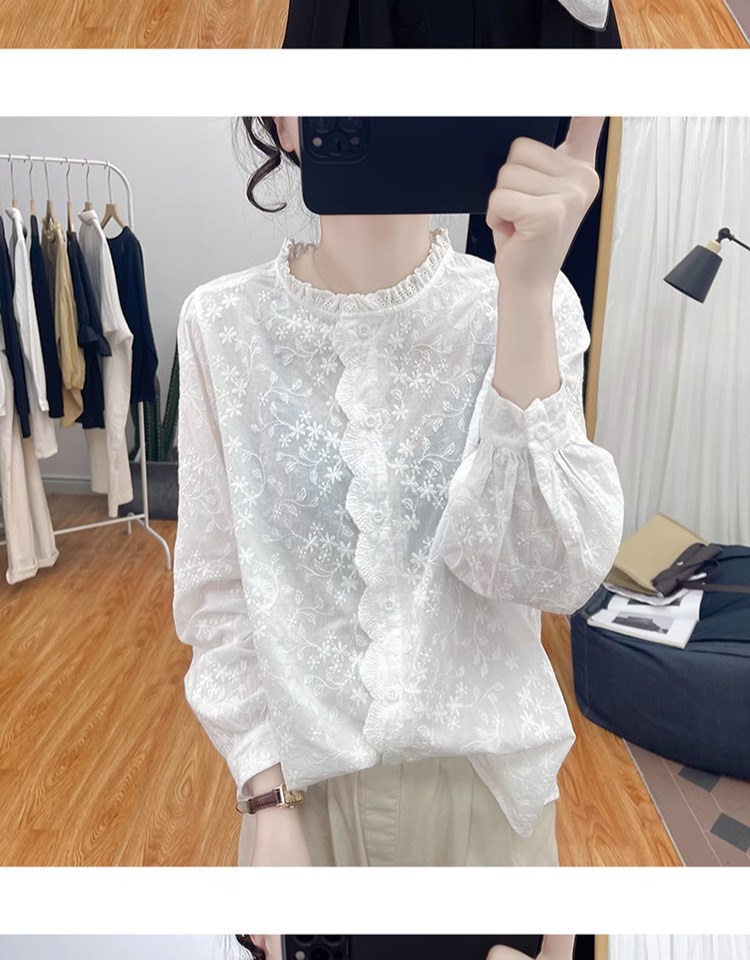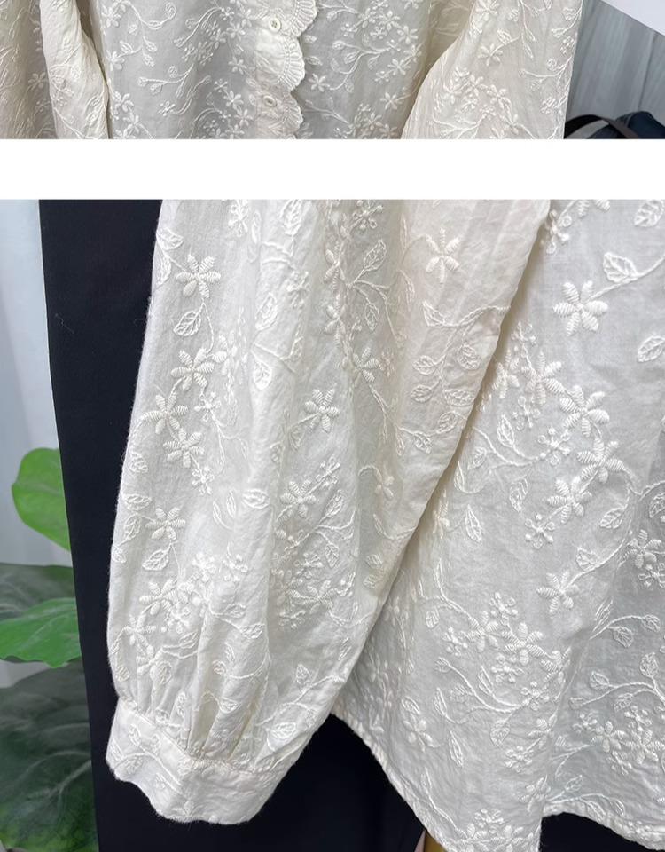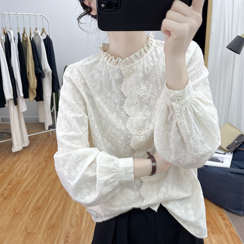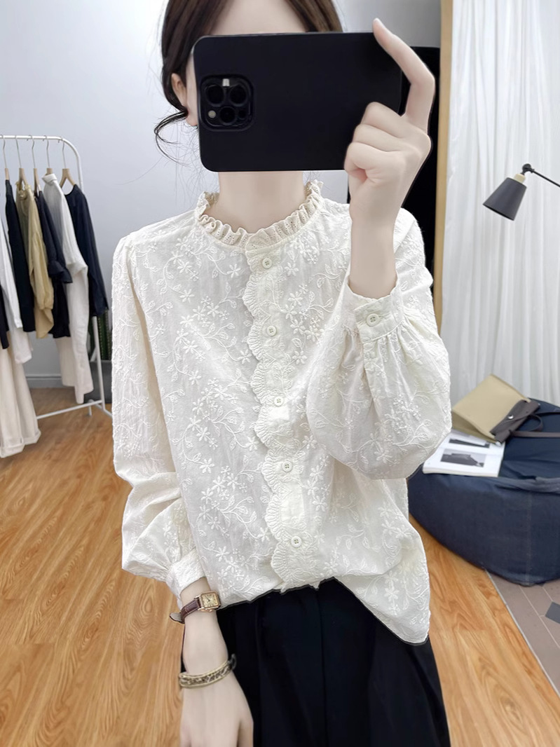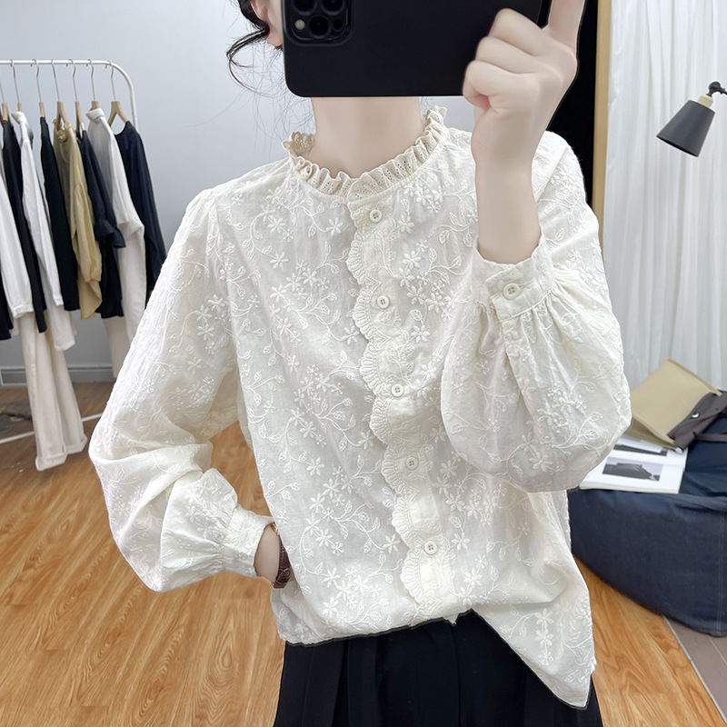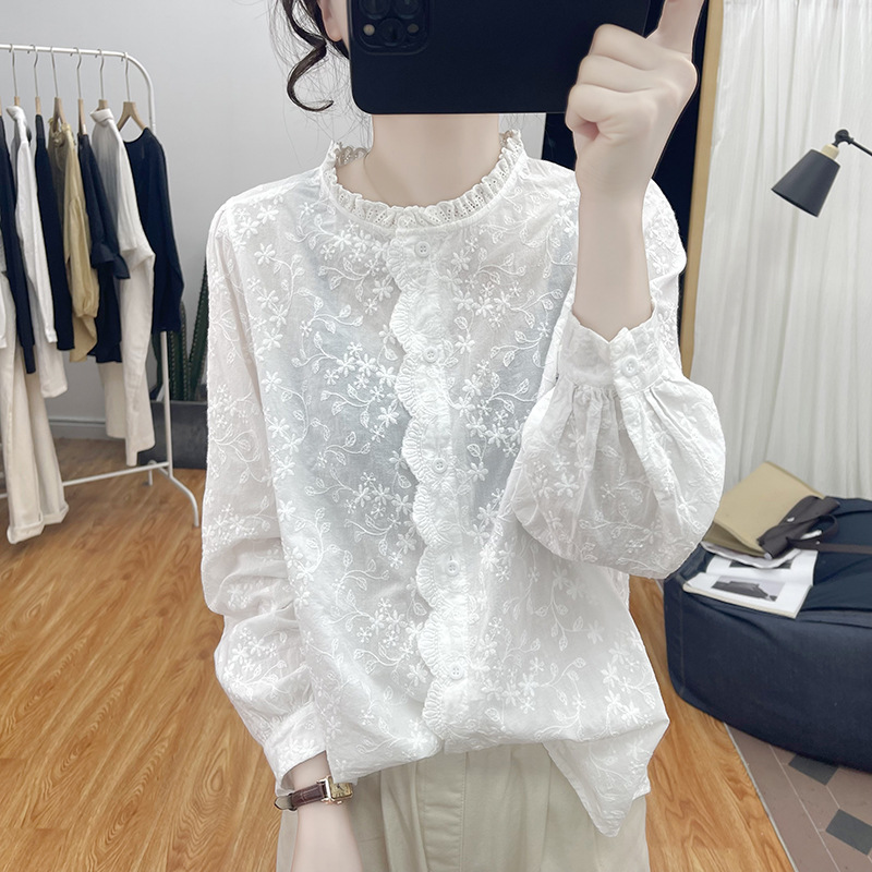 한국 스타일 곰팡이 레이스 칼라 코튼 레이스 자수 긴 소매 셔츠 여성의 2025 봄 셔츠 하이 퀄리티 탑