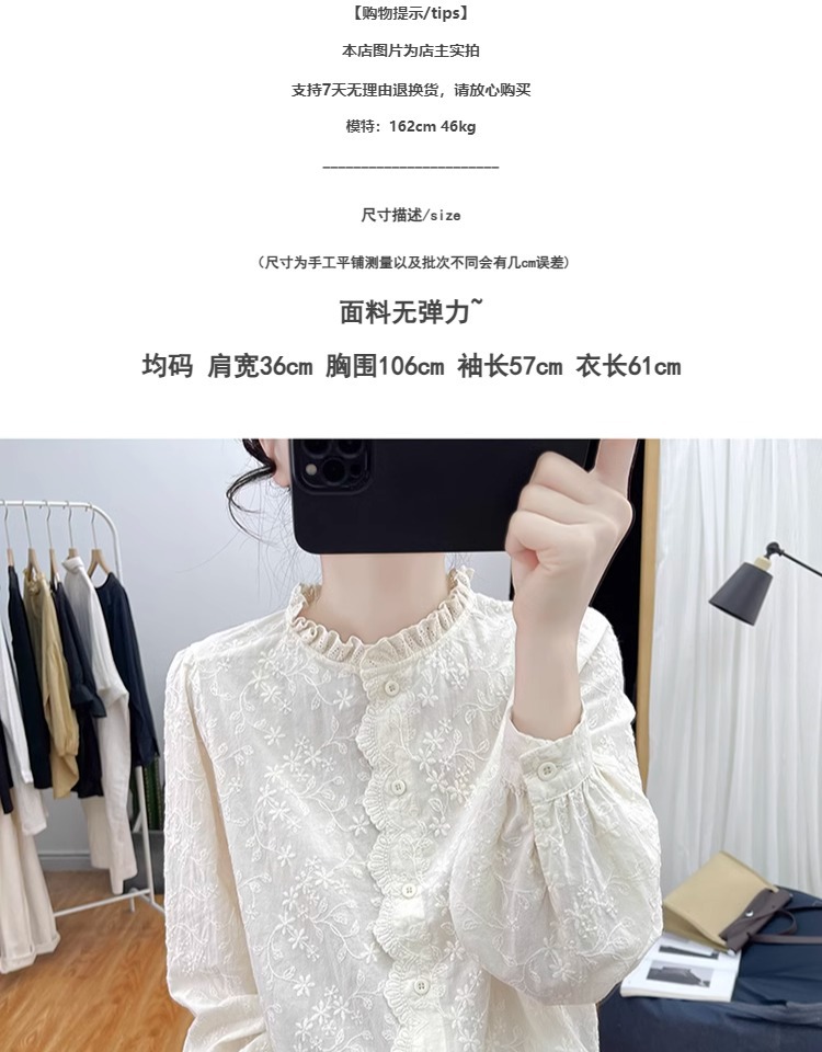 한국 스타일 곰팡이 레이스 칼라 코튼 레이스 자수 긴 소매 셔츠 여성의 2025 봄 셔츠 하이 퀄리티 탑스토어 가기