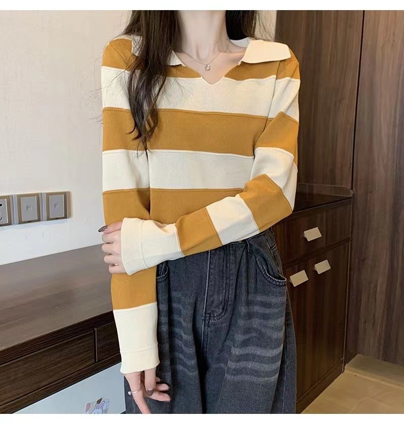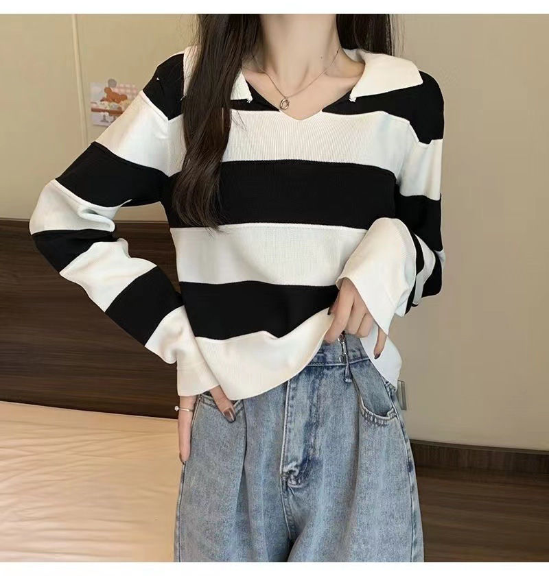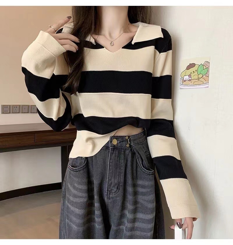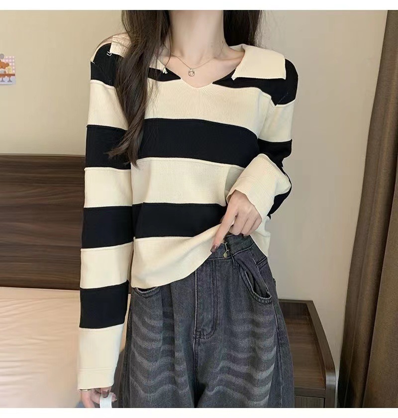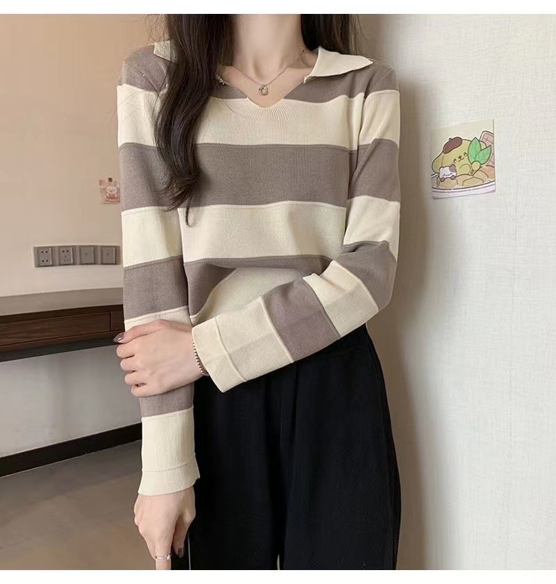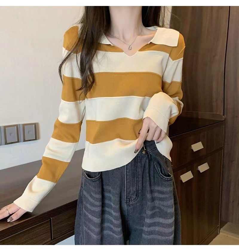 2025 가을과 겨울 국경 작은 최고 여성 달콤한 스타일 옷깃 줄무늬 스웨터 느슨한 긴팔베이스 셔츠스토어 가기