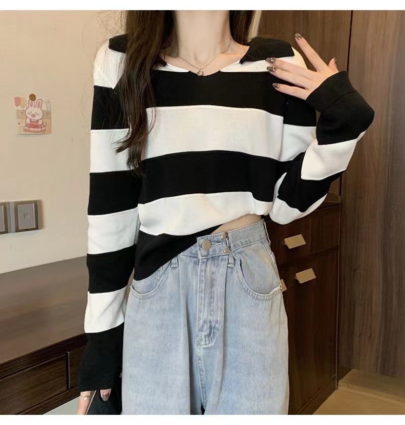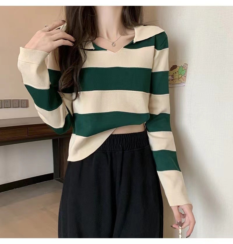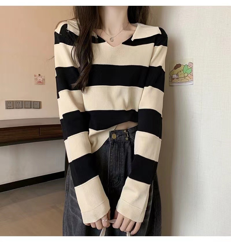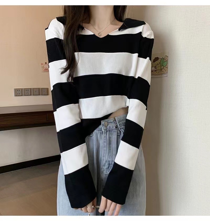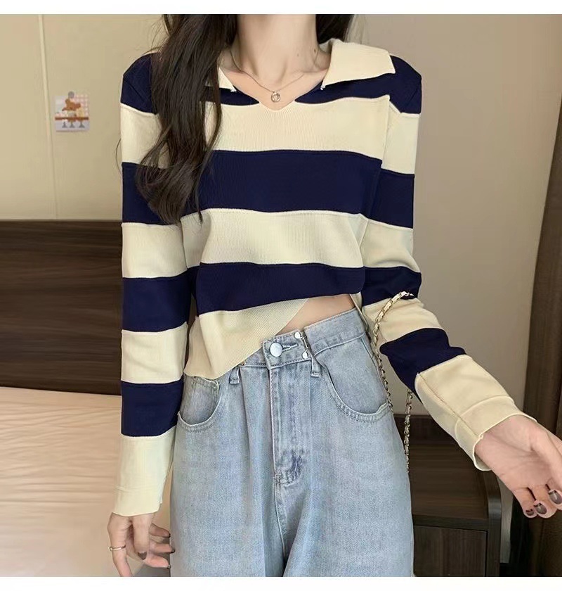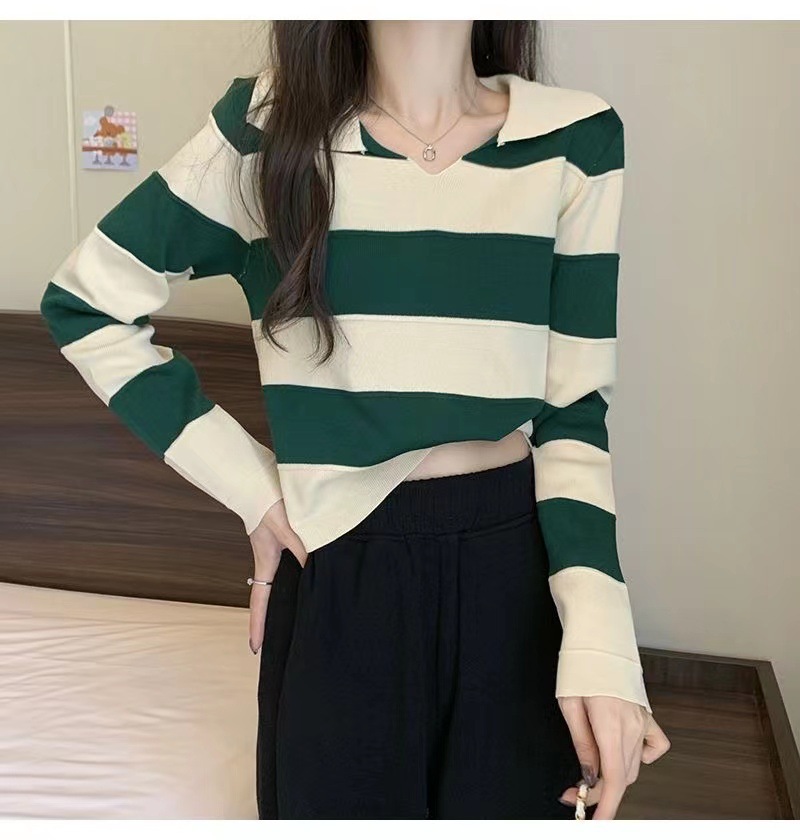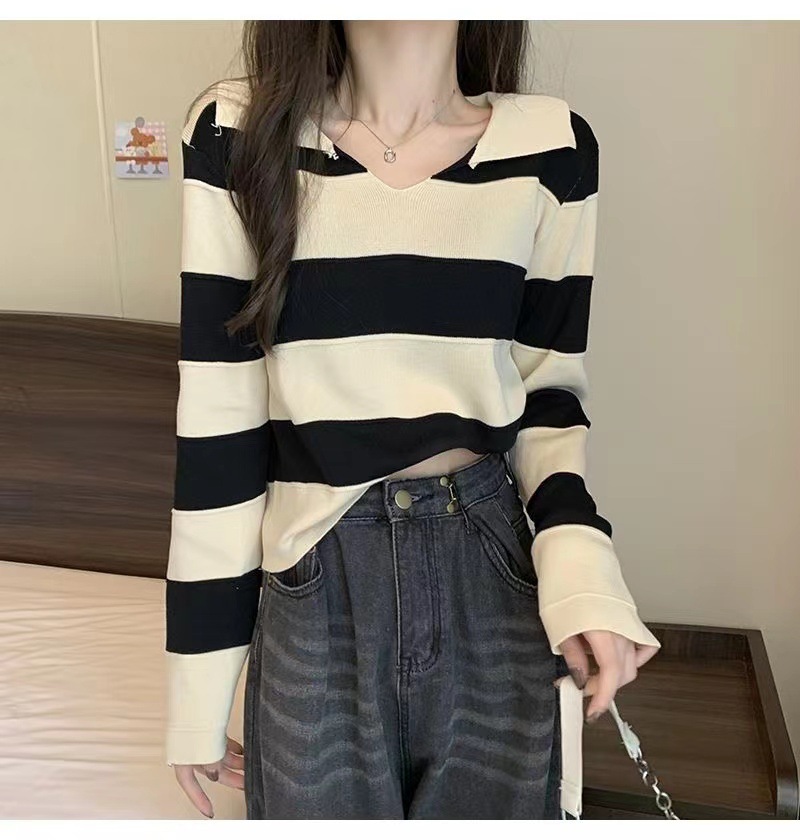2025 가을과 겨울 국경 작은 최고 여성 달콤한 스타일 옷깃 줄무늬 스웨터 느슨한 긴팔베이스 셔츠스토어 가기