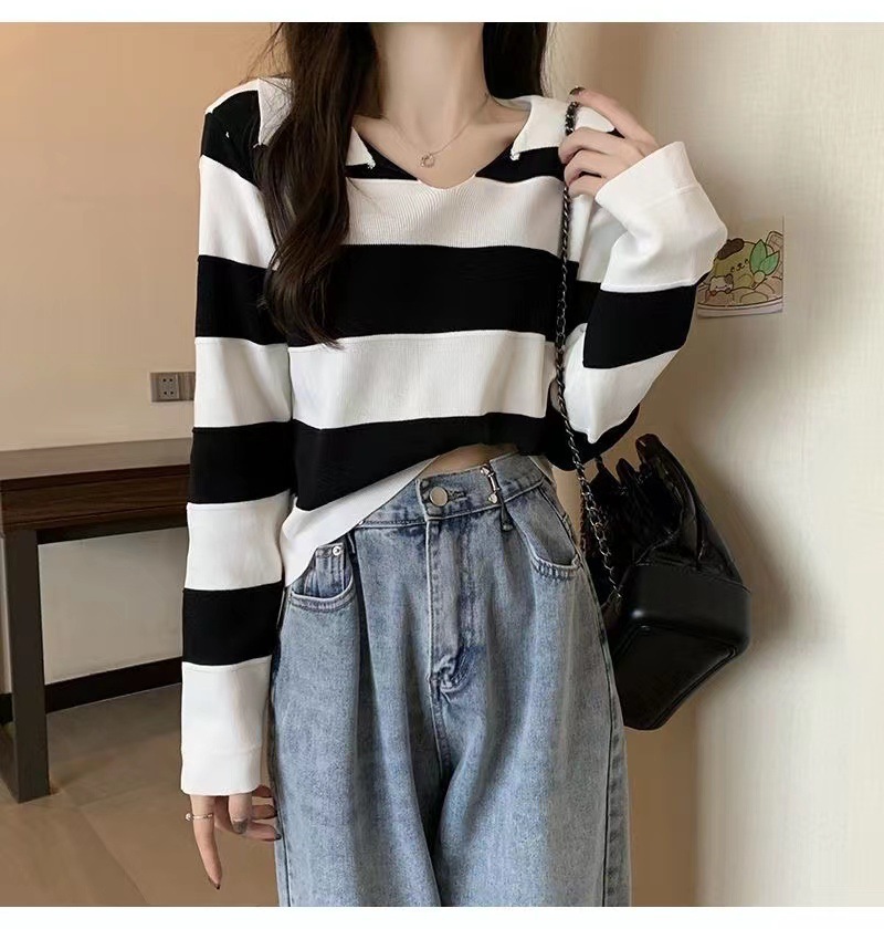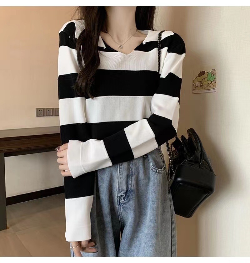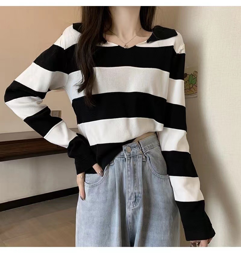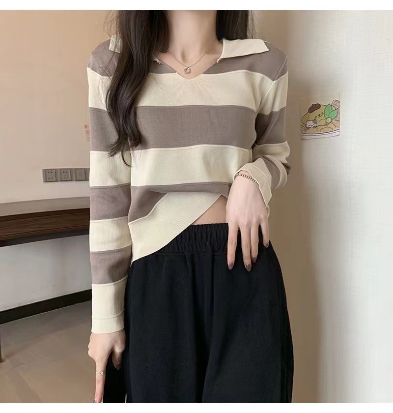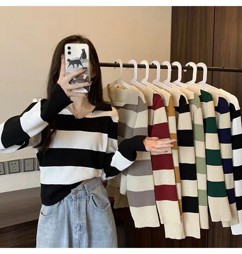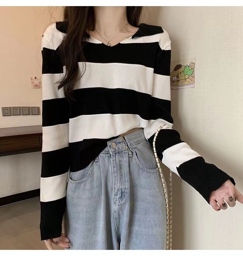 2025 가을과 겨울 국경 작은 최고 여성 달콤한 스타일 옷깃 줄무늬 스웨터 느슨한 긴팔베이스 셔츠스토어 가기