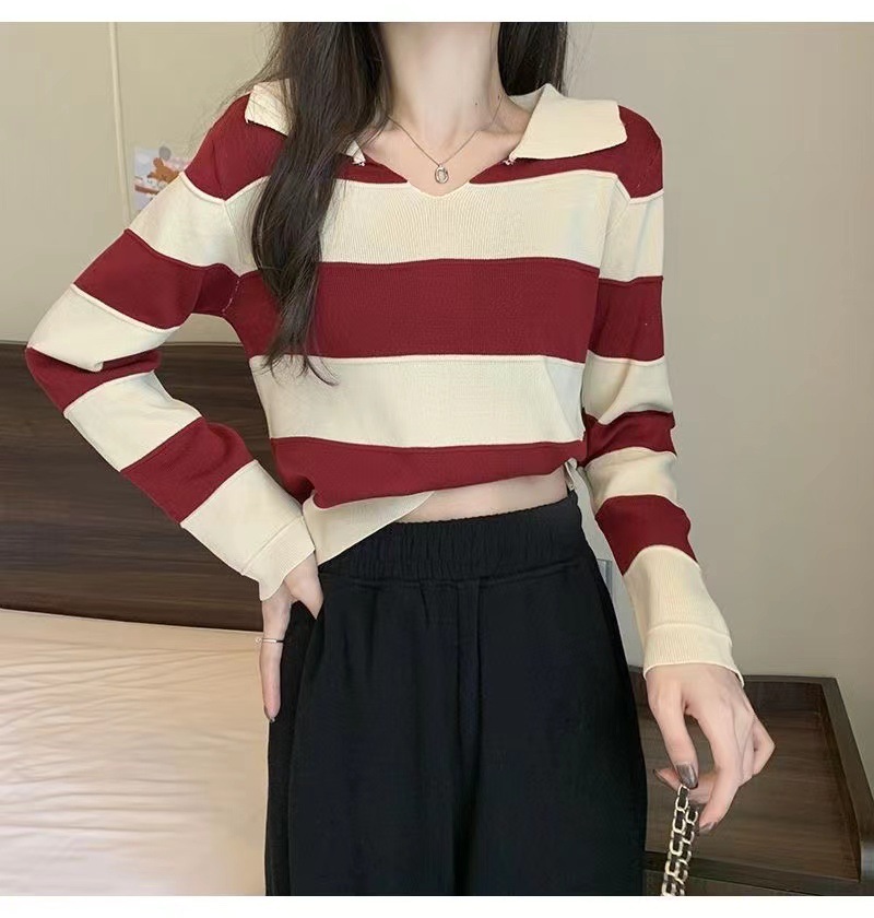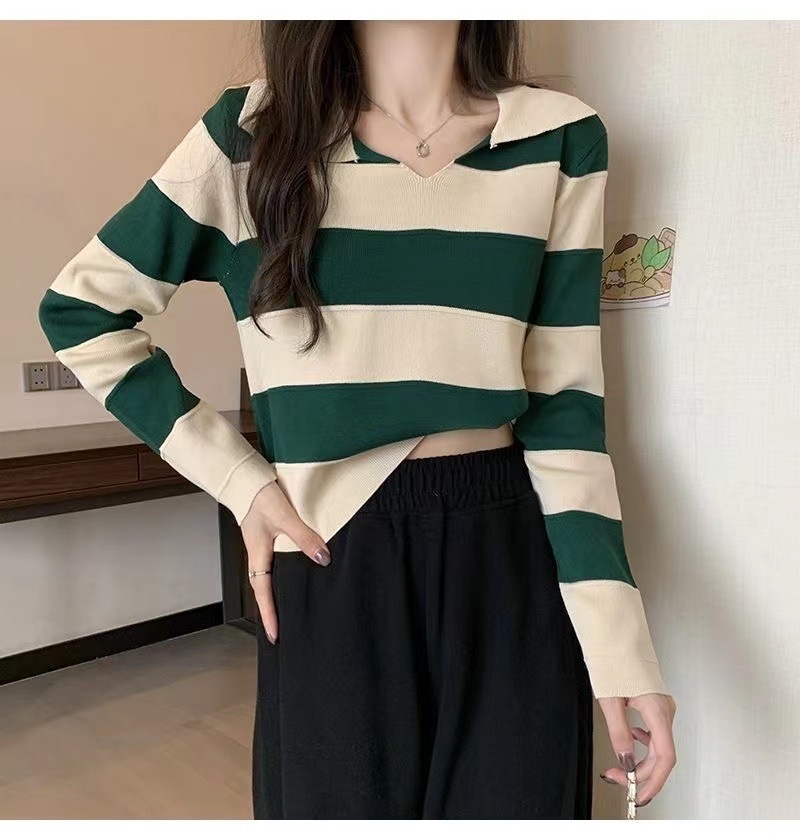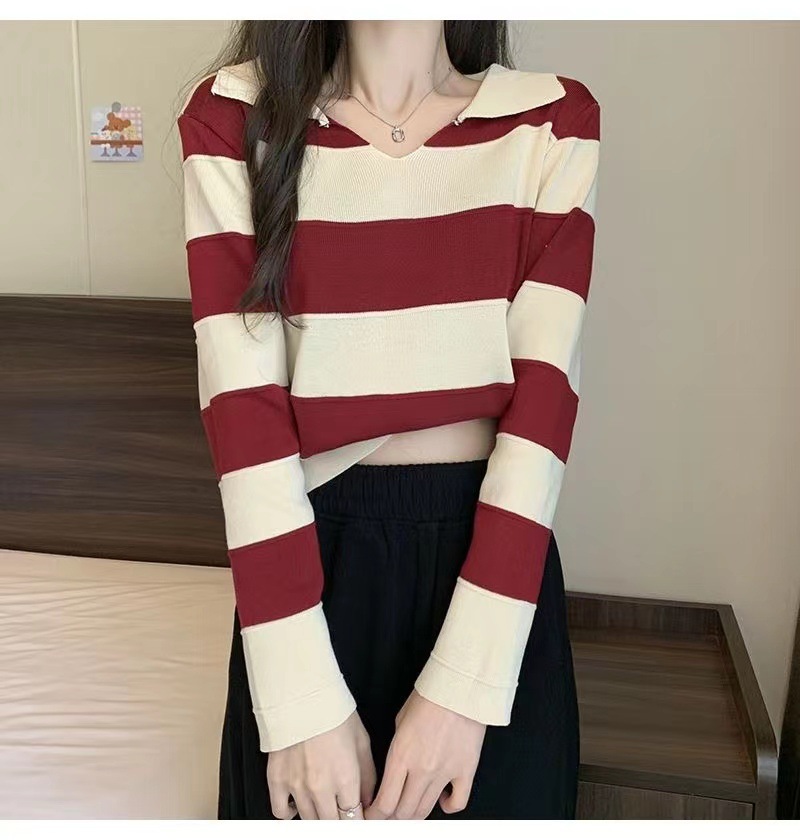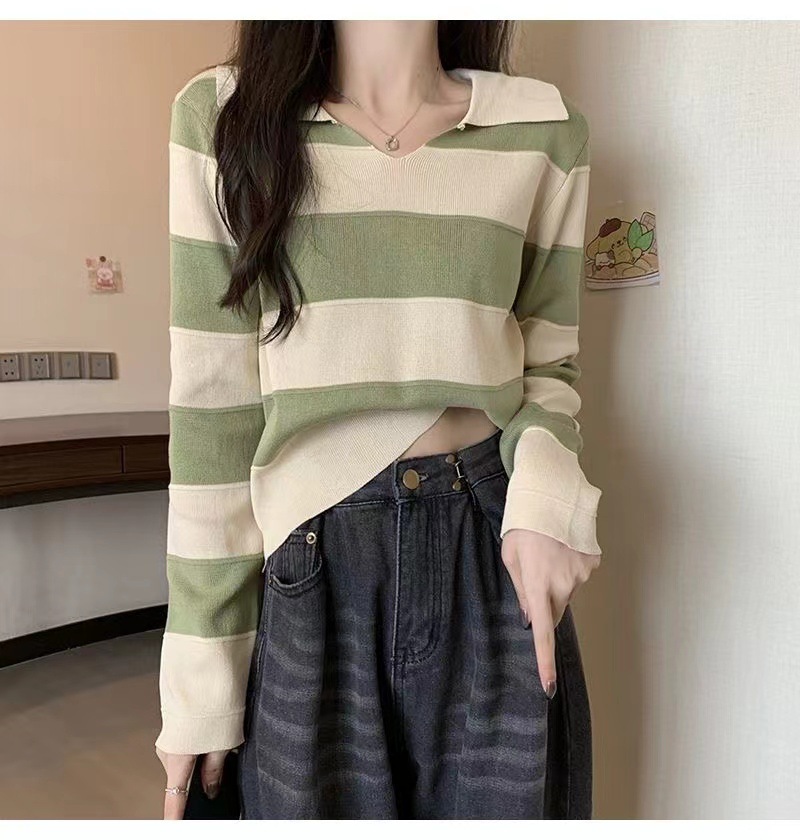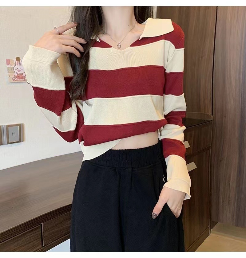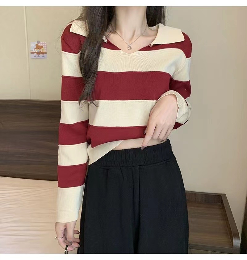 2025 가을과 겨울 국경 작은 최고 여성 달콤한 스타일 옷깃 줄무늬 스웨터 느슨한 긴팔베이스 셔츠