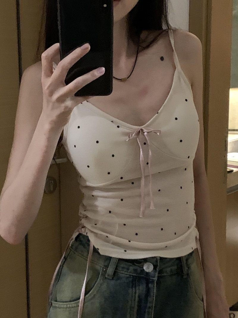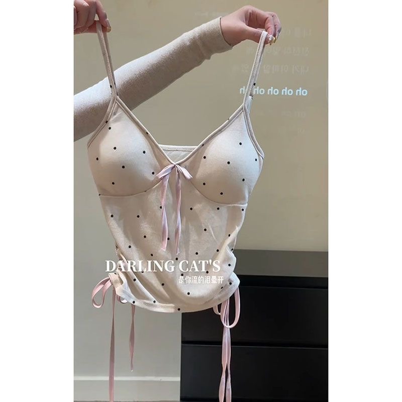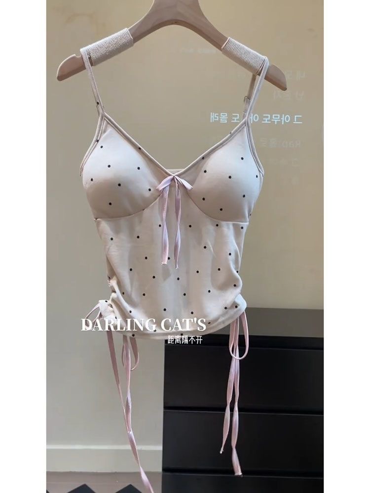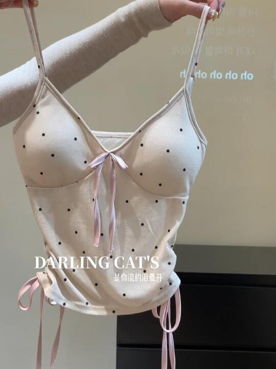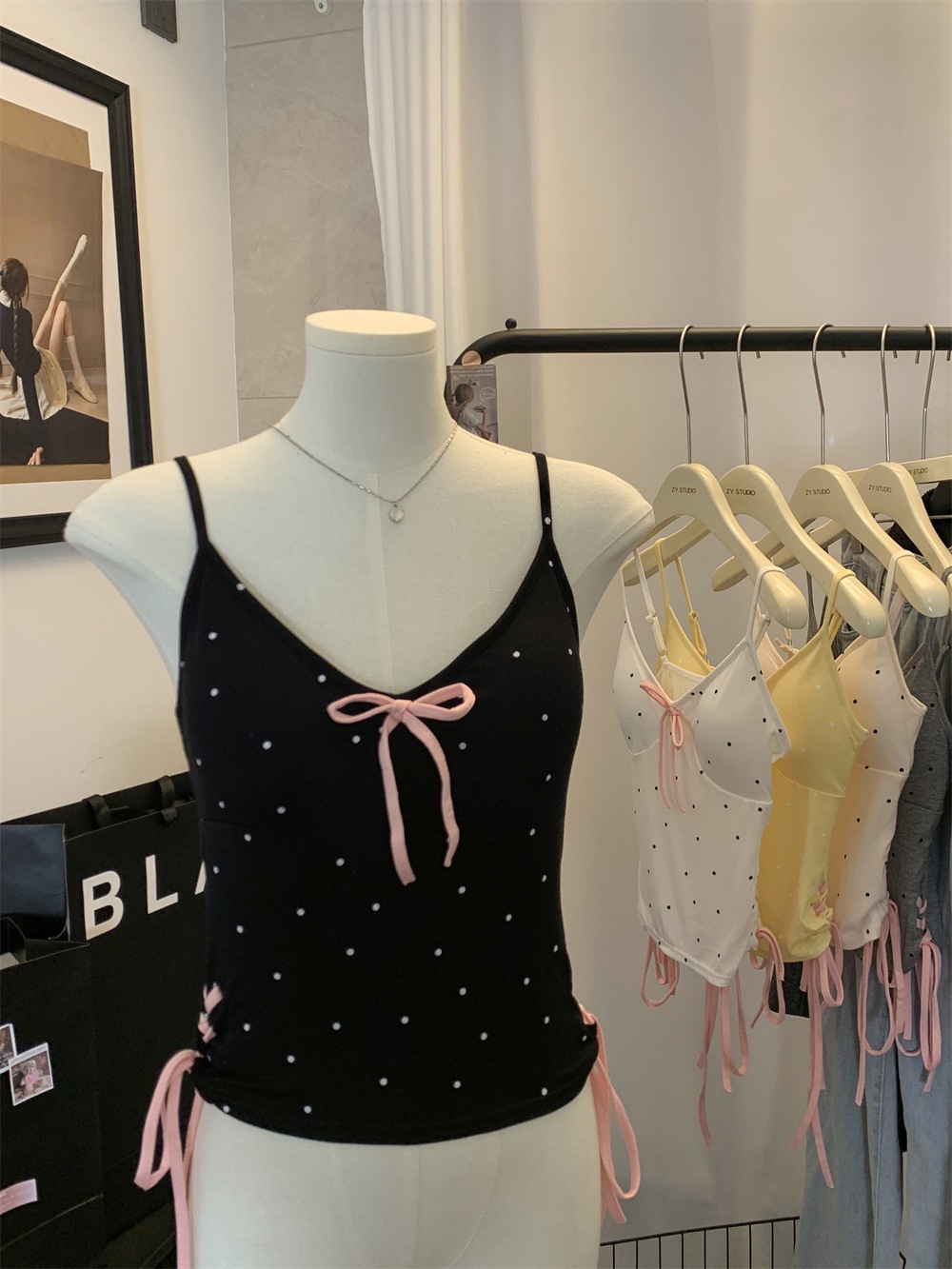 순수한 욕망 스타일 웨이브 도트 보우 카미솔 여성의 여름 새로운 스파이스 걸스 주름 스트랩 슬리밍 쇼트 탑 여성 탑스토어 가기