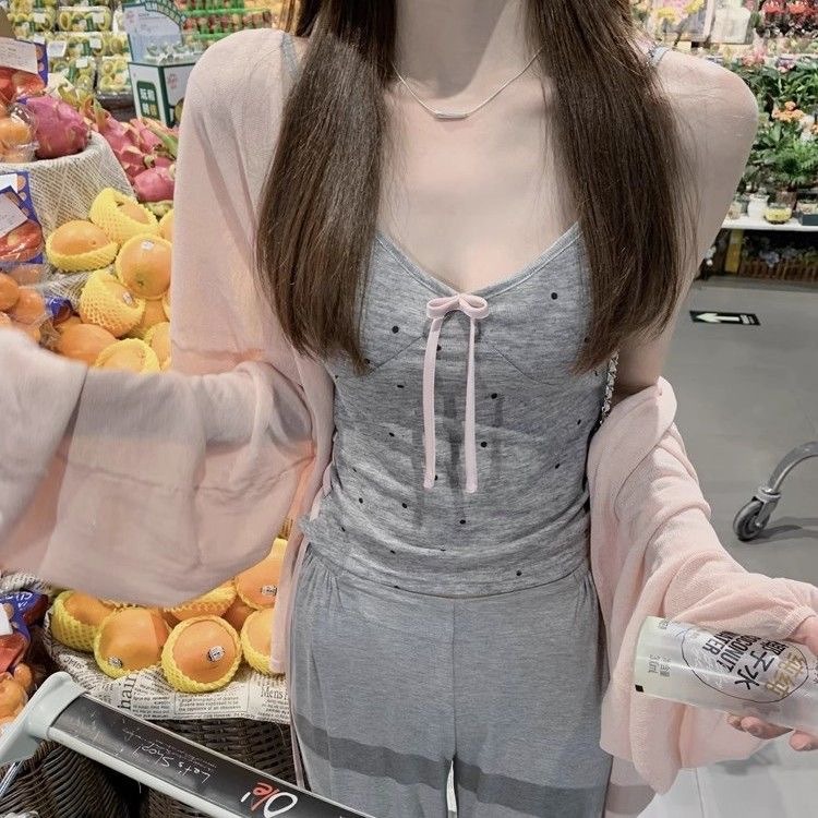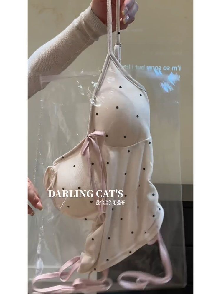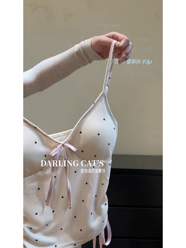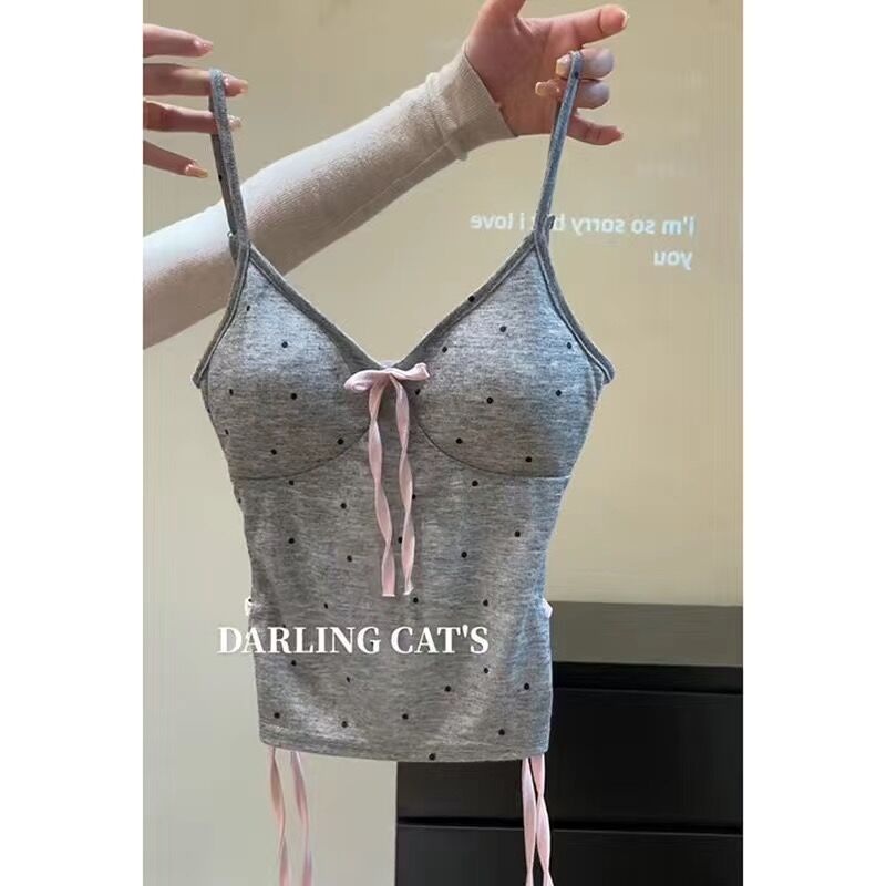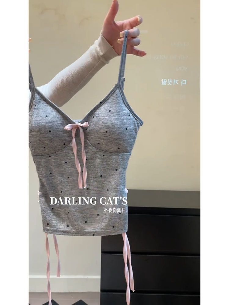 순수한 욕망 스타일 웨이브 도트 보우 카미솔 여성의 여름 새로운 스파이스 걸스 주름 스트랩 슬리밍 쇼트 탑 여성 탑스토어 가기
