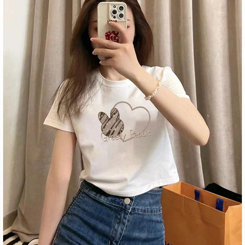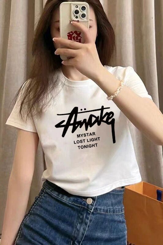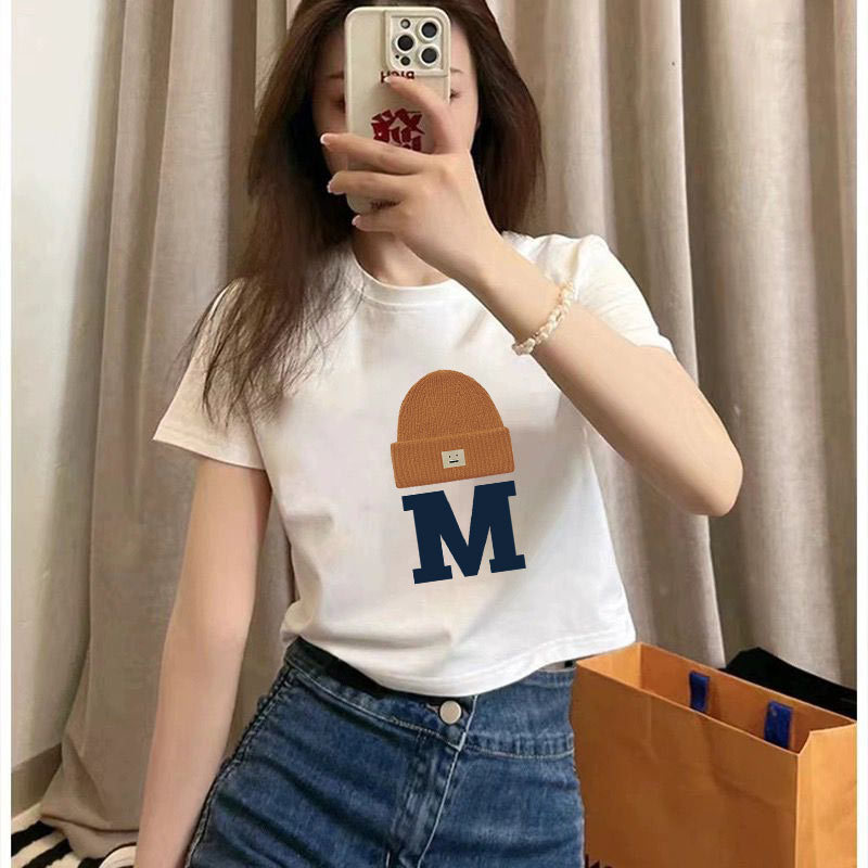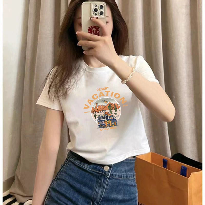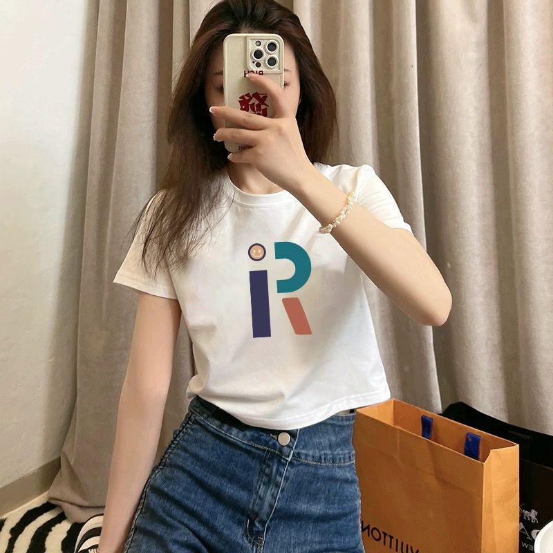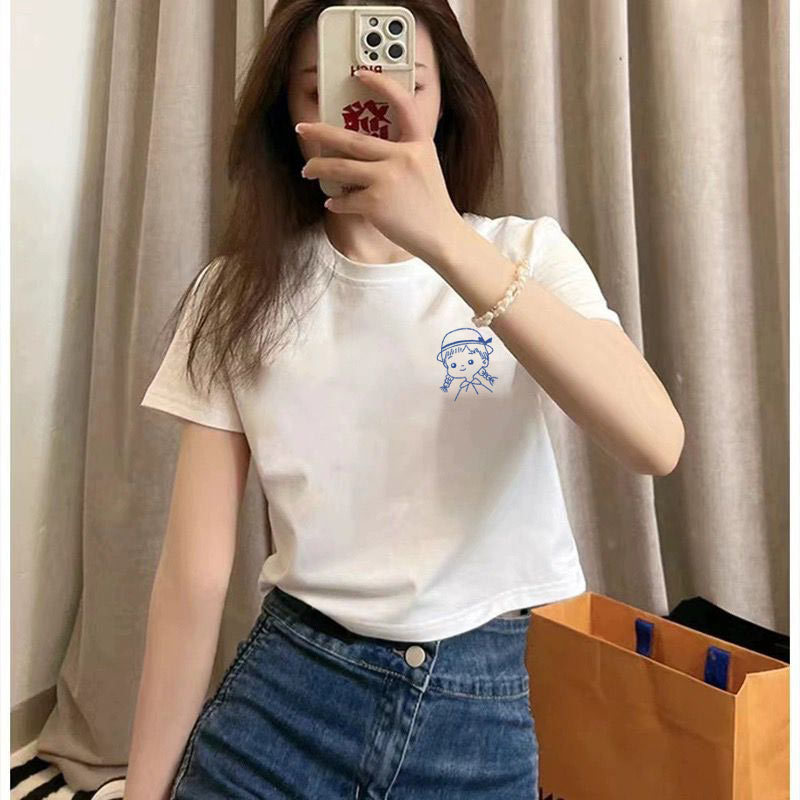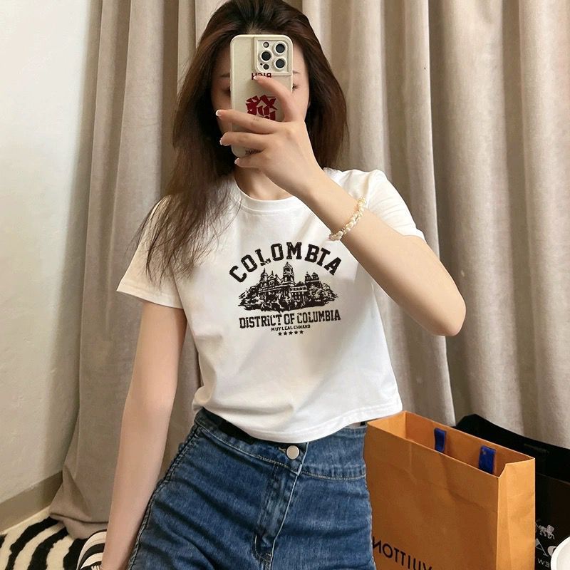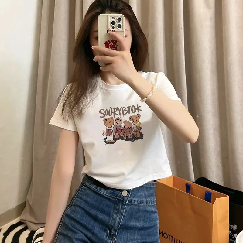 여름 코튼 새로운 패션 스파이스 소녀 짧은 셔츠 슬림 핏 배꼽 노출 된 탑 코튼 화이트 반팔 티셔츠 여성용스토어 가기