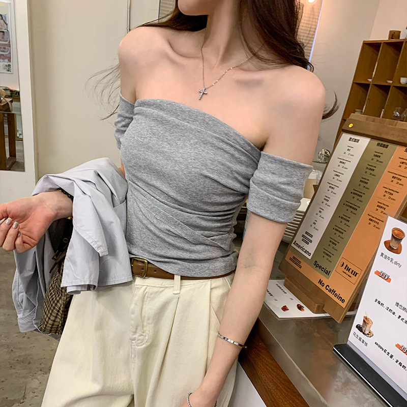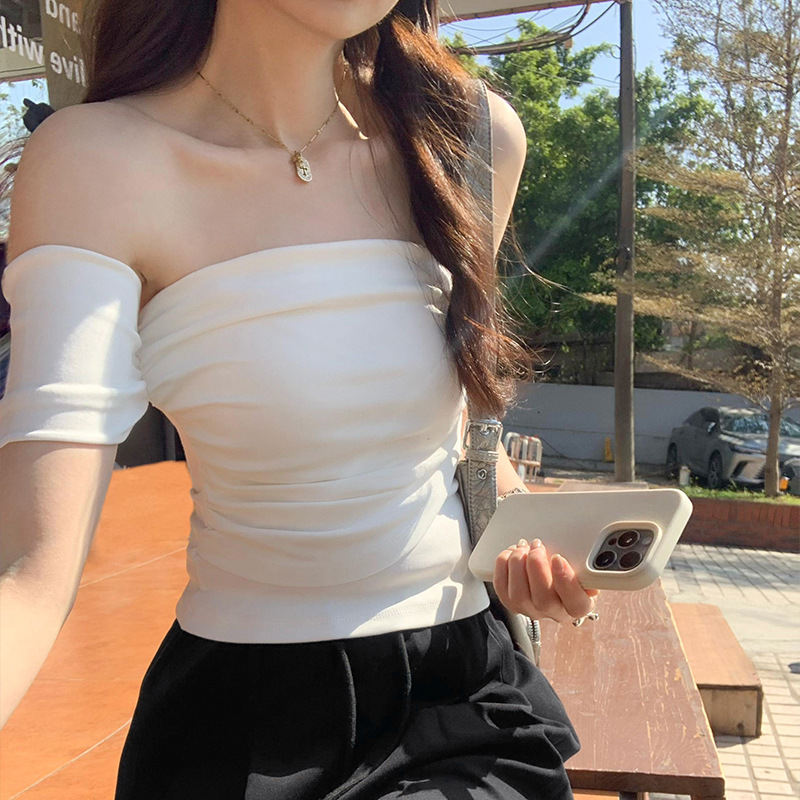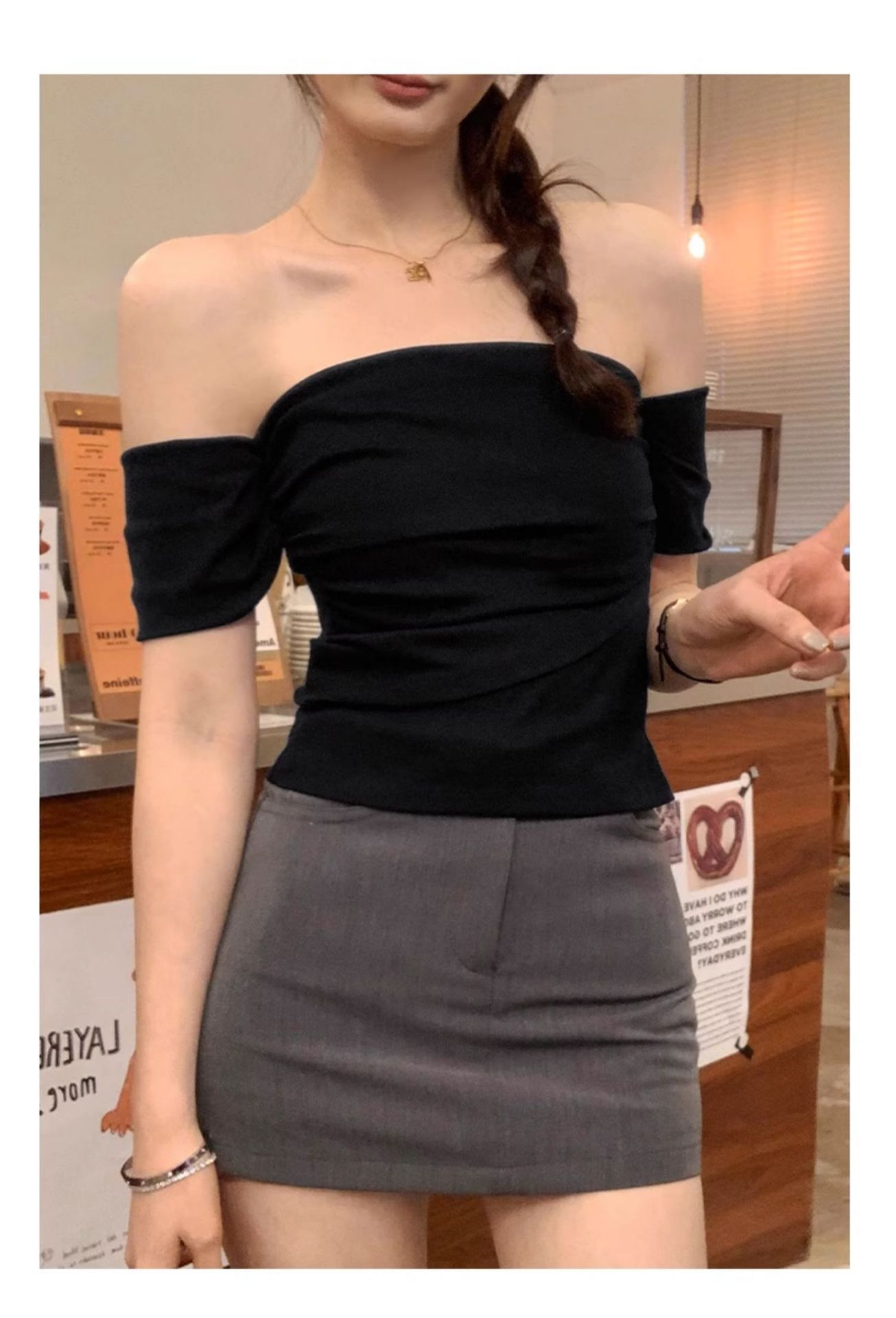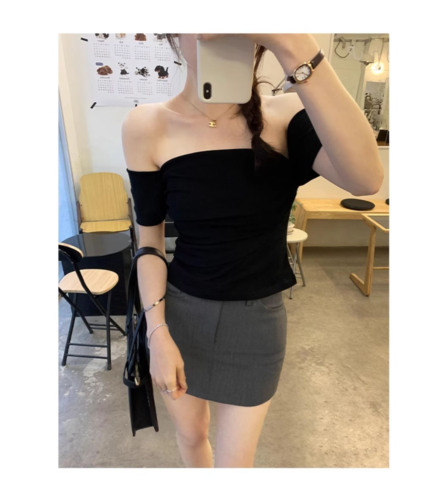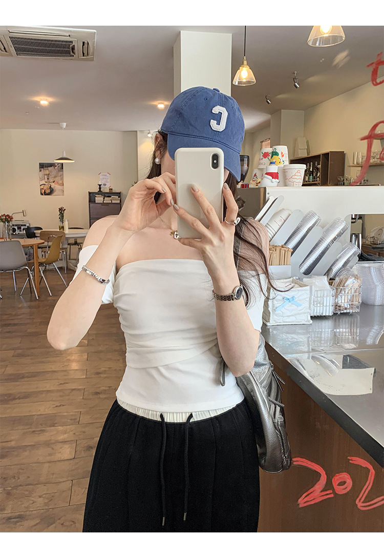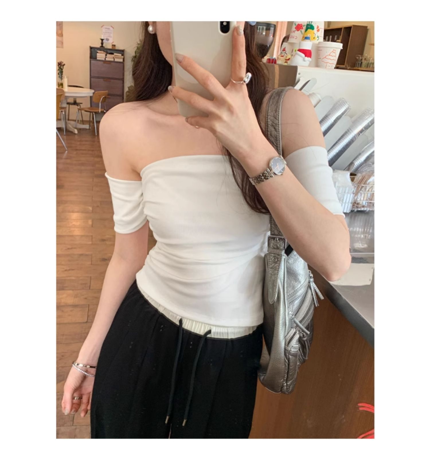 한국 스타일 순수 섹시한 스파이스 걸스 스트랩리스 반팔 티셔츠 여성 2025 년 여름 새 어깨 슬림 탑