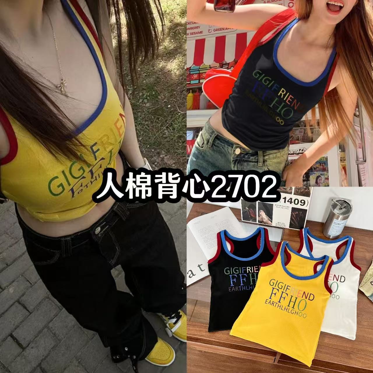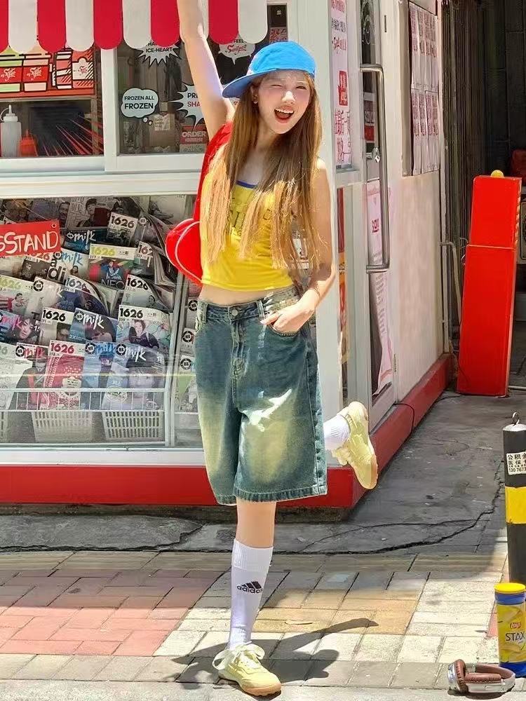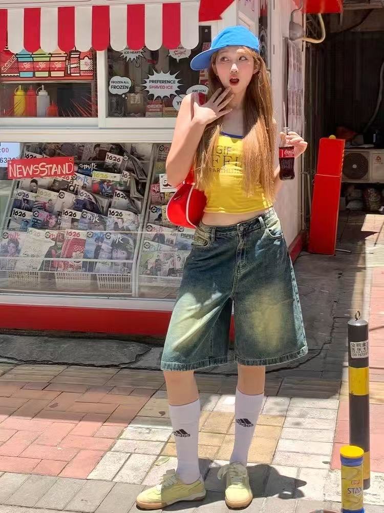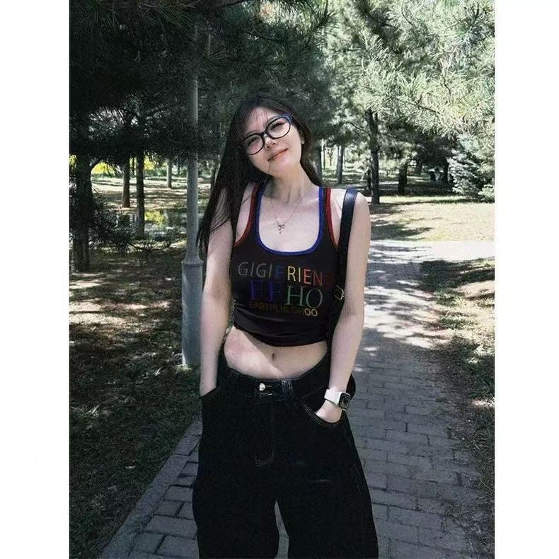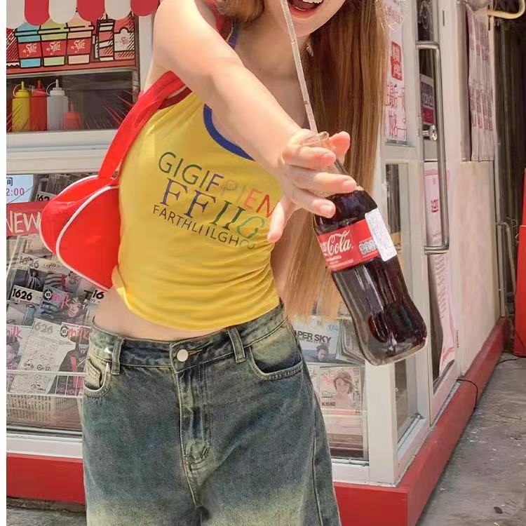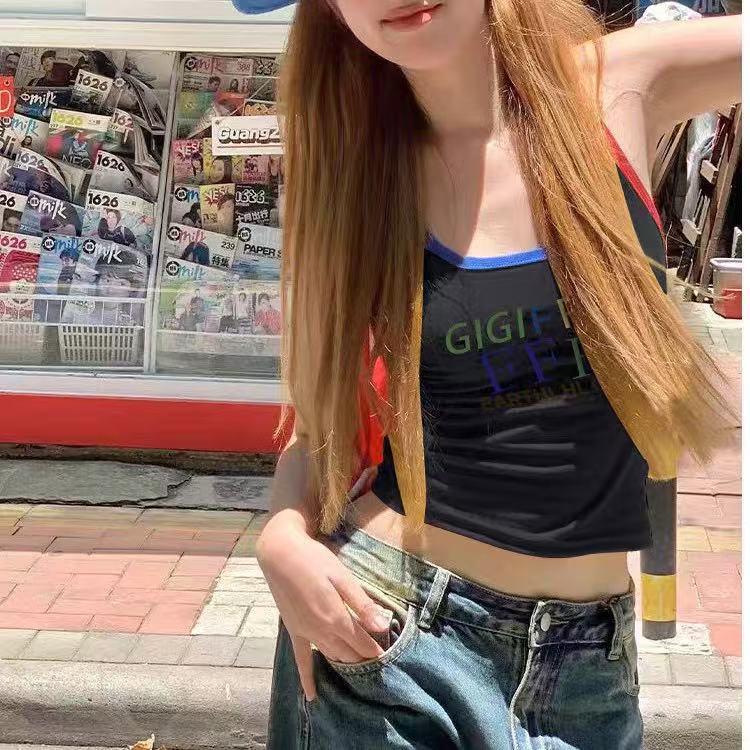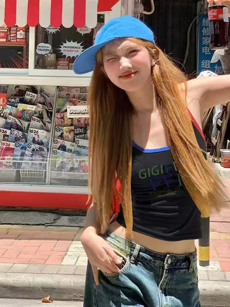 미국 스트리트 스파이스 소녀 레트로 작은 슬링 여성 여름 가슴 패드 레터 인쇄 슬림 핏 슬리밍 반팔 조끼 탑스토어 가기