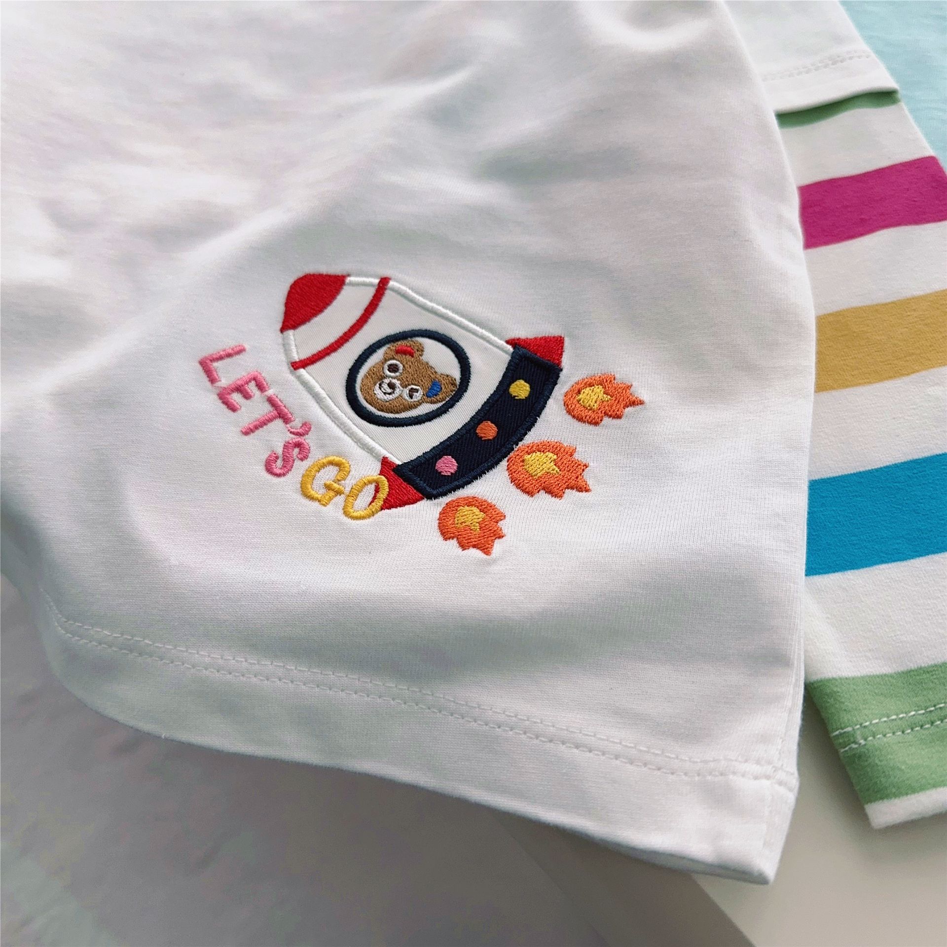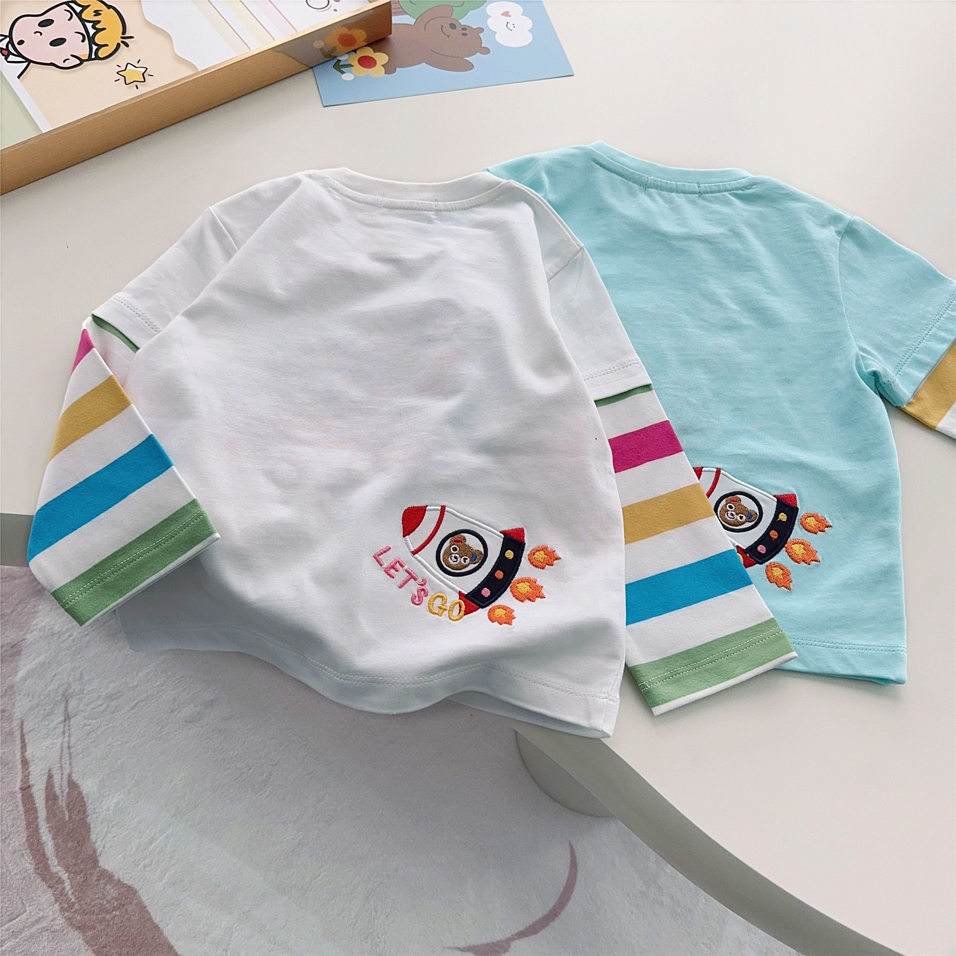 재고 머리 25 봄 새로운 소년과 소녀 아기 만화 자수 가짜 두 공간 느린 긴 소매 티셔츠 도매 7008스토어 가기