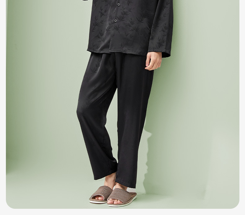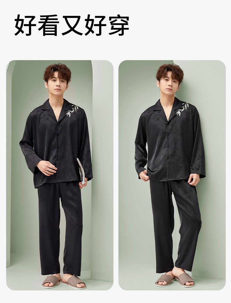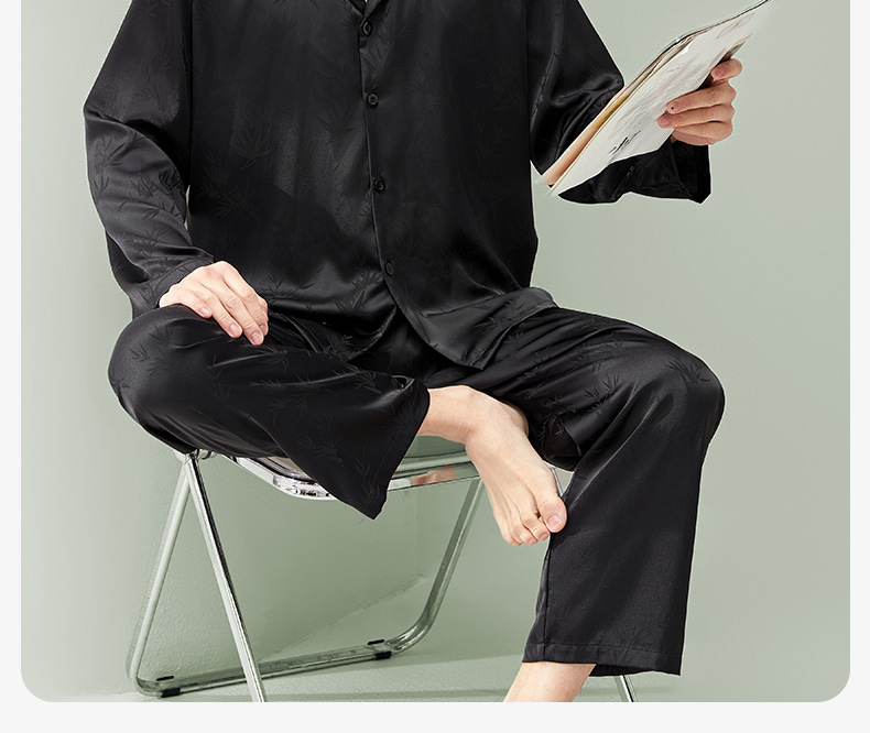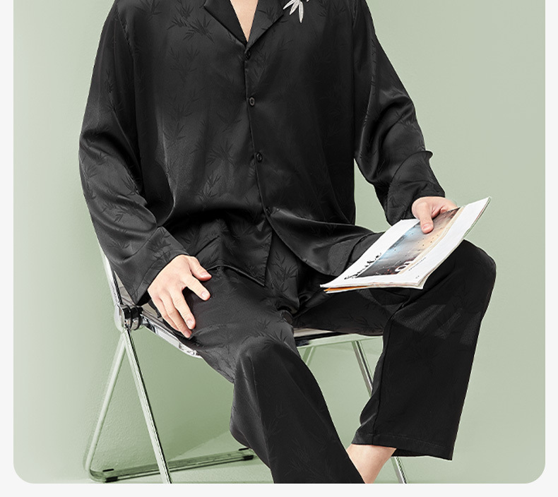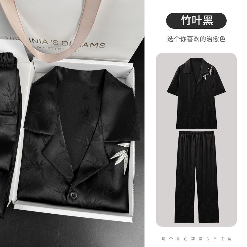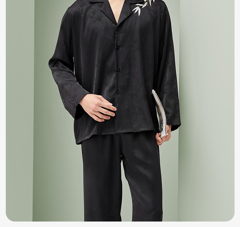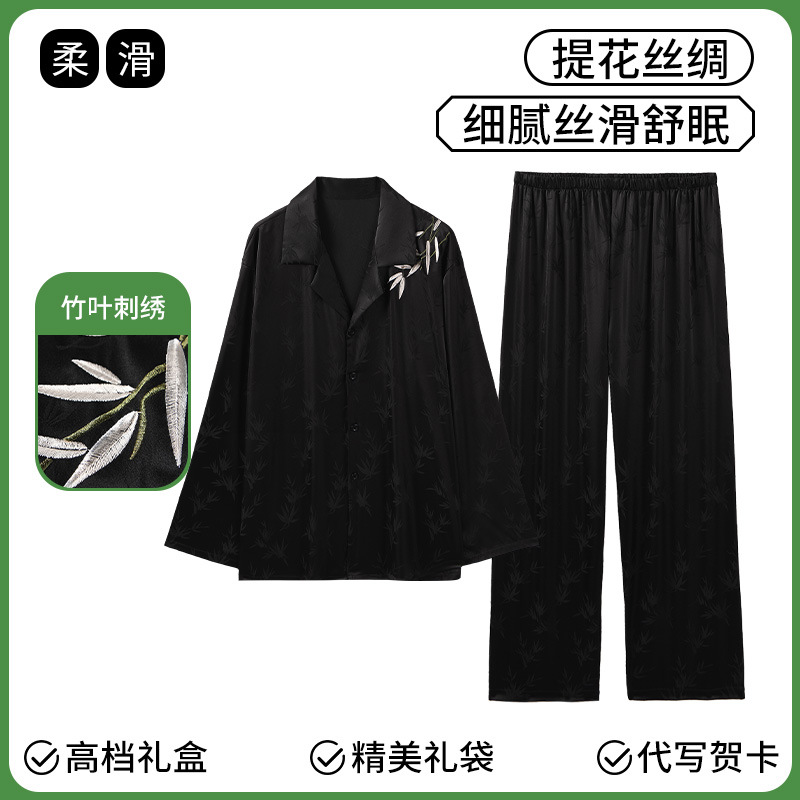 【남성전용】블랙 아이스 실크 잠옷 세트, 대나무 잎 자카드 실크 홈웨어, 남성용 고급스러운 디자인, 외부에서 착용 가능
