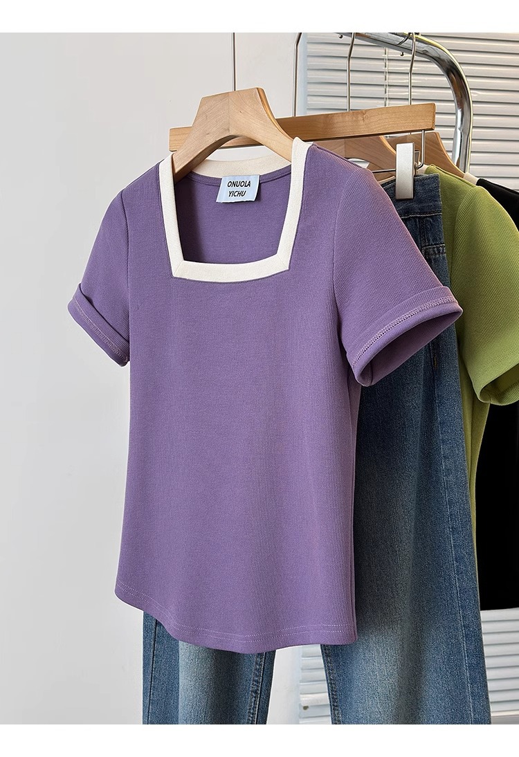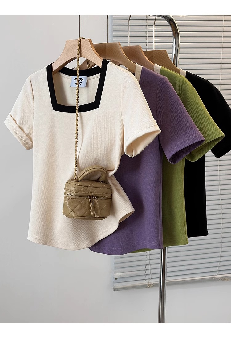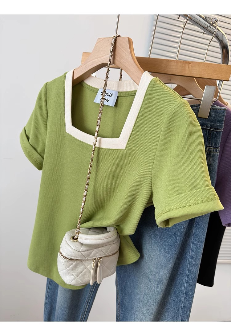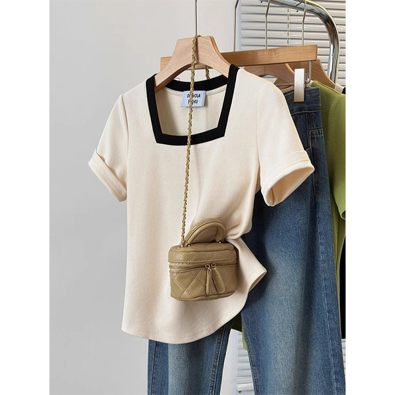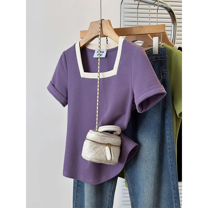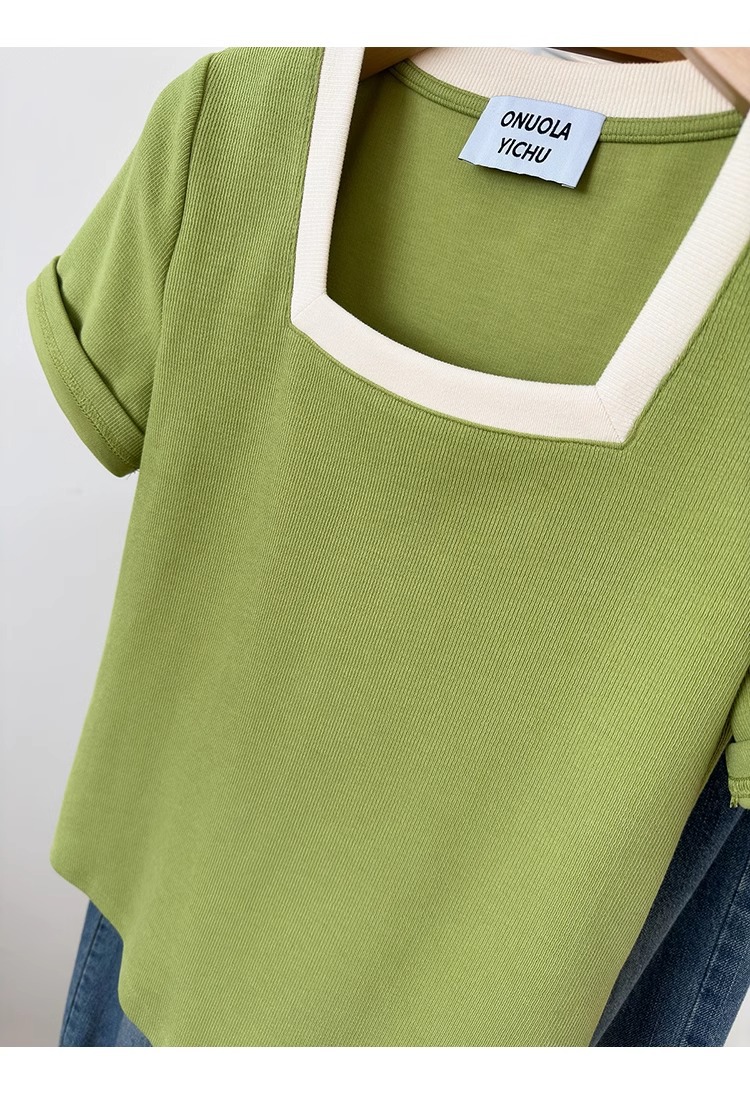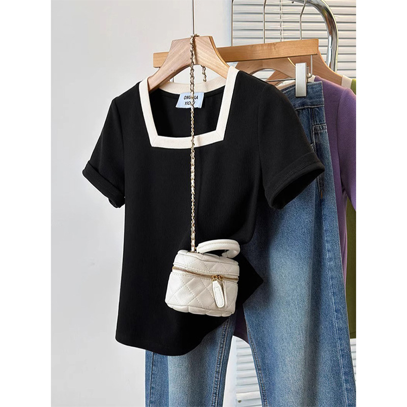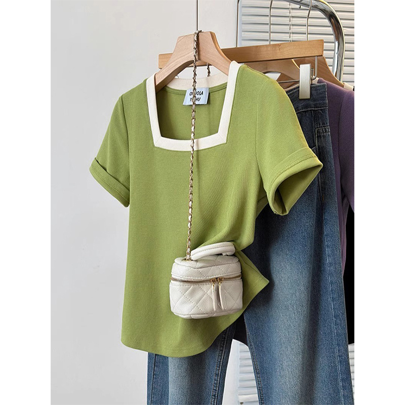 플러스 사이즈 통통녀 여성 패션 외국 스타일 스퀘어 칼라 반팔 티셔츠 여름 어깨 슬리밍면 티셔츠 재킷 200kg스토어 가기